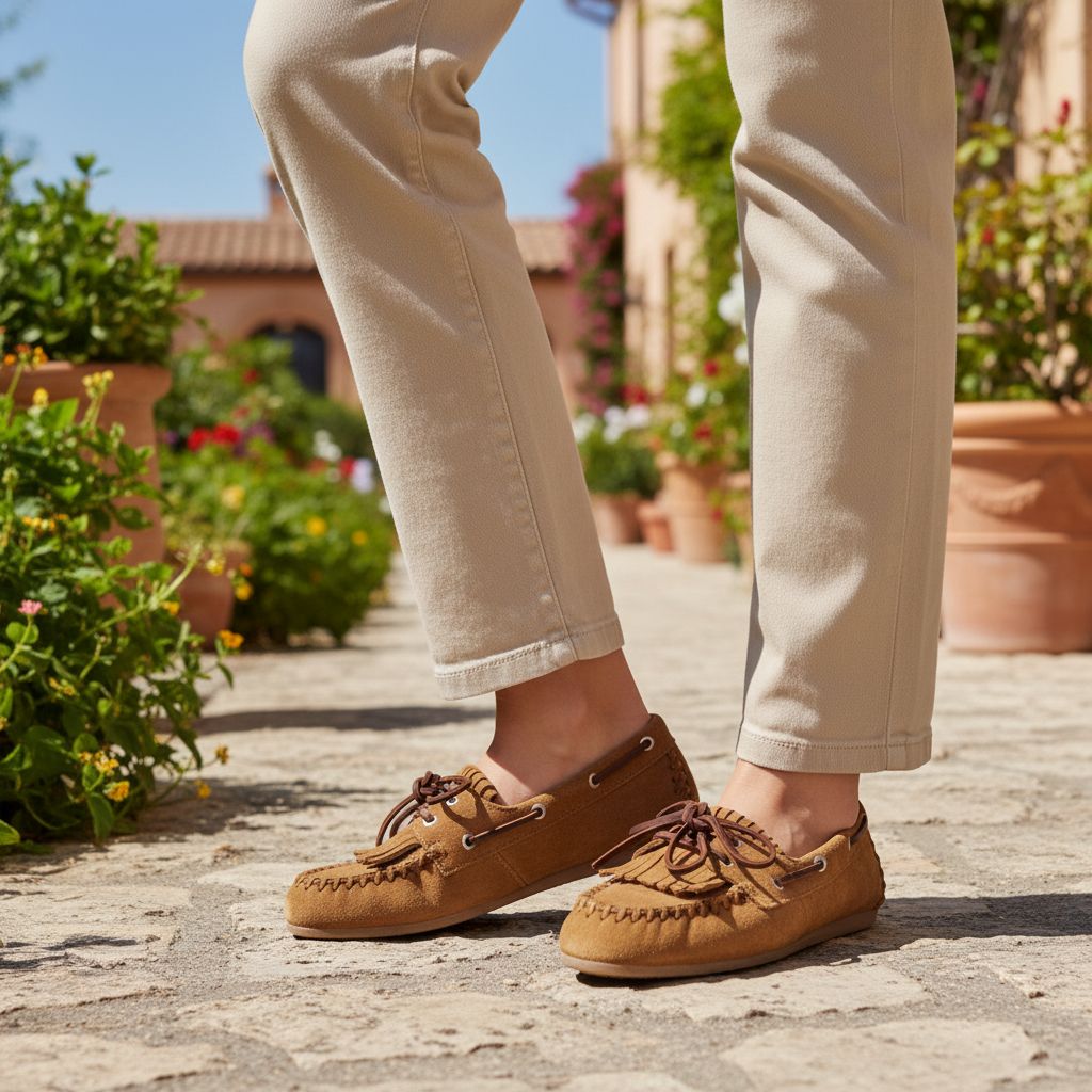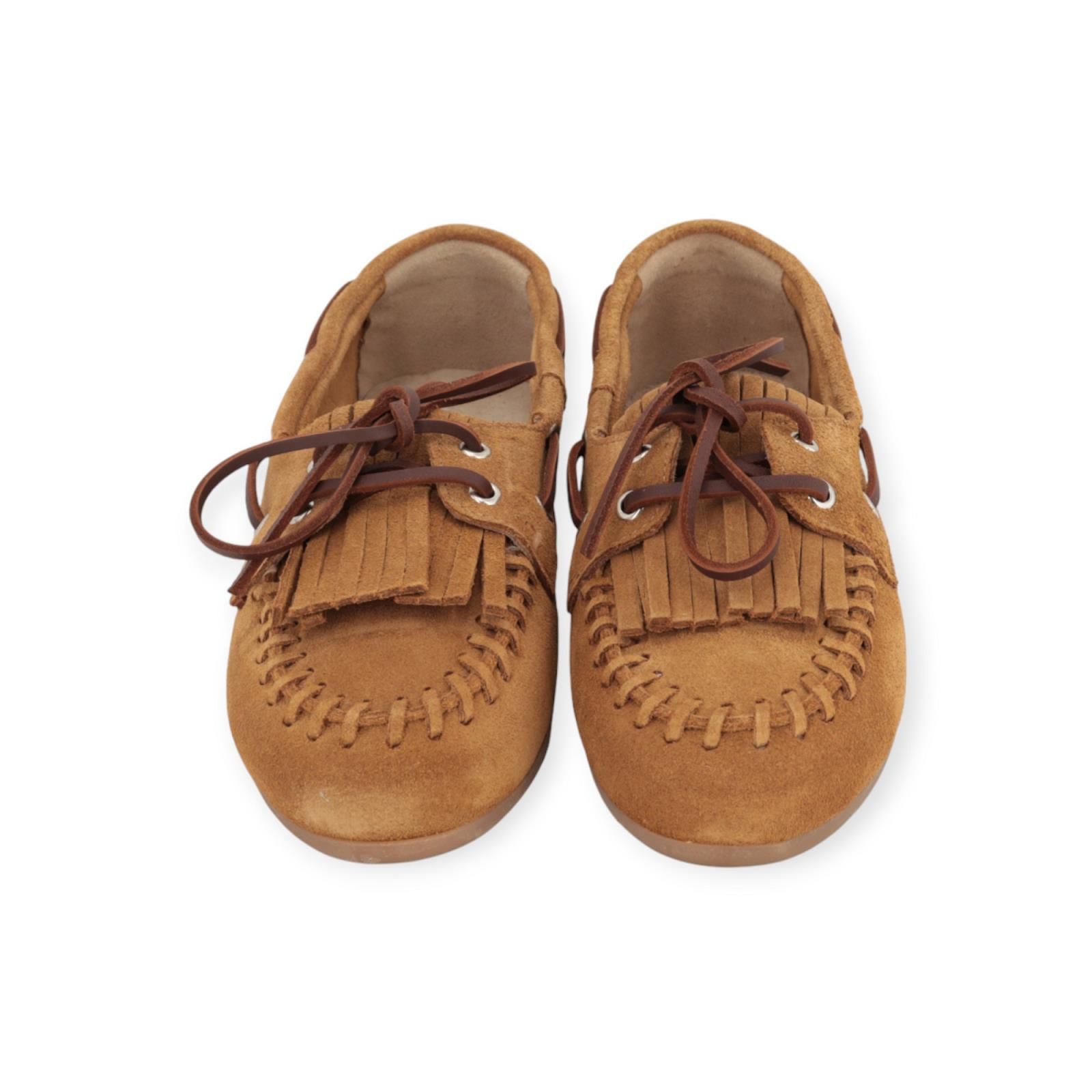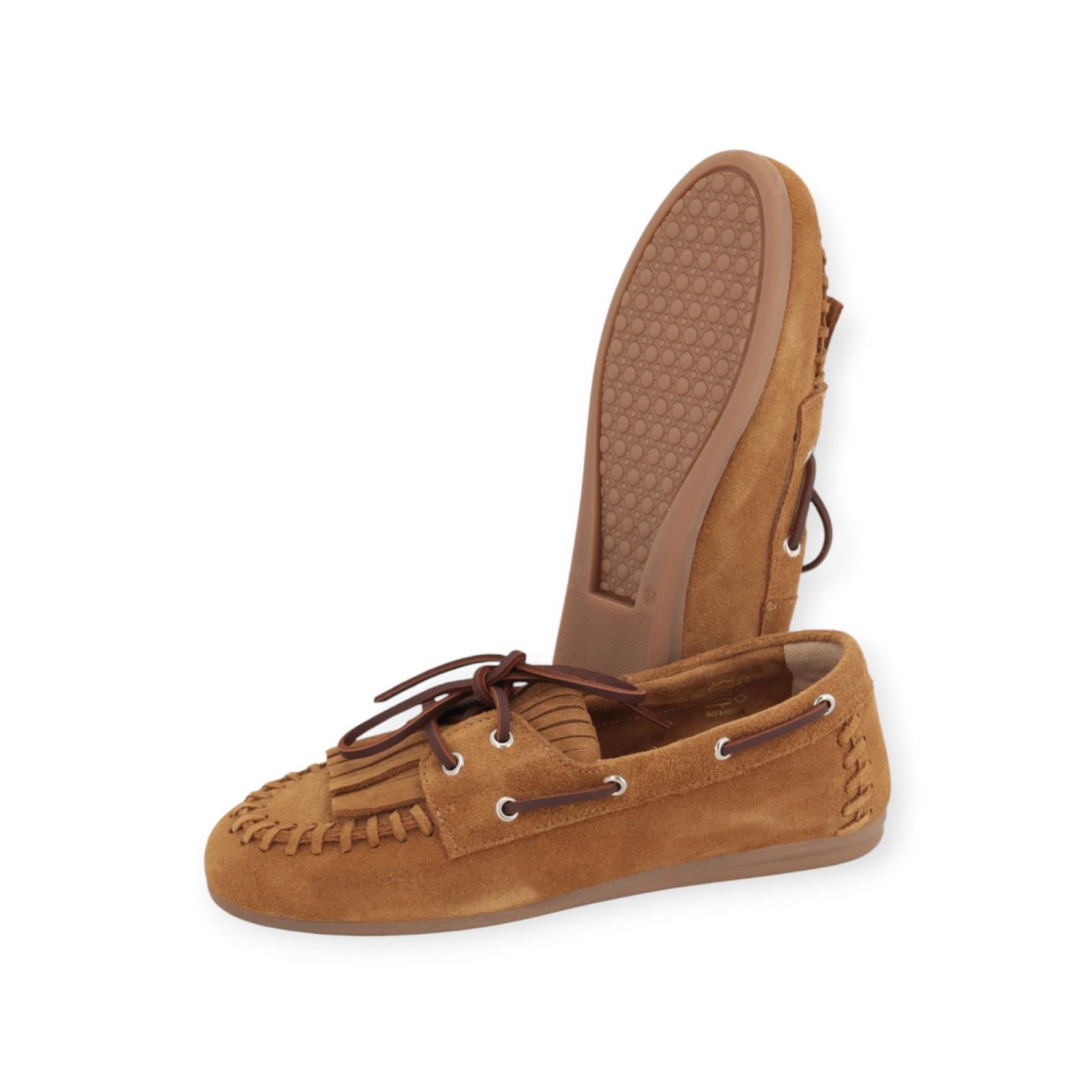 Mocassin Magda van Pavement voor dames. Deze mocassin is in typische bootschoen stijl. Is in cognac suède met mooi gehaakt stiksel aan de neus en zijkanten. Heeft een flap over de wreef met leren veters. Is op een antislipzool.