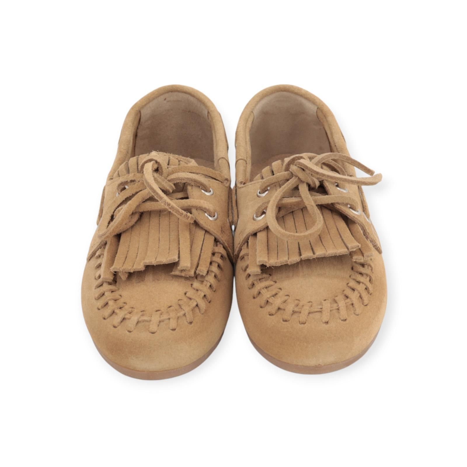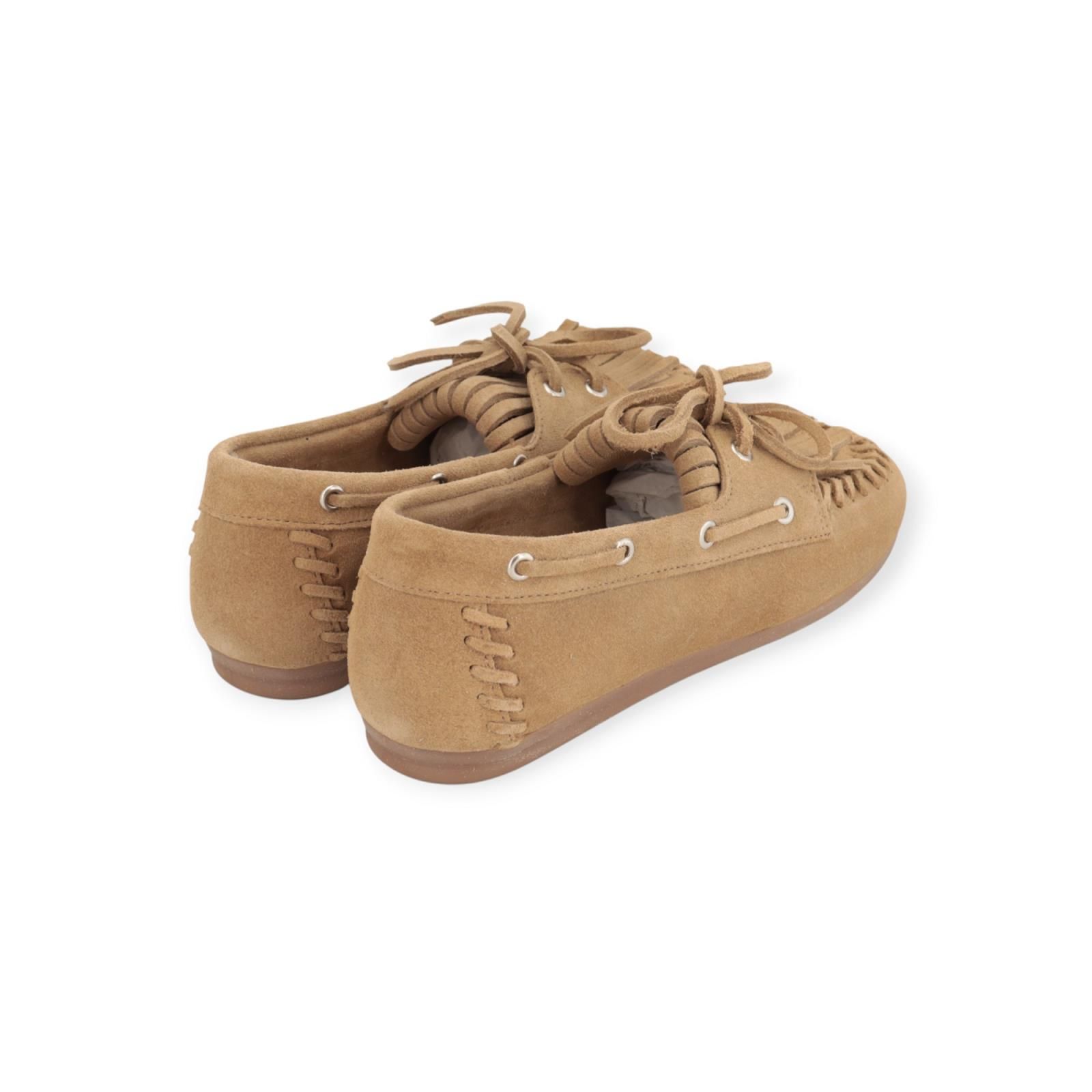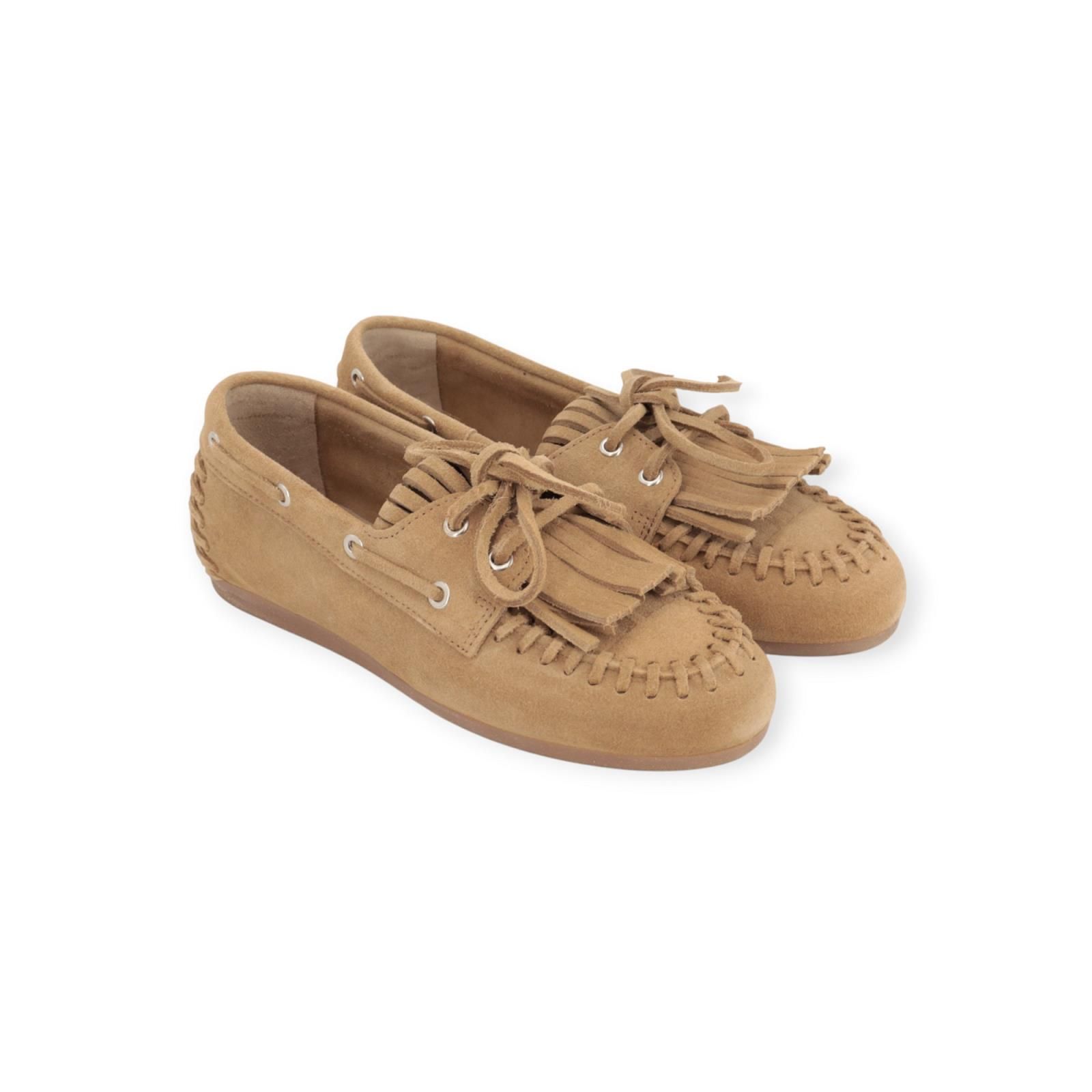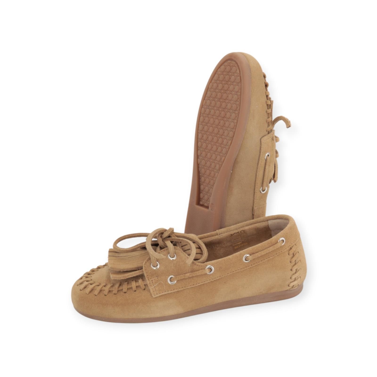 Mocassin Magda van Pavement voor dames. Deze mocassin is in typische bootschoen stijl. Is in zand suède met mooi gehaakt stiksel aan de neus en zijkanten. Heeft een flap over de wreef met bruine leren veters. Is op een antislipzool.