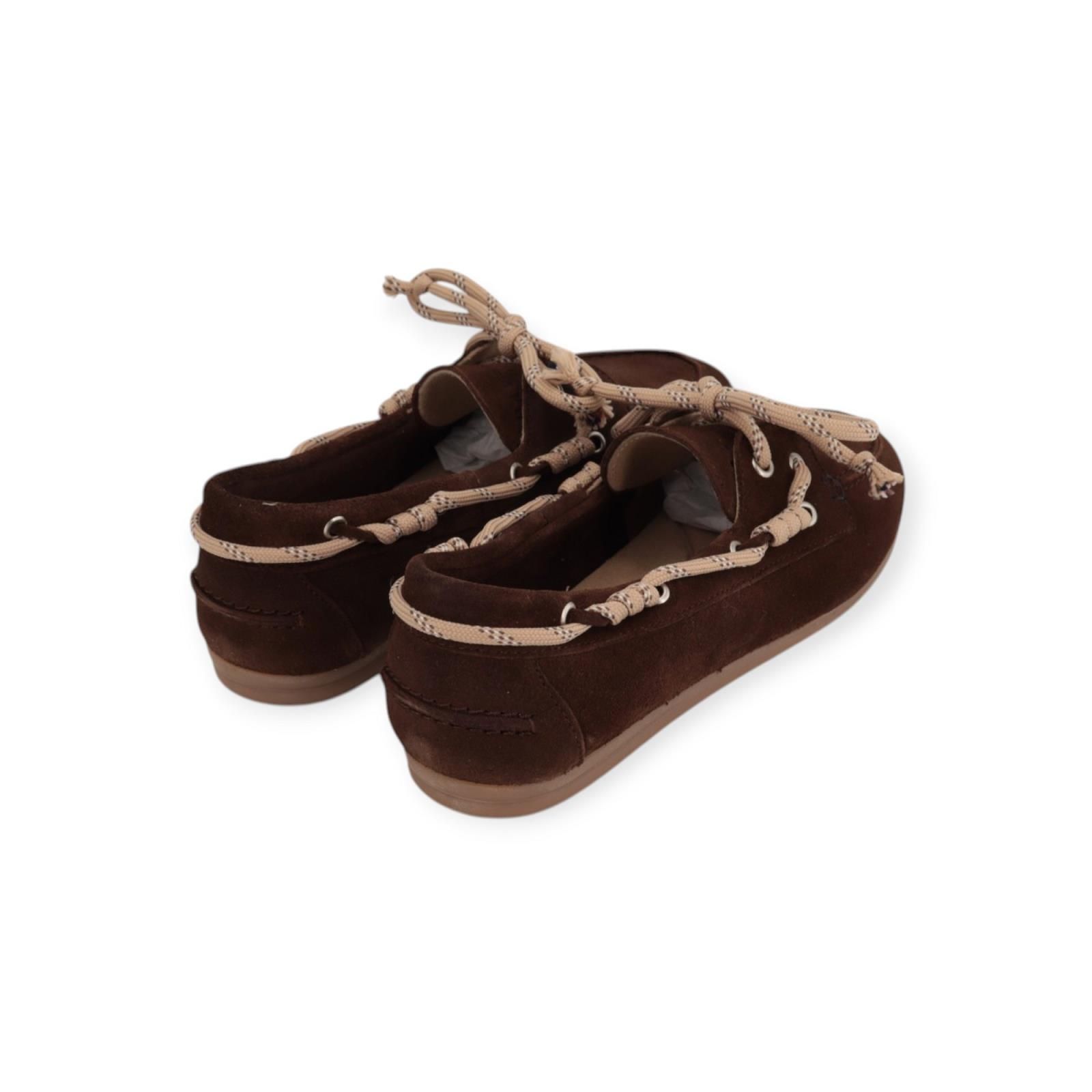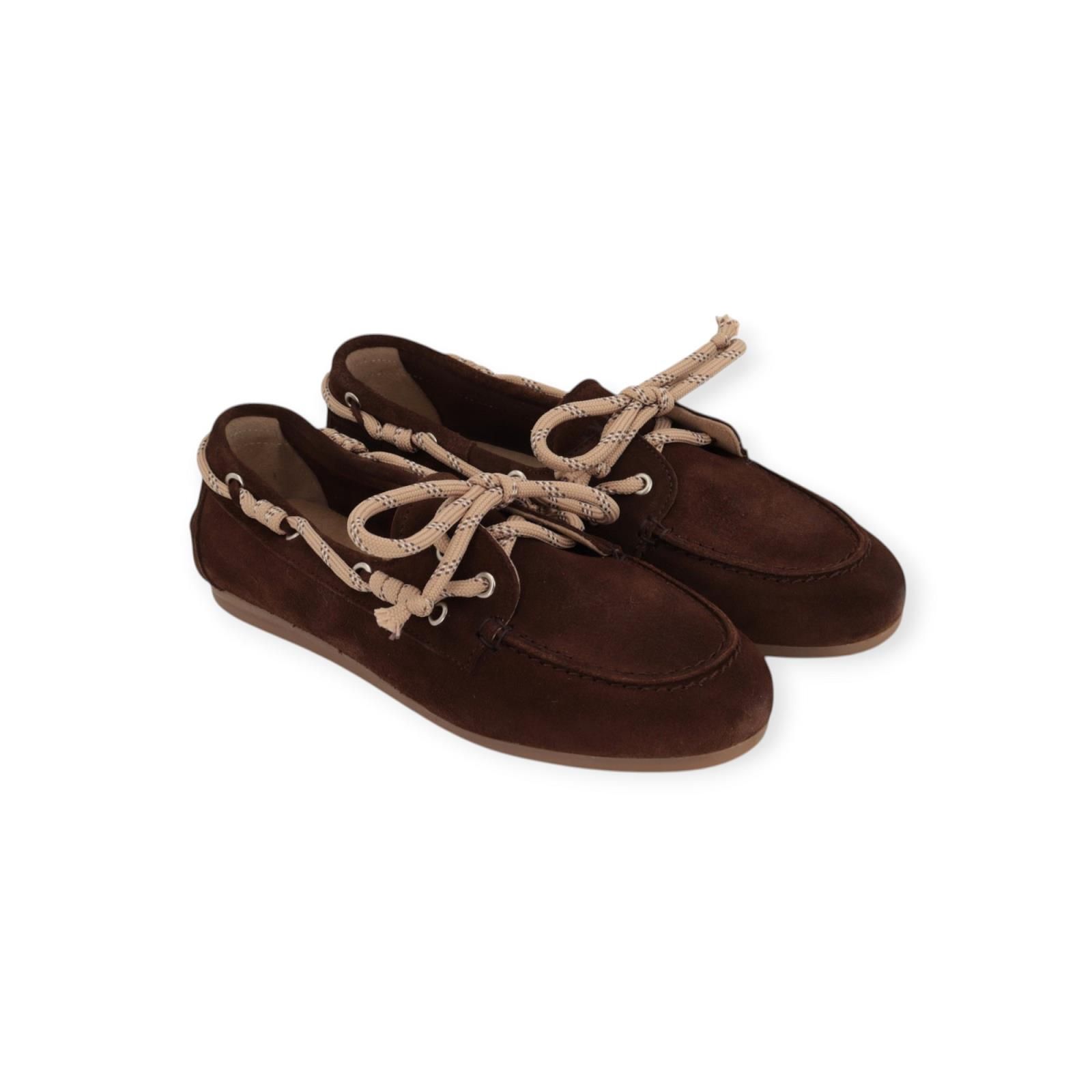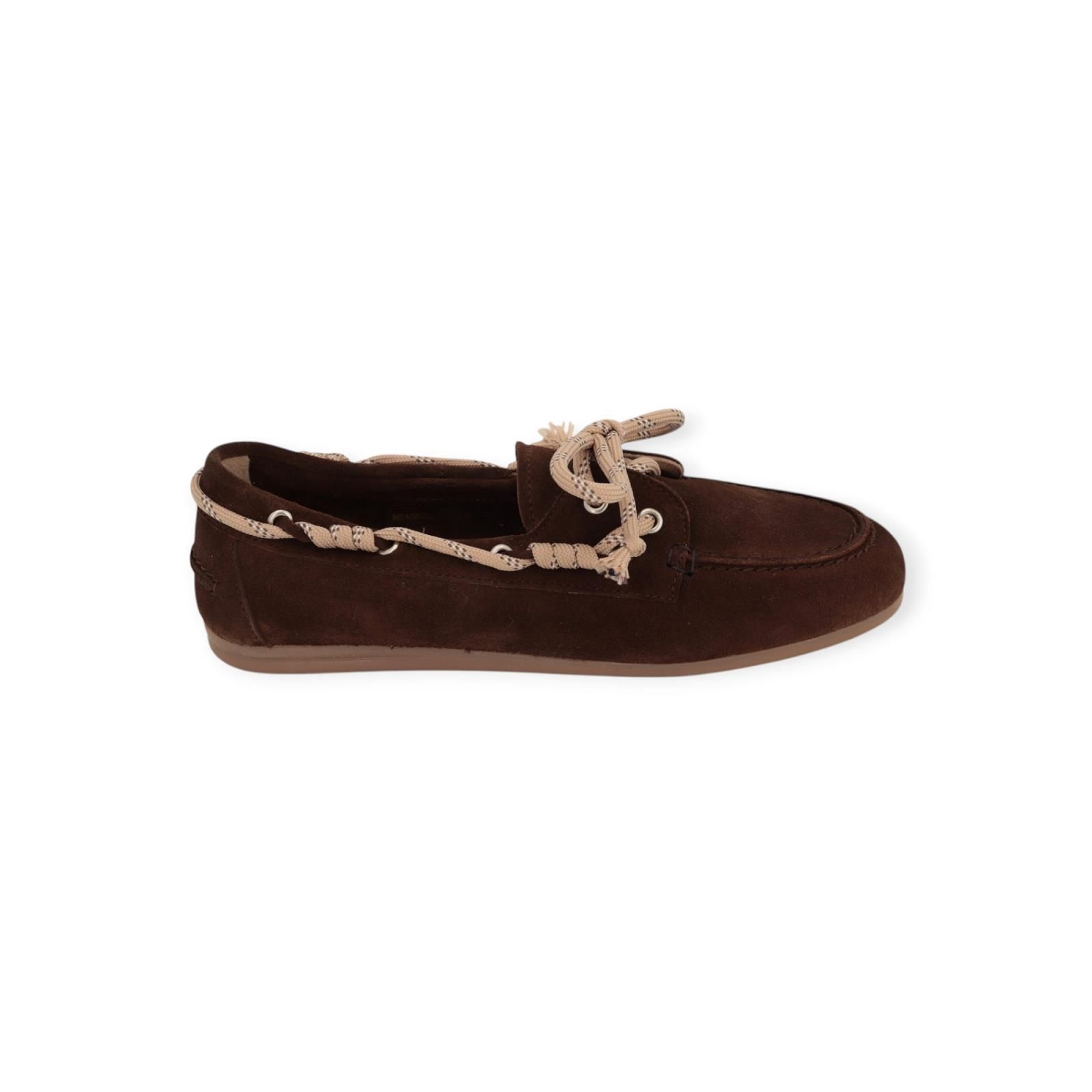 Mocassin Pamarin Bold Lace van Pavement voor dames. Deze mocassin is in bruin suède met bruin suède veters aan de zijkant. Heeft een beige vetersluiting die eveneens doorlopen langs de zijkant op een speelse manier. Deze bootschoen stijl is de trend voor deze zomer. Is super licht met een aangenaam voetbed en een zachte antislipzool.