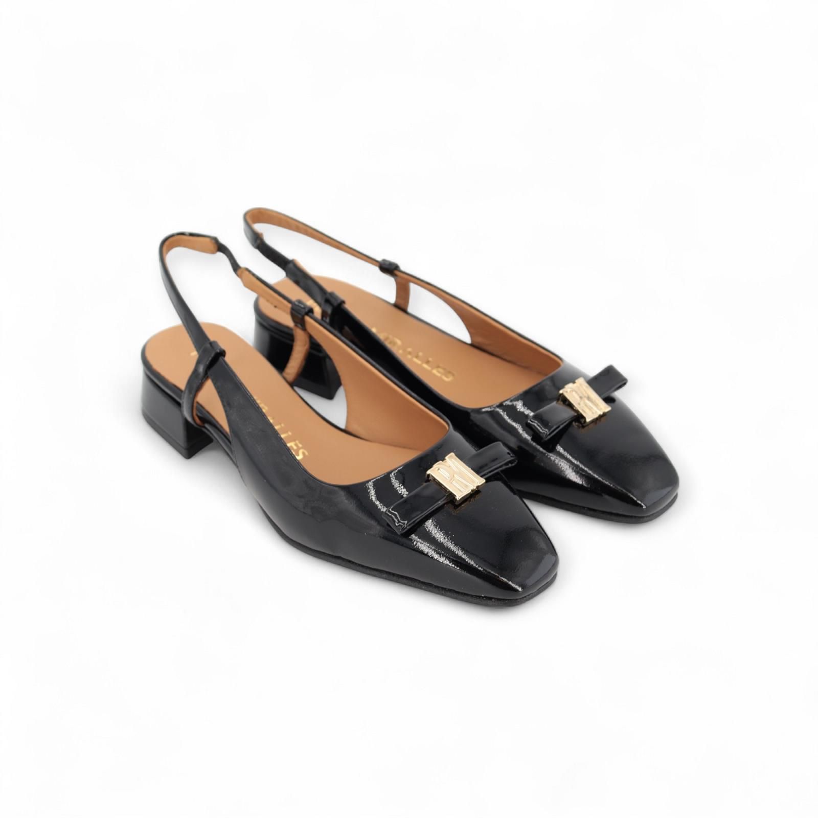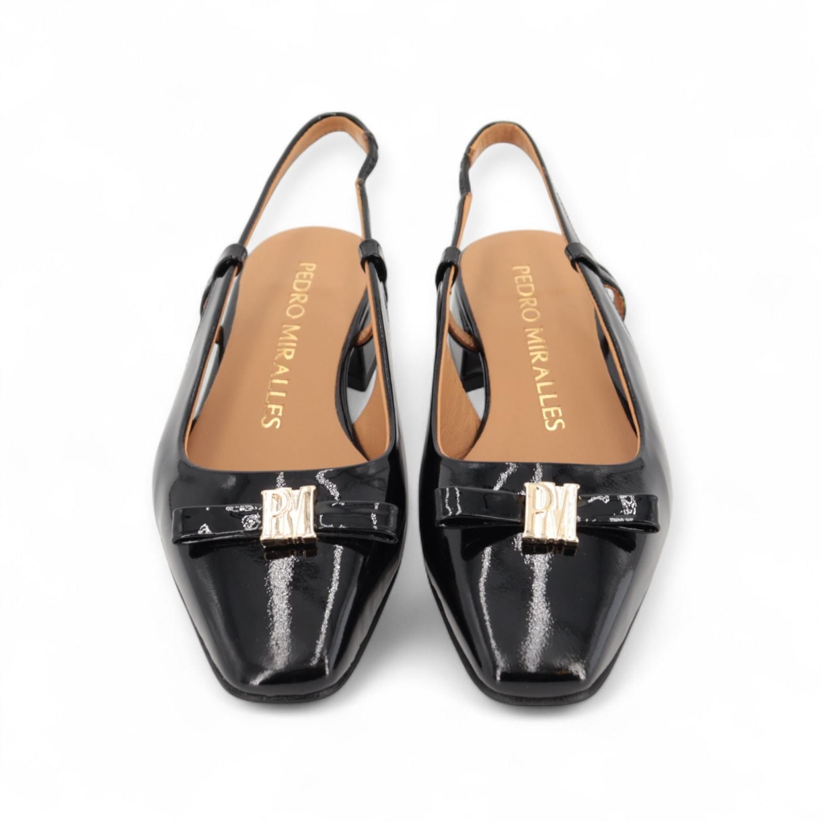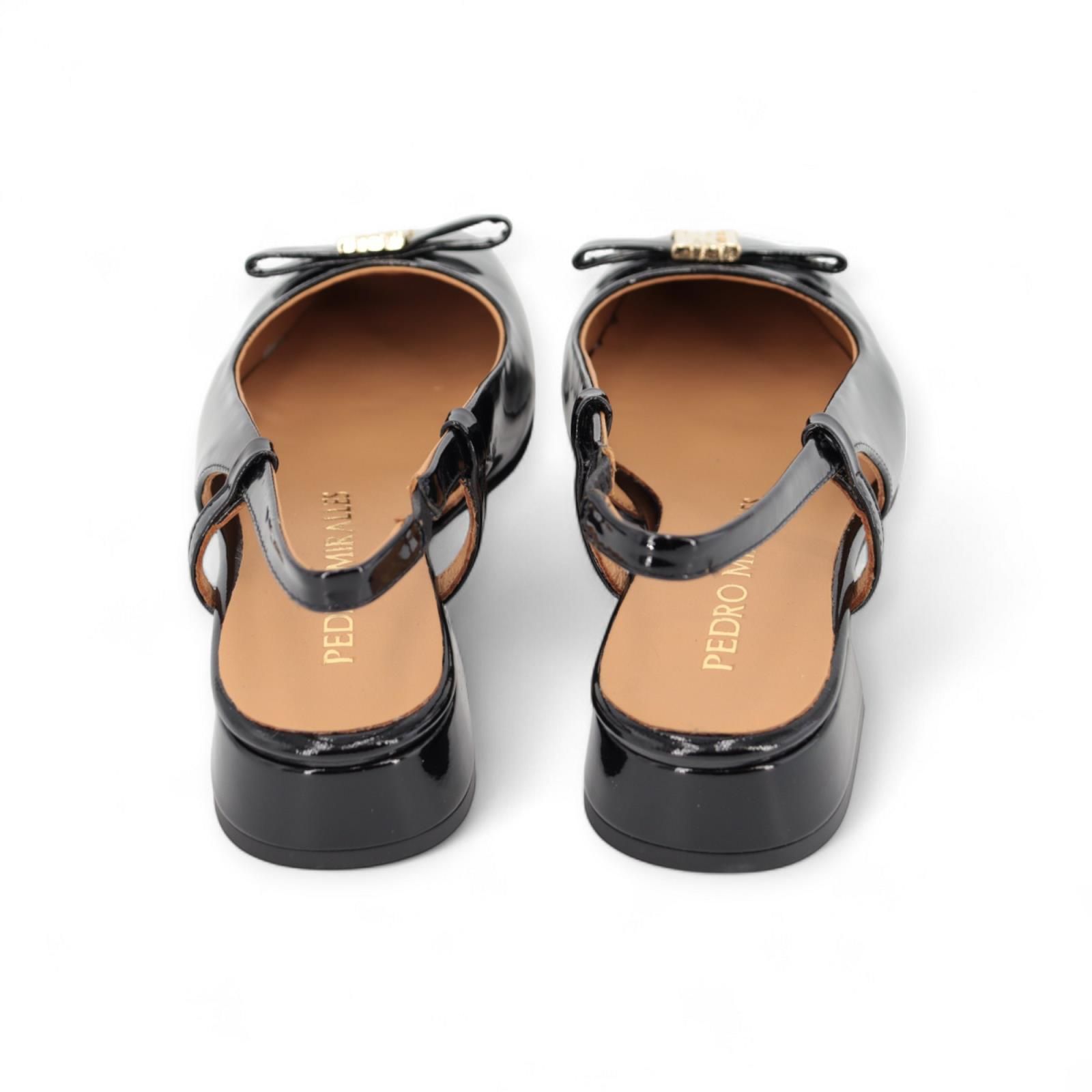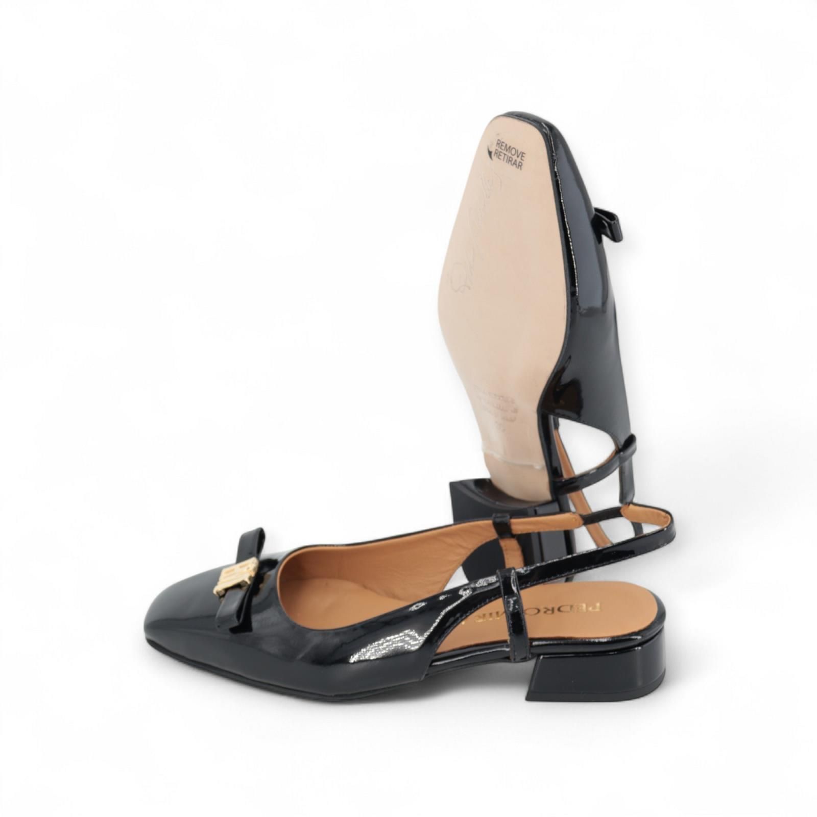 Zwarte lakleren ballerina’s van Pedro Miralles. Deze slingback schoen is een voorbeeld van verfijnde eenvoud. Het bandje blijft mooi aan de hiel door de rekker. Is op een klein hakje van 2-2,5cm.