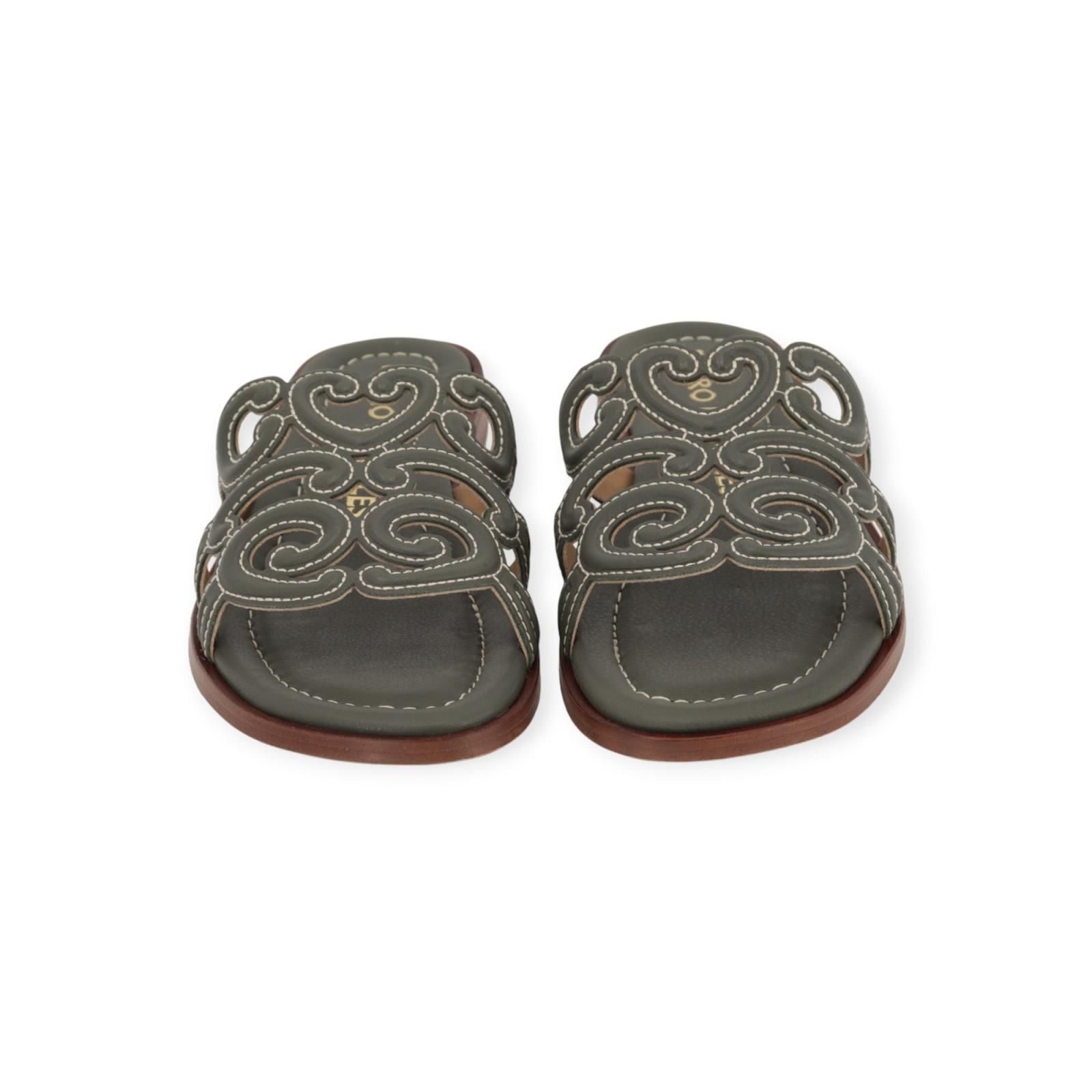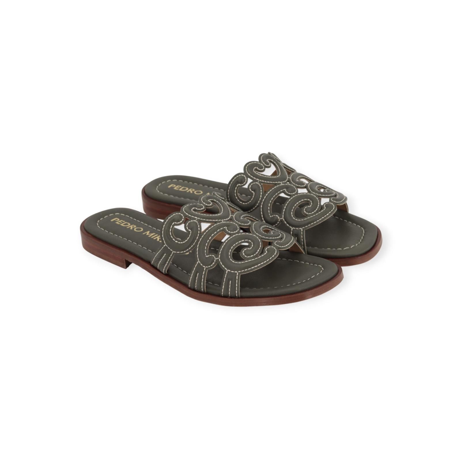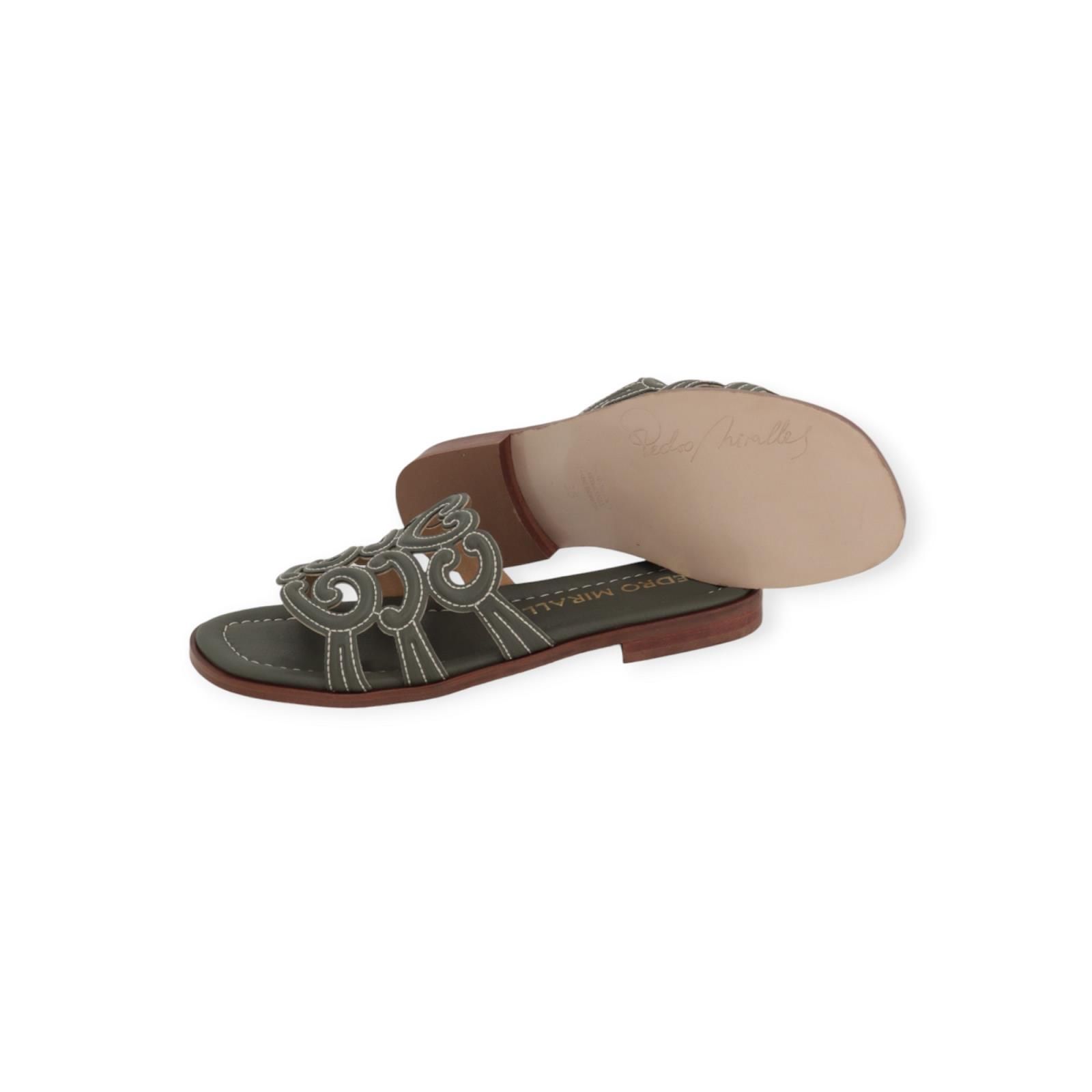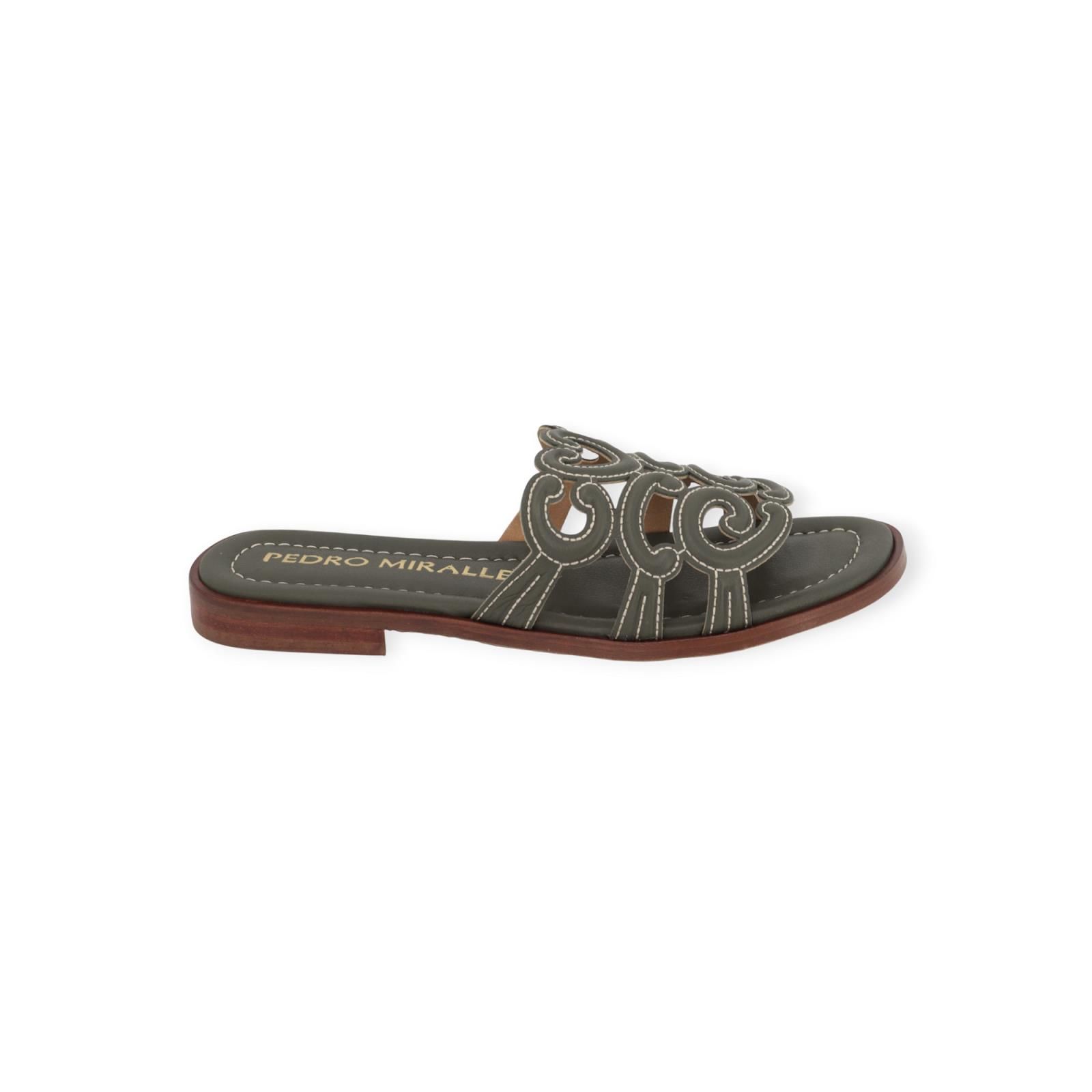 Slipper 18028 van Pedro Miralles in groen leer. Deze elegante slipper heeft een leren band over de wreef met verschillende texturen en wit stiksel. Heeft een lichte carré neus en een leren buitenzool.