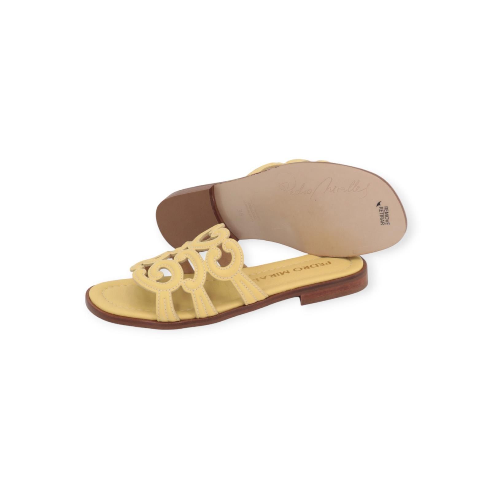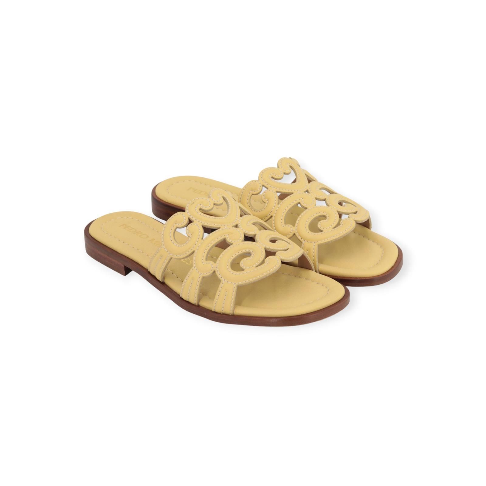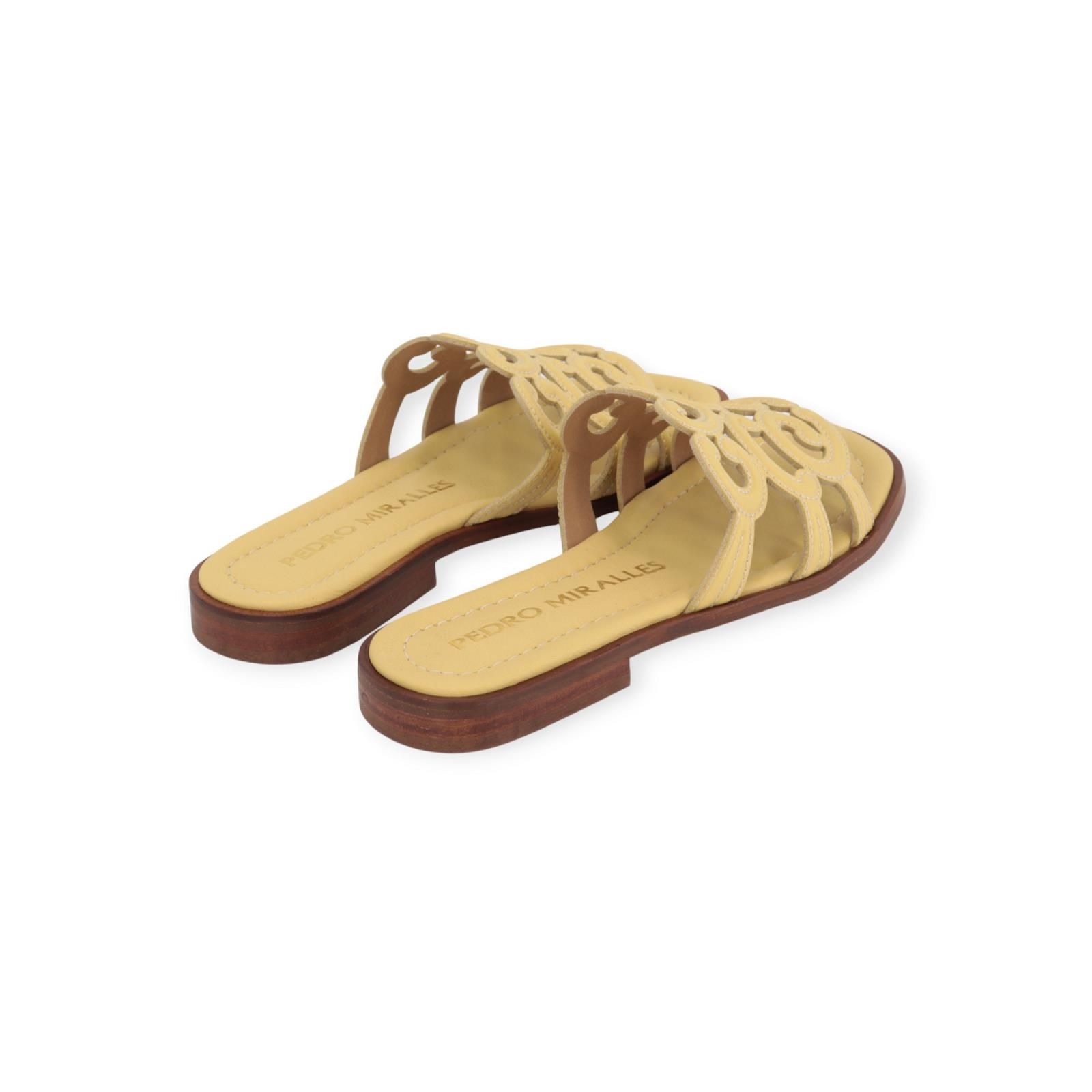 Slipper 18028 van Pedro Miralles in lichtgeel leer. Deze elegante slipper heeft een leren band over de wreef met verschillende texturen en wit stiksel. Heeft een lichte carré neus en een leren buitenzool.