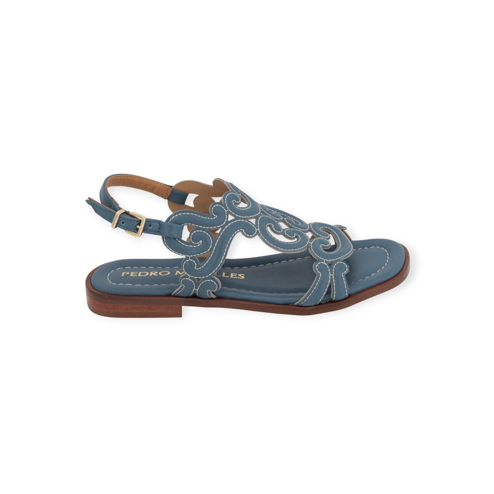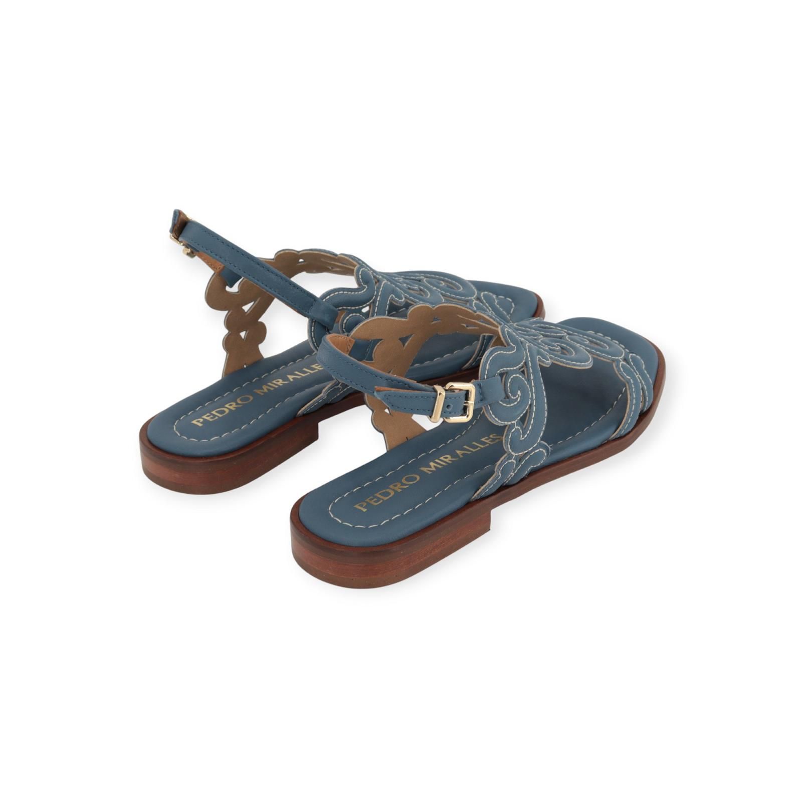 Sandaal 18032 van Pedro Miralles in licht blauw leer. Deze sandaal heeft een leren band over de wreef met verschillende texturen en wit stiksel. Heeft een lichte carré neus en een leren buitenzool.
