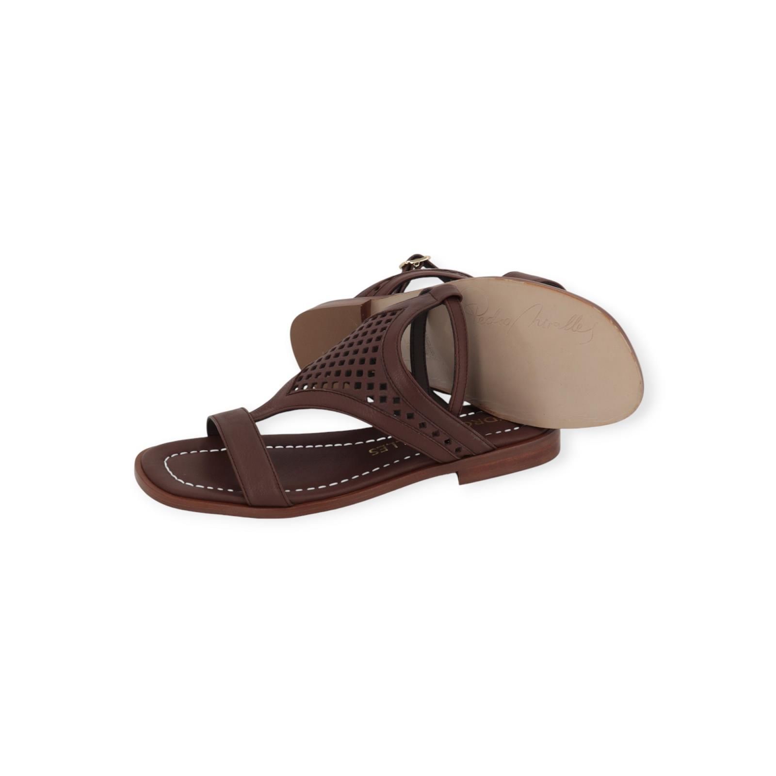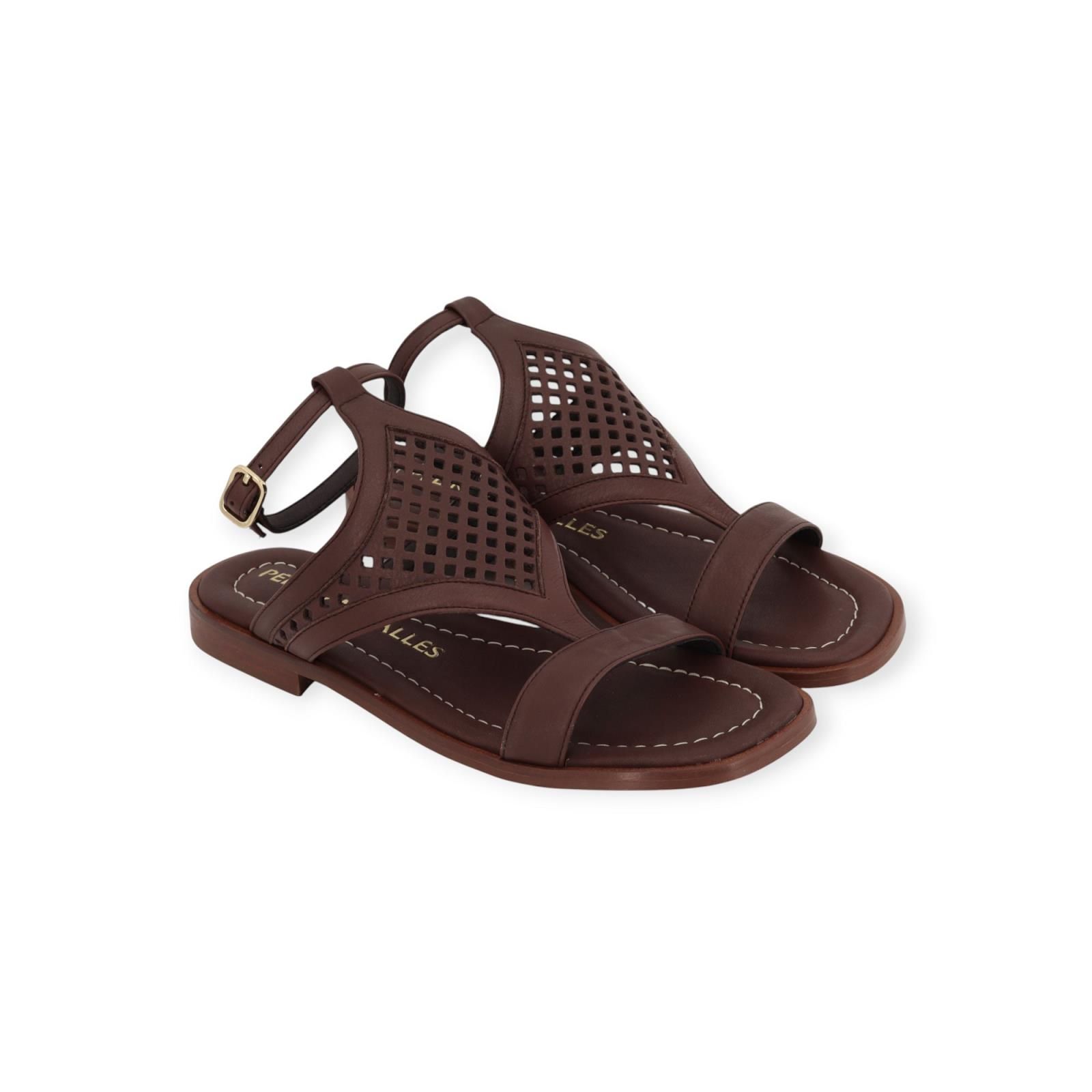 Sandaal 18052 van Pedro Miralles voor dames. Deze sandaal is in bruin leer met een fijn bandje die mooi doorloopt over de wreef in geperforeerd leer. Blijft mooi vast door het bandje rond de enkel met goudengespsluiting. Is op een leren buitenzool.