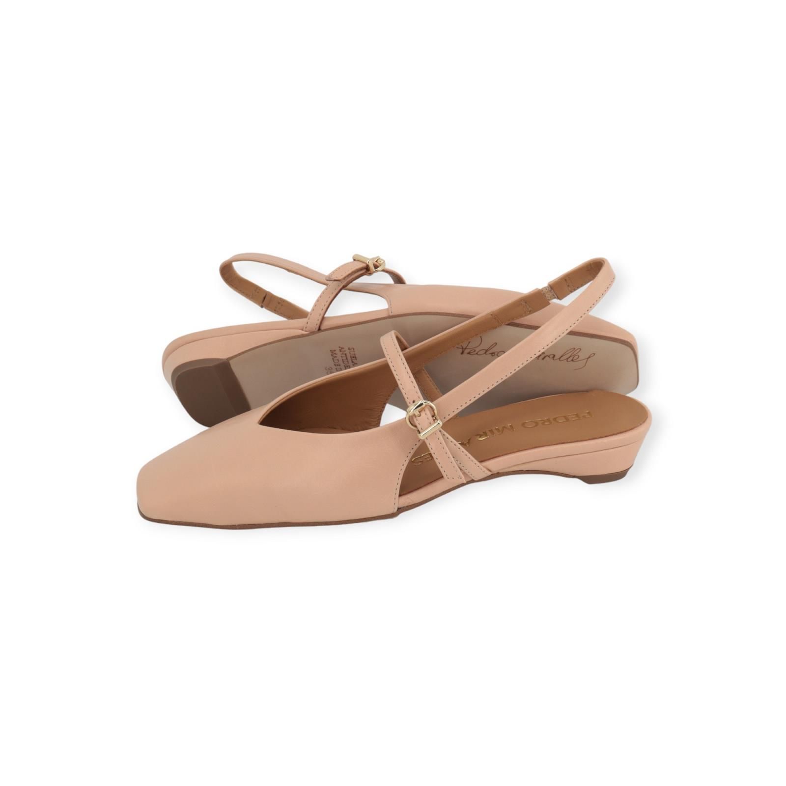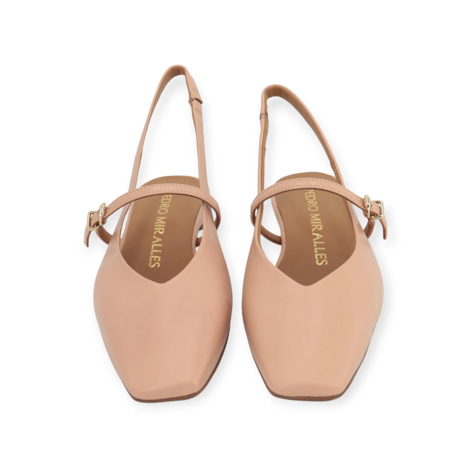 Ballerina 18553 van Pedro Miralles voor dames. Deze elegante slingback ballerina is in nude leer met een carré neus en open hieltje. Blijft mooi vast aan de voet door de elastiek aan de enkel. Heeft nog een fijn bandje over de wreef met gouden gespsluiting. Heeft een leren buitenzool en een klein hakje van 2cm hoog.
