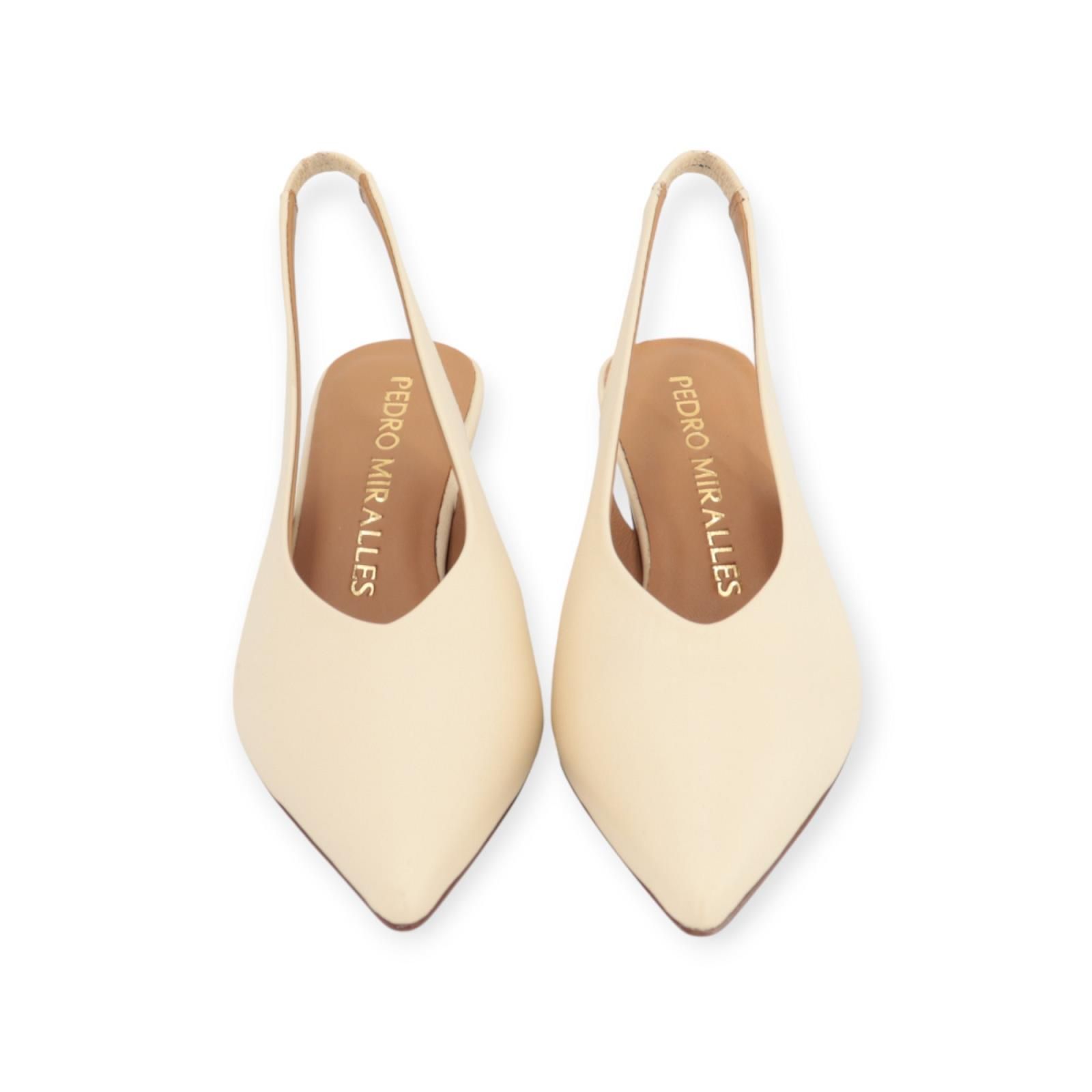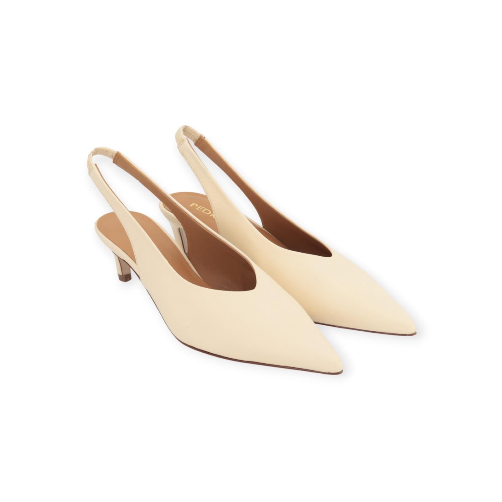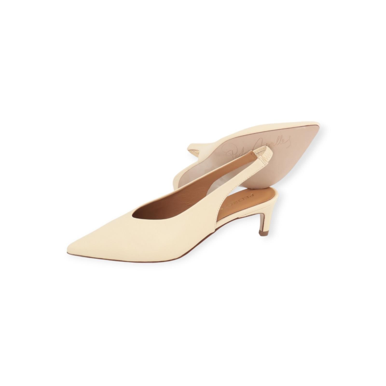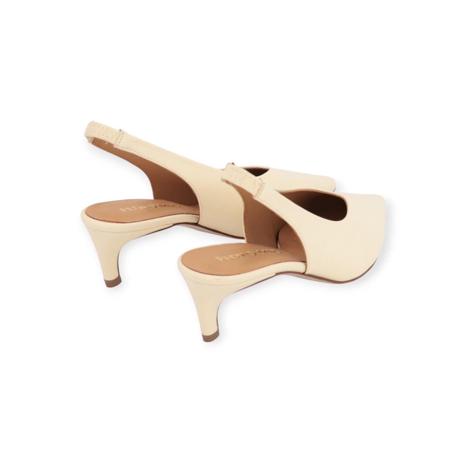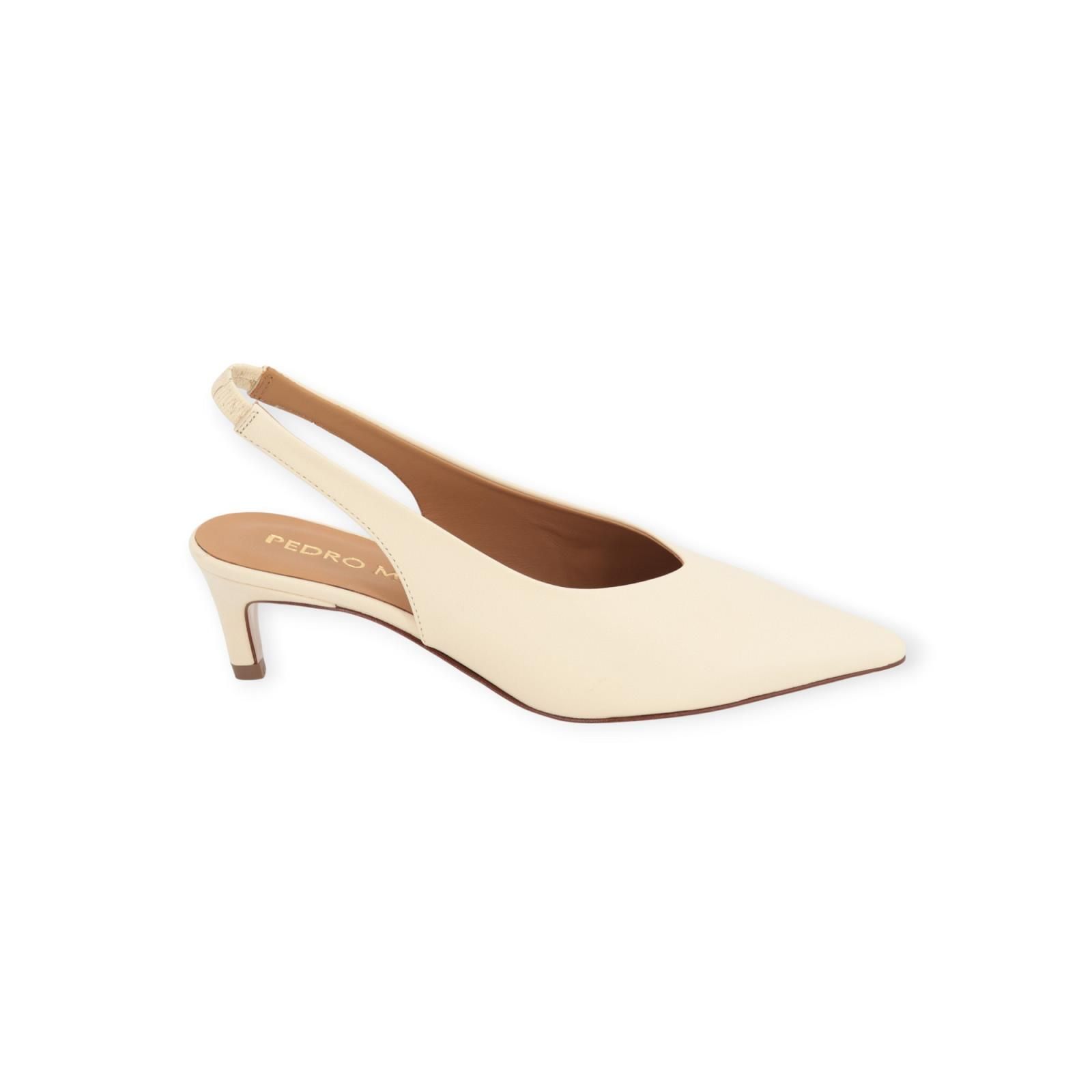 Pump 18732 van Pedro Miralles voor dames. Dit elegant slingback model is in zacht ecru leer. Heeft een scherpe neus en een open hieltje. Dit model blijft mooi aan de voet door de rekker achteraan aan de hiel. Is op een elegant hakje van 5-5.5cm hoog.