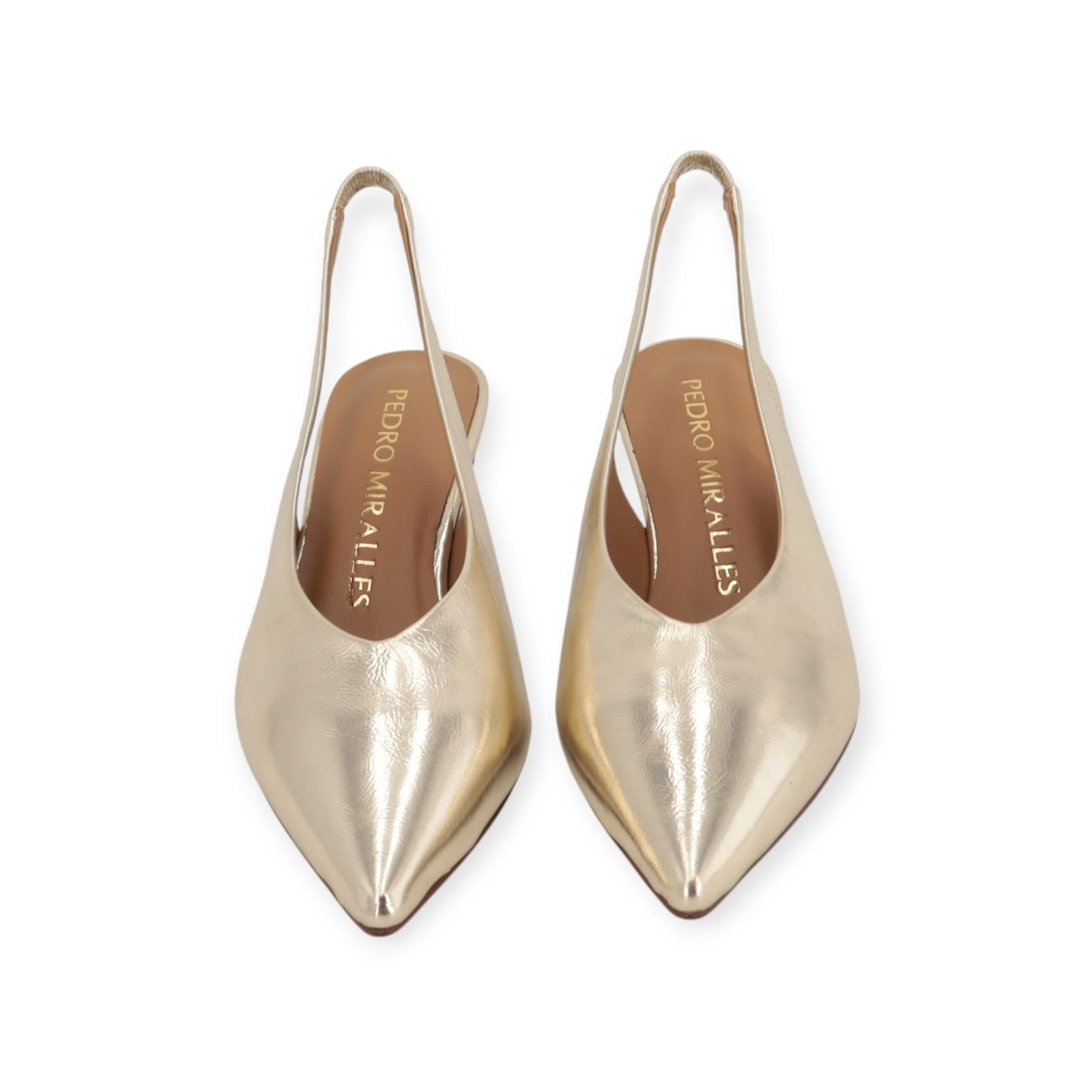 Pump 18732 van Pedro Miralles voor dames. Dit elegant slingback model is in goud shining leer. Heeft een scherpe neus en een open hieltje. Dit model blijft mooi aan de voet door de rekker achteraan aan de hiel. Is op een elegant hakje van 5-5.5cm hoog.