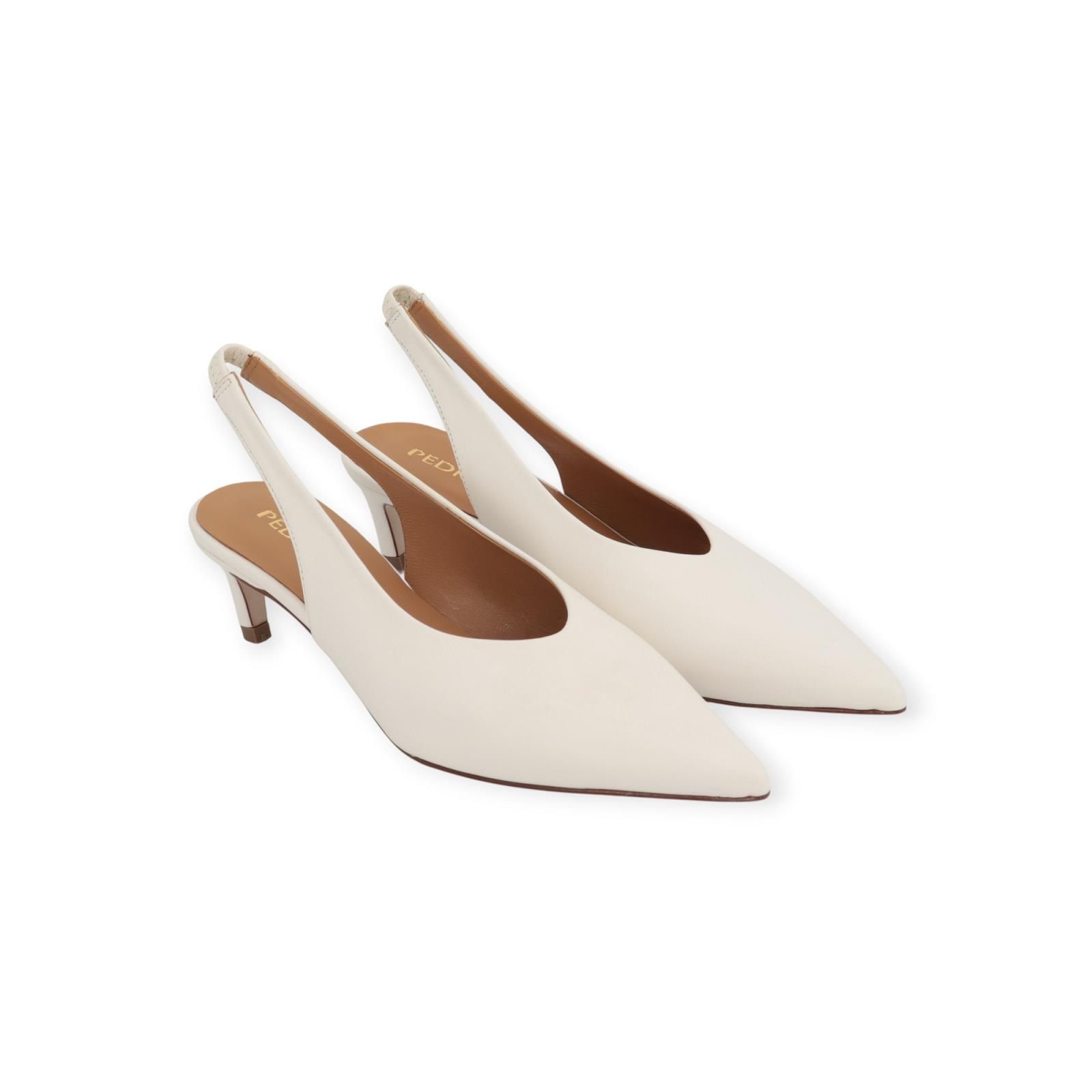Pump 18732 van Pedro Miralles voor dames. Dit elegant slingback model is in wit leer. Heeft een scherpe neus en een open hieltje. Dit model blijft mooi aan de voet door de rekker achteraan aan de hiel. Is op een elegant hakje van 5-5.5cm hoog.