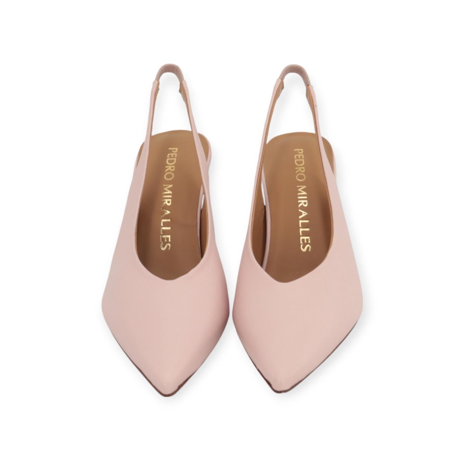Pump 18755 van Pedro Miralles voor dames. Dit slingback model is met een scherpe neus en een open hieltje in roze leer. Blijft mooi aan de voet door de elastiek aan de hiel. Is op een elegant fijn hakje van 7cm hoog.