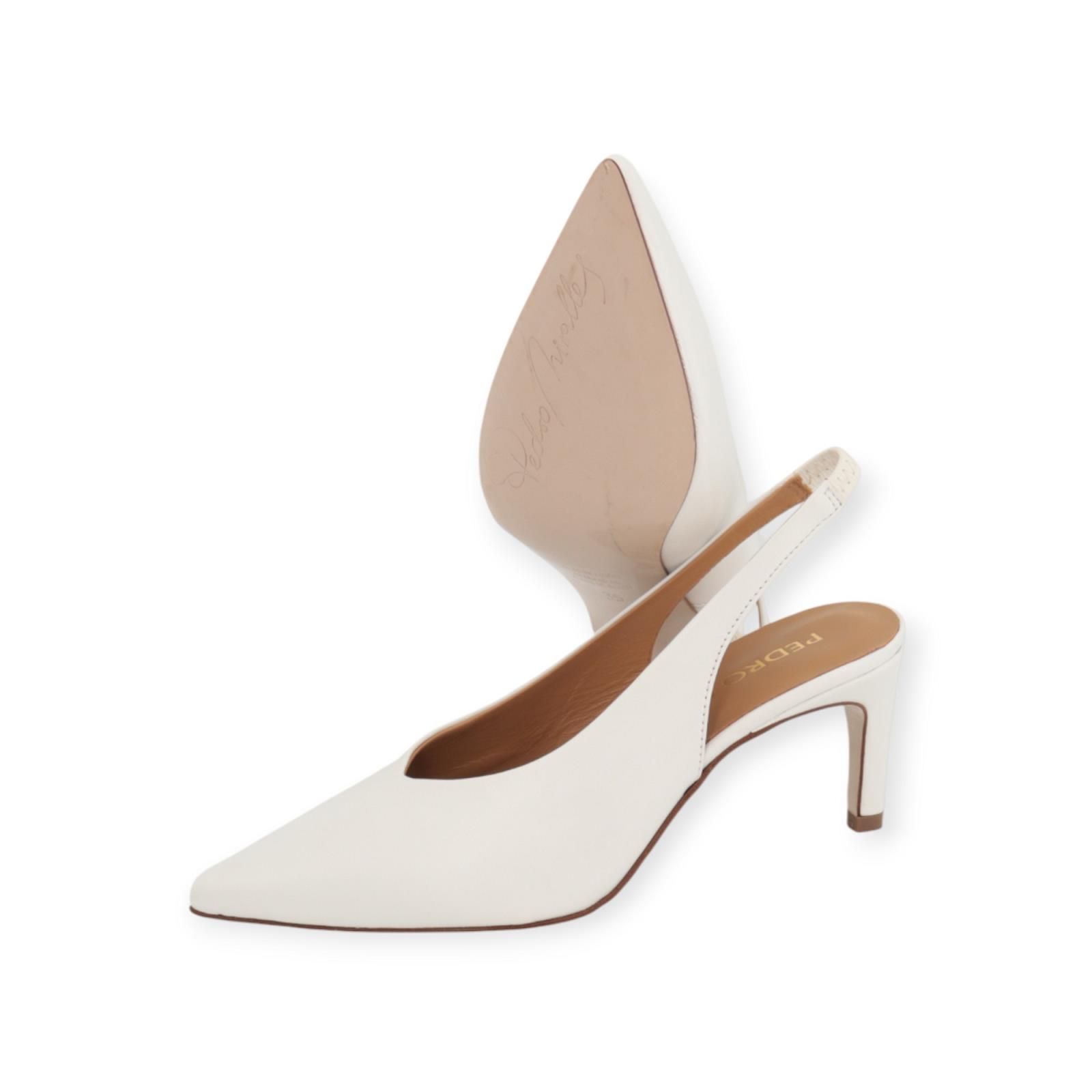 Pump 18755 van Pedro Miralles voor dames. Dit slingback model is met een scherpe neus en een open hieltje in wit leer. Blijft mooi aan de voet door de elastiek aan de hiel. Is op een elegant fijn hakje van 7cm hoog.