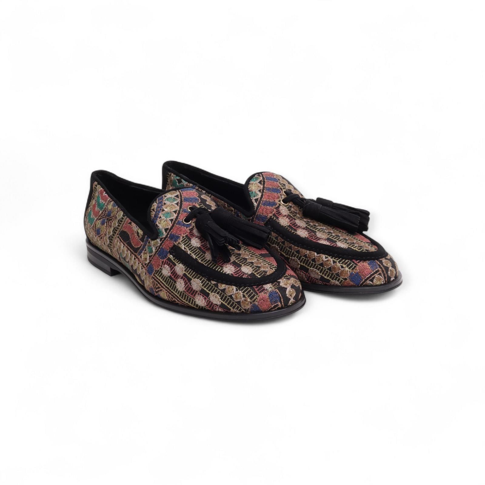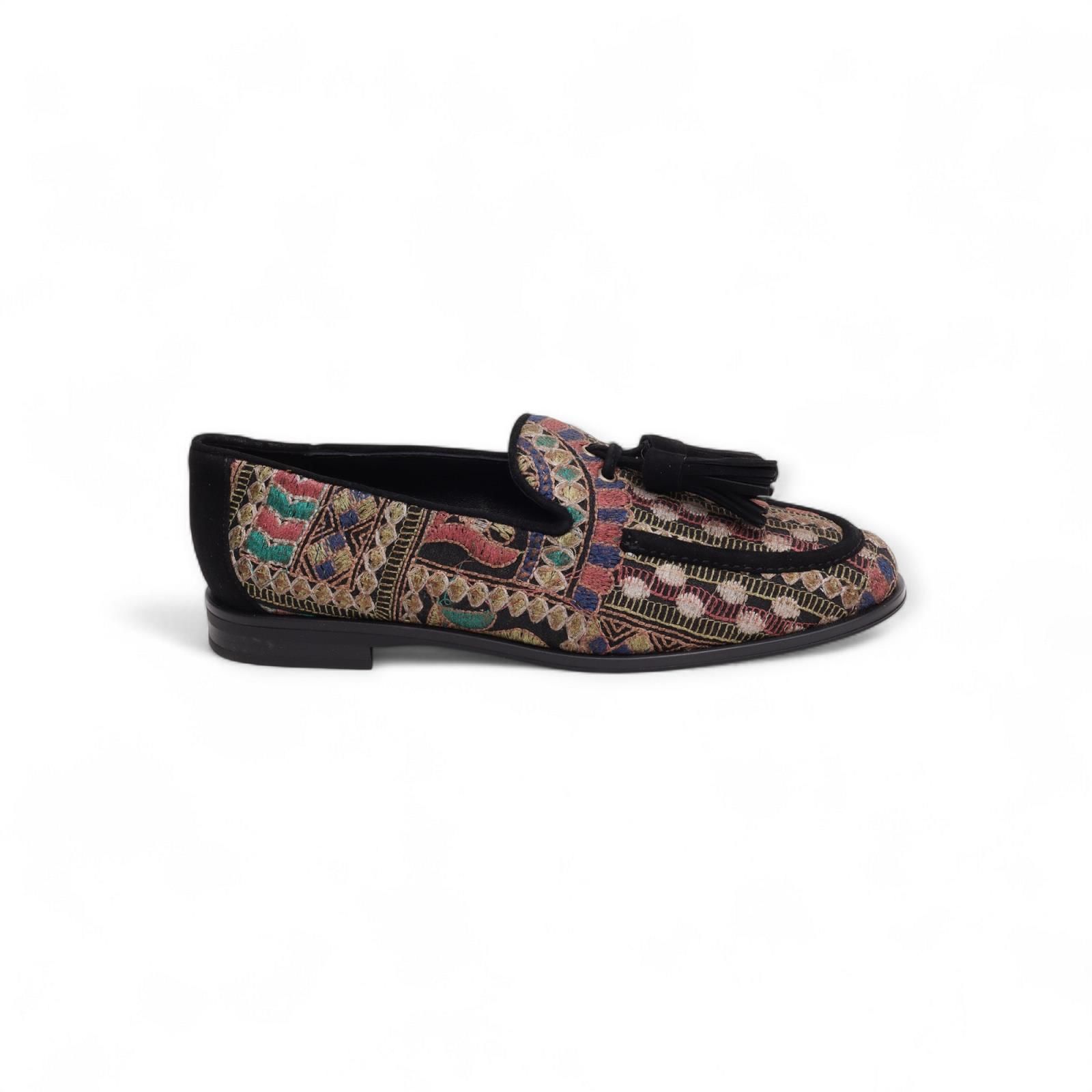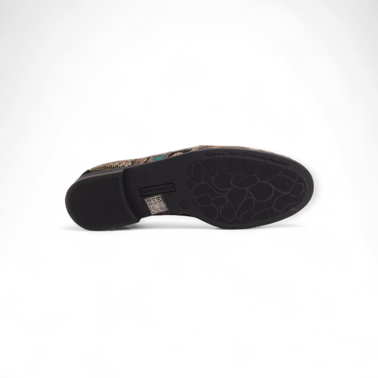 Mocassin van Pedro Miralles voor dames. Deze mocassin is in geprint stof met een zwart stekking en flosh op de wreef. Is op een aangenaam antislipzool.