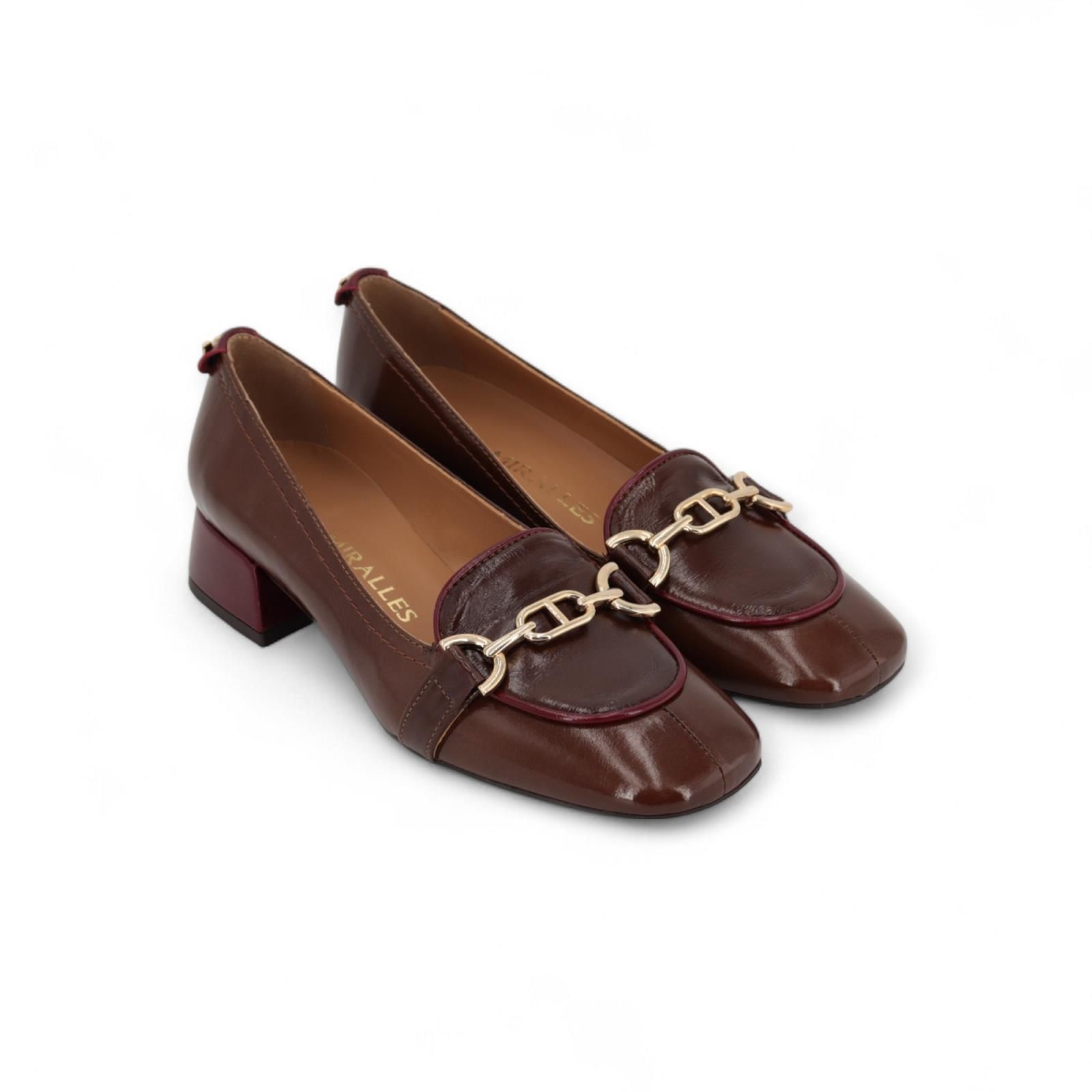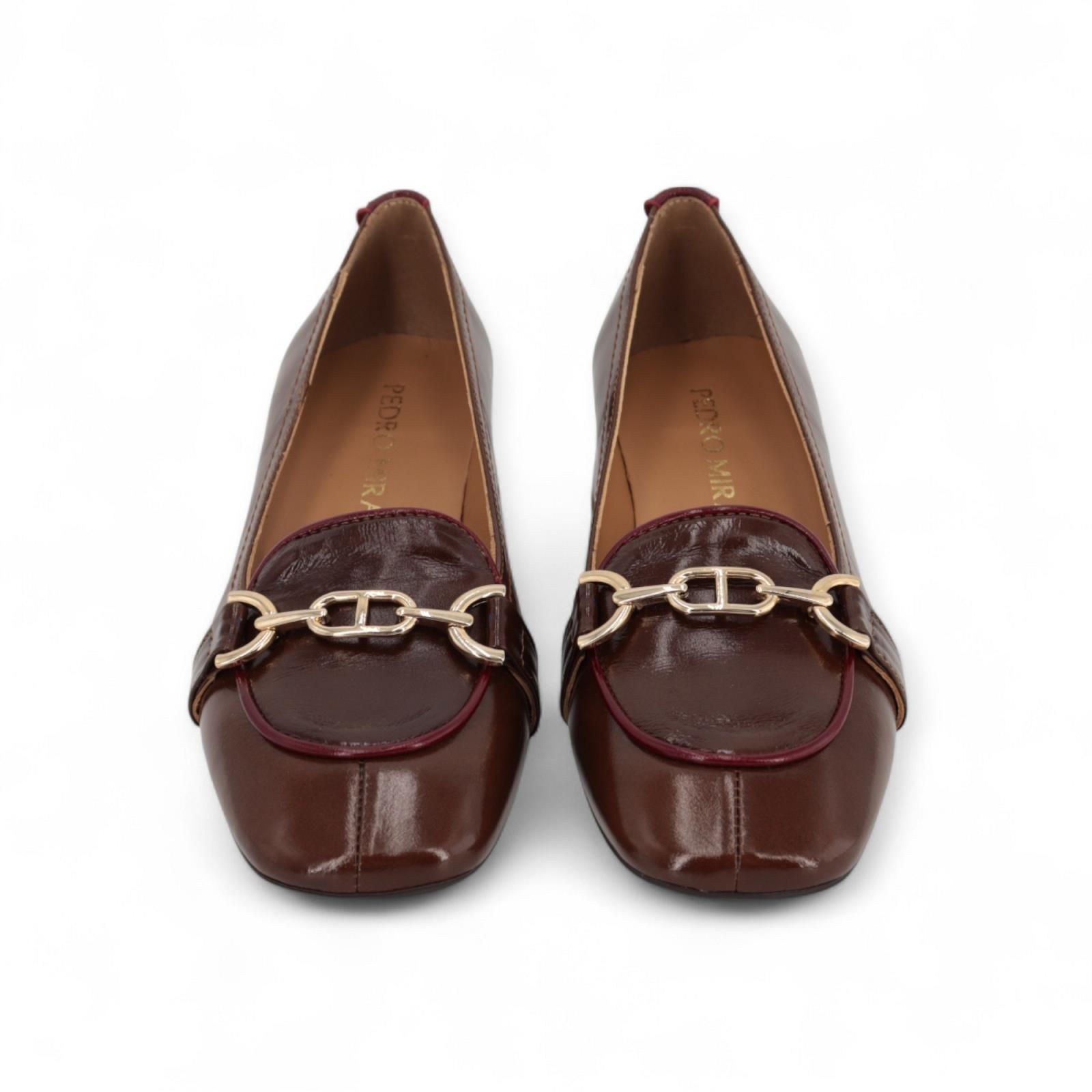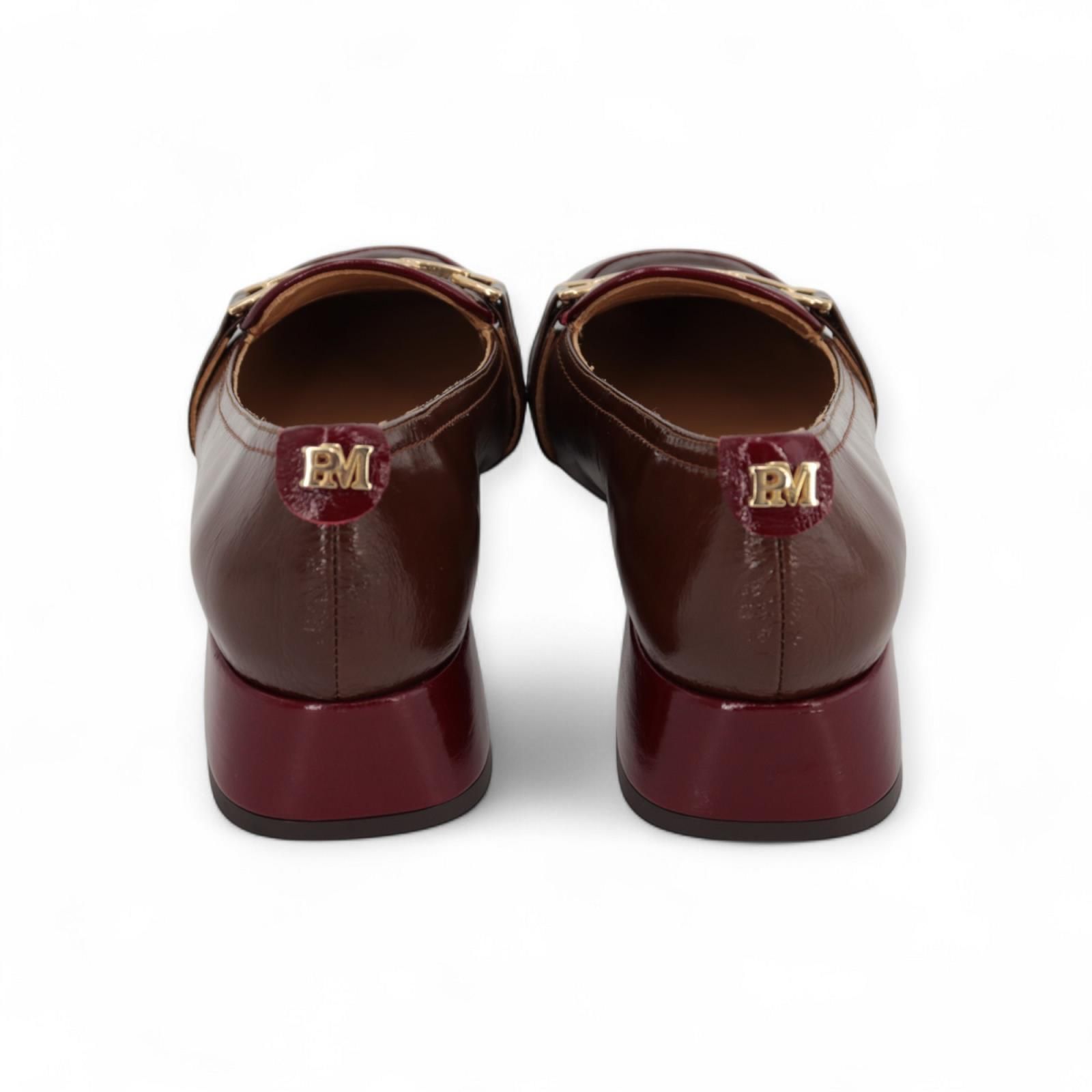 Mocassin van Pedro Miralles voor dames. Deze mocassin is in bruin lakleer. Heeft een subtiele stekking in bordeaux over de wreef met een gouden gesp. Is afgewerkt met stiksel aan de zijkant en heeft een blokhakje ook mooi afgewerkt in bordeaux lakleer van 3cm hoog.