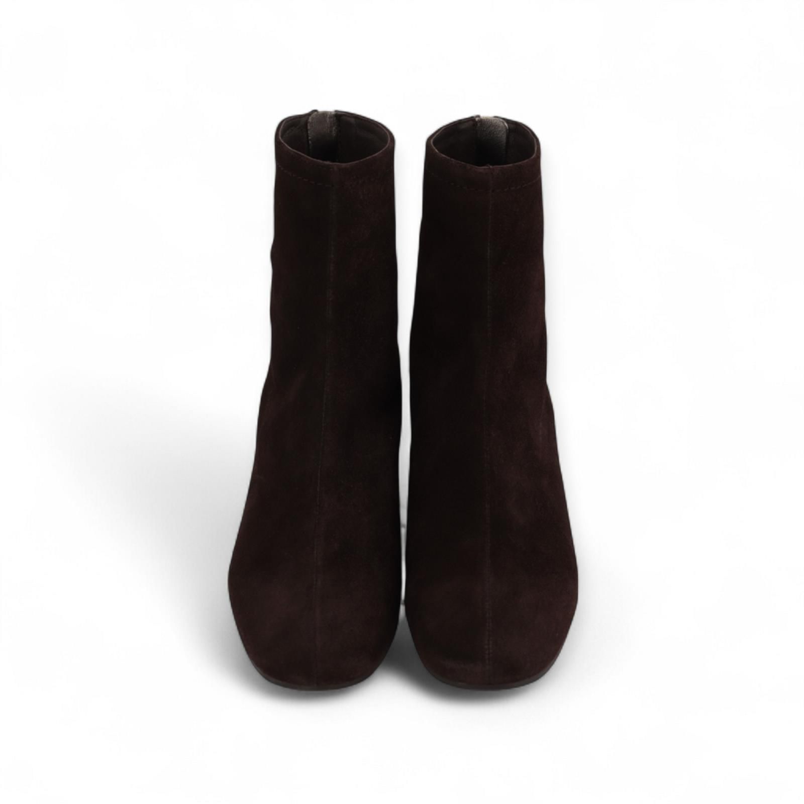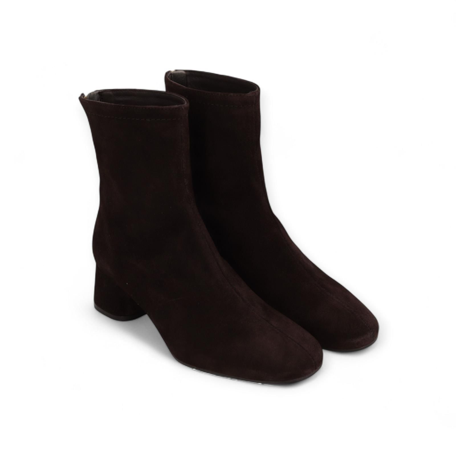 Enkellaarsje van Pedro Miralles voor dames. Dit elegant enkellaarsje is in bruine suede. Is mooi afgewerkt met een lichte ronde top en een vetersluiting aan de hiel. Is op een blokhakje van 4-4,5cm hoog. Heeft een antislip zool.