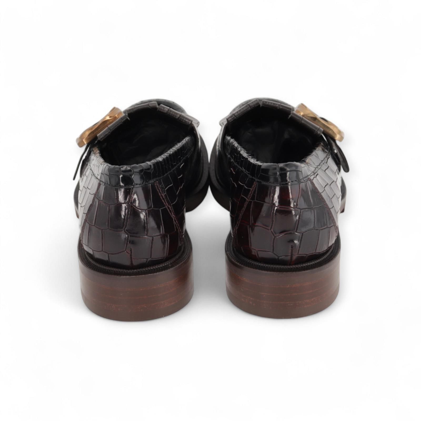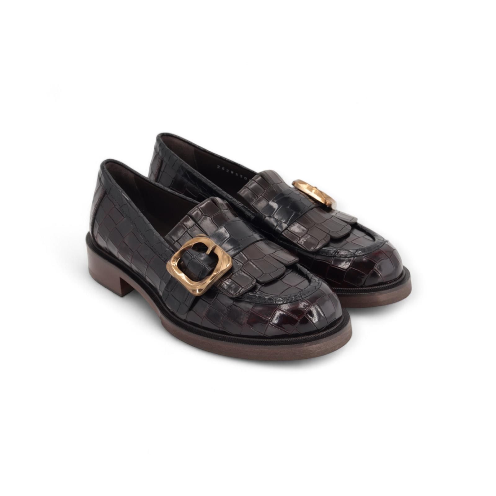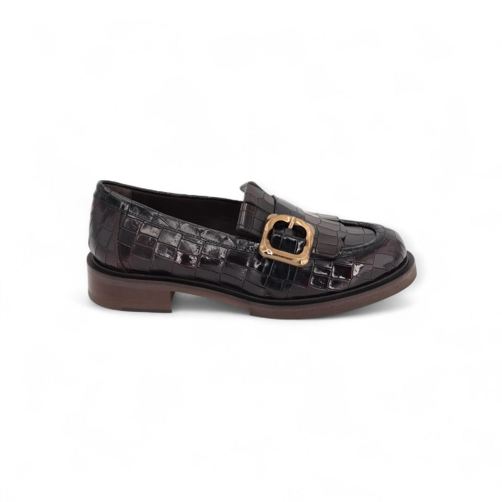 Mocassin van Pertini voor dames. Deze elegante mocassin is in bordeaux crocco lakleer. Is mooi afgewerkt met een flap over de wreef en een gesp met gouden sluiting. Is op een houten antislipzool.