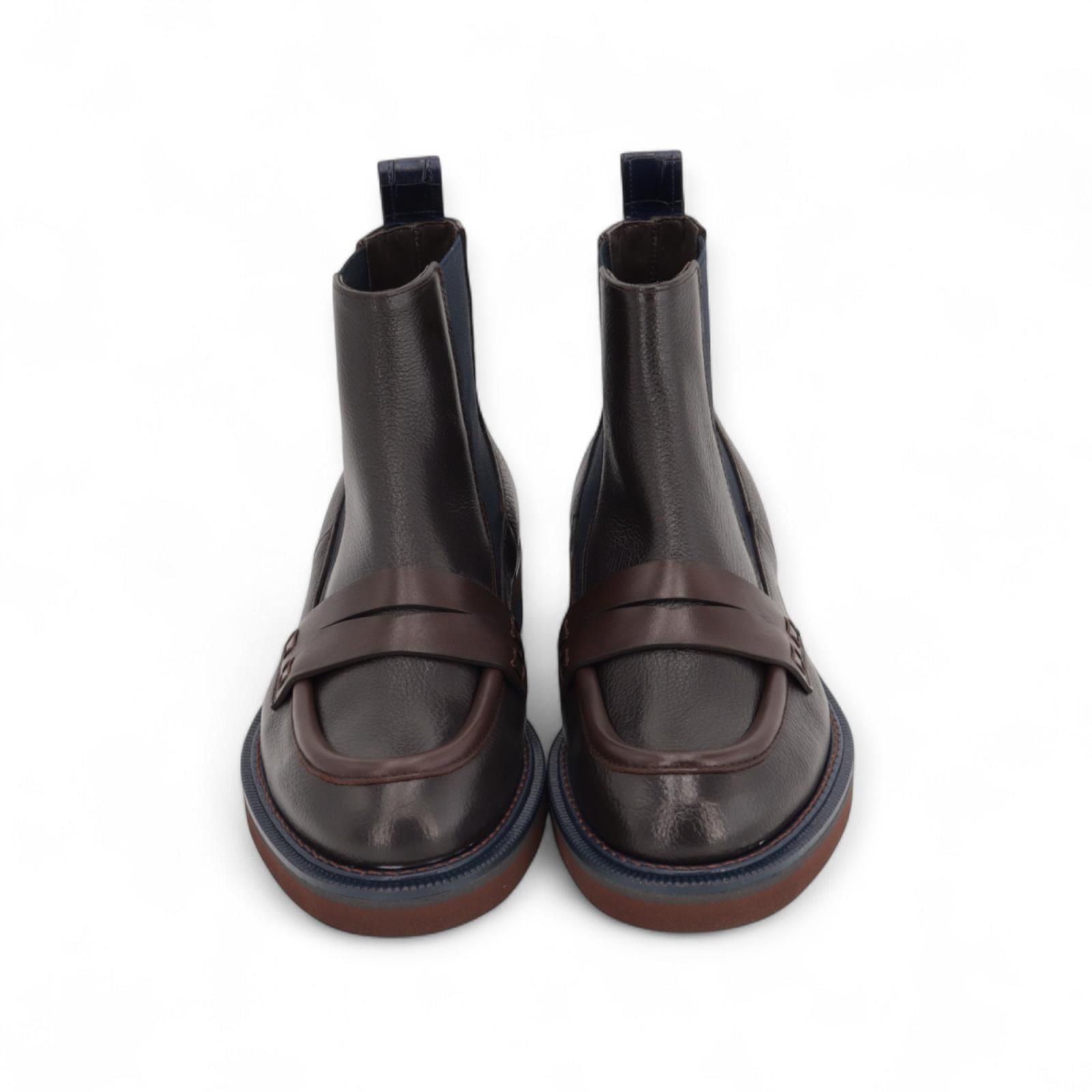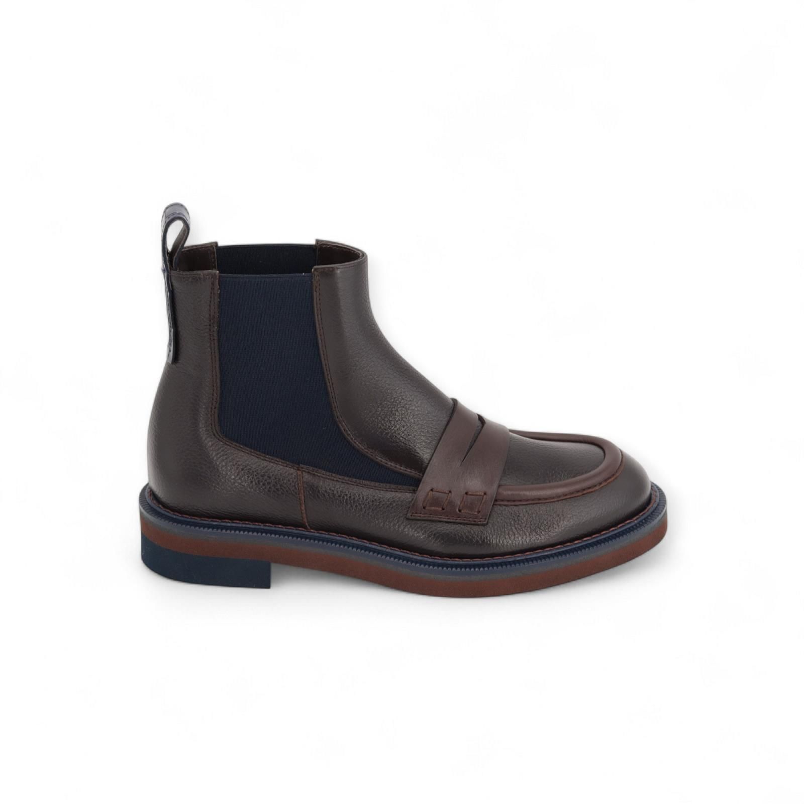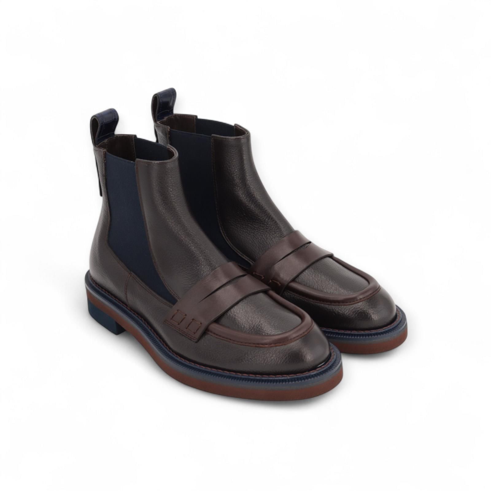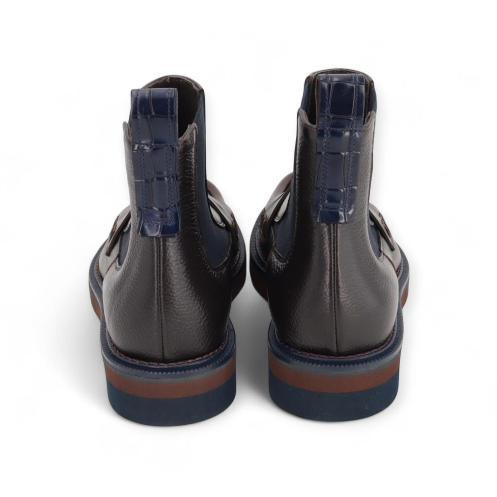 Enkellaars van Pertini voor dames. Deze mooi enkellaars is in bruin leer. Heeft een band en dikke stekking op de voorvoet. Is met zwarte rekkers aan de zijkant met hiellip voor het model makkelijk aan te trekken. Is op een mooi afgewerkte antislipzool met blauwe en cognac band.