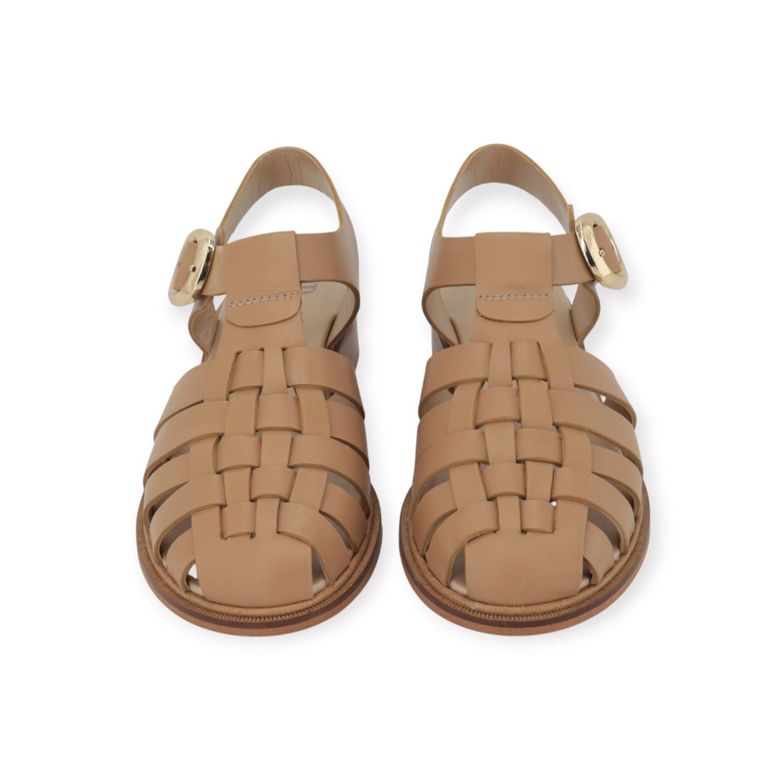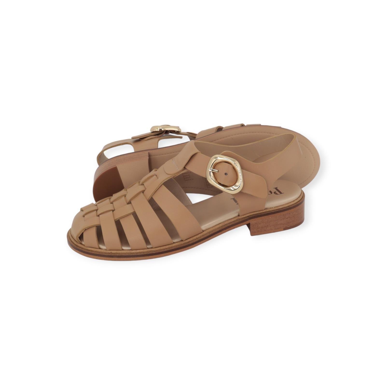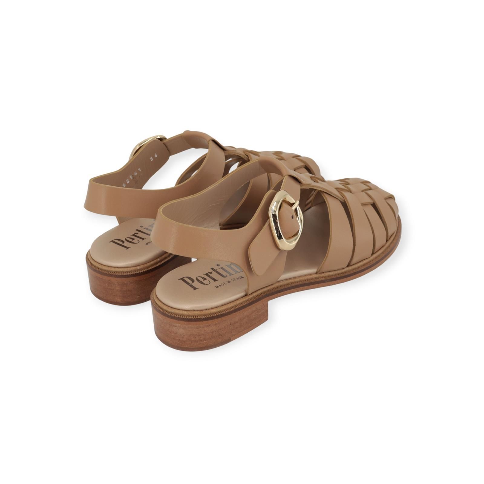 Sandaal van Pertini in beige leer. Dit elegant fijn sandaaltje is met geweven bandjes in een T-vorm. Blijft mooi vast aan de voet door de gouden gespsluiting aan de enkel. Heeft een antislip buitenzooltje.