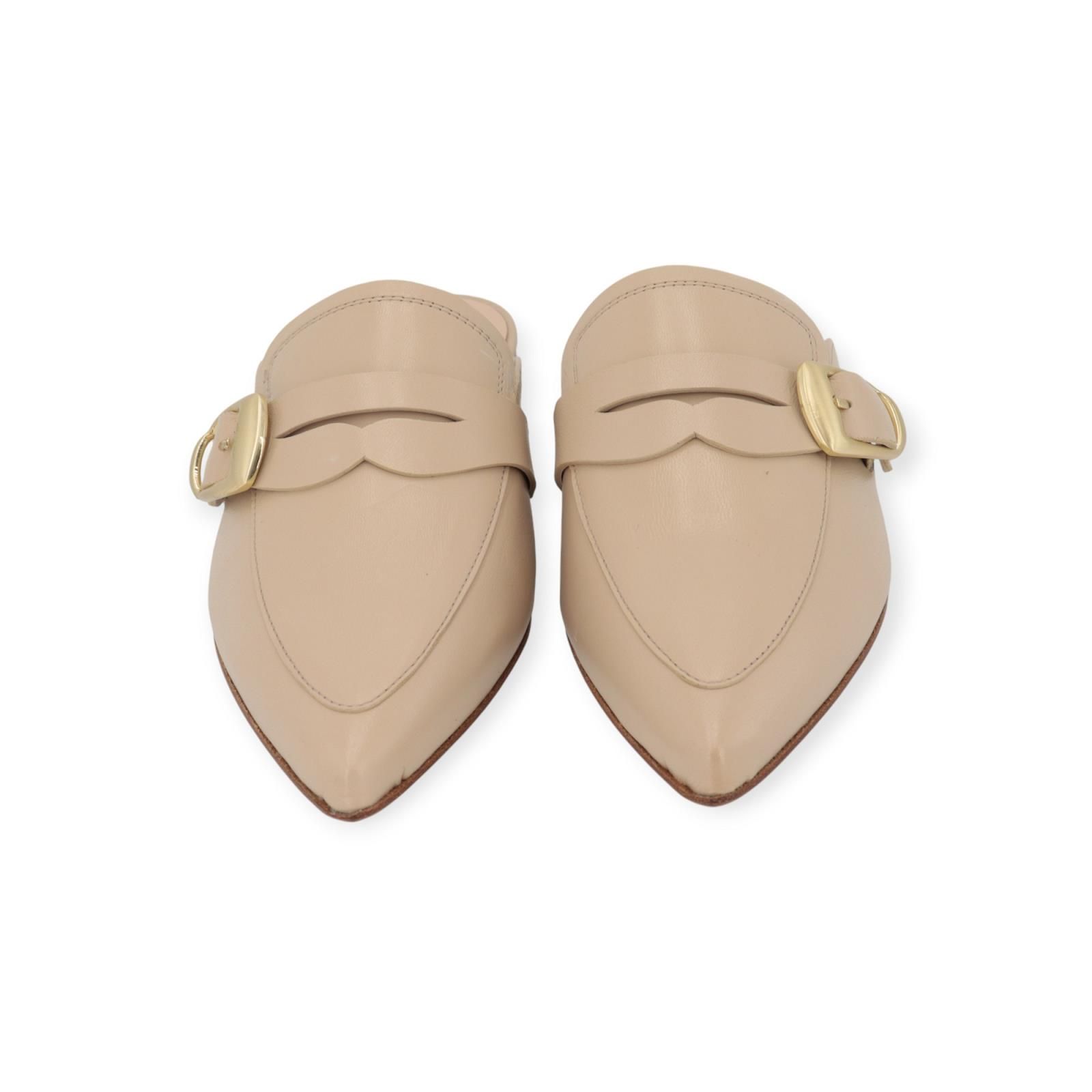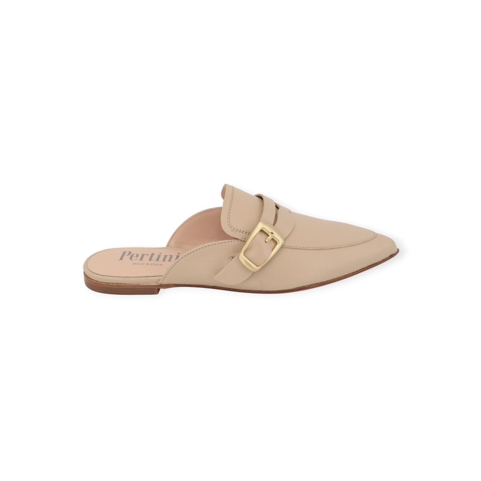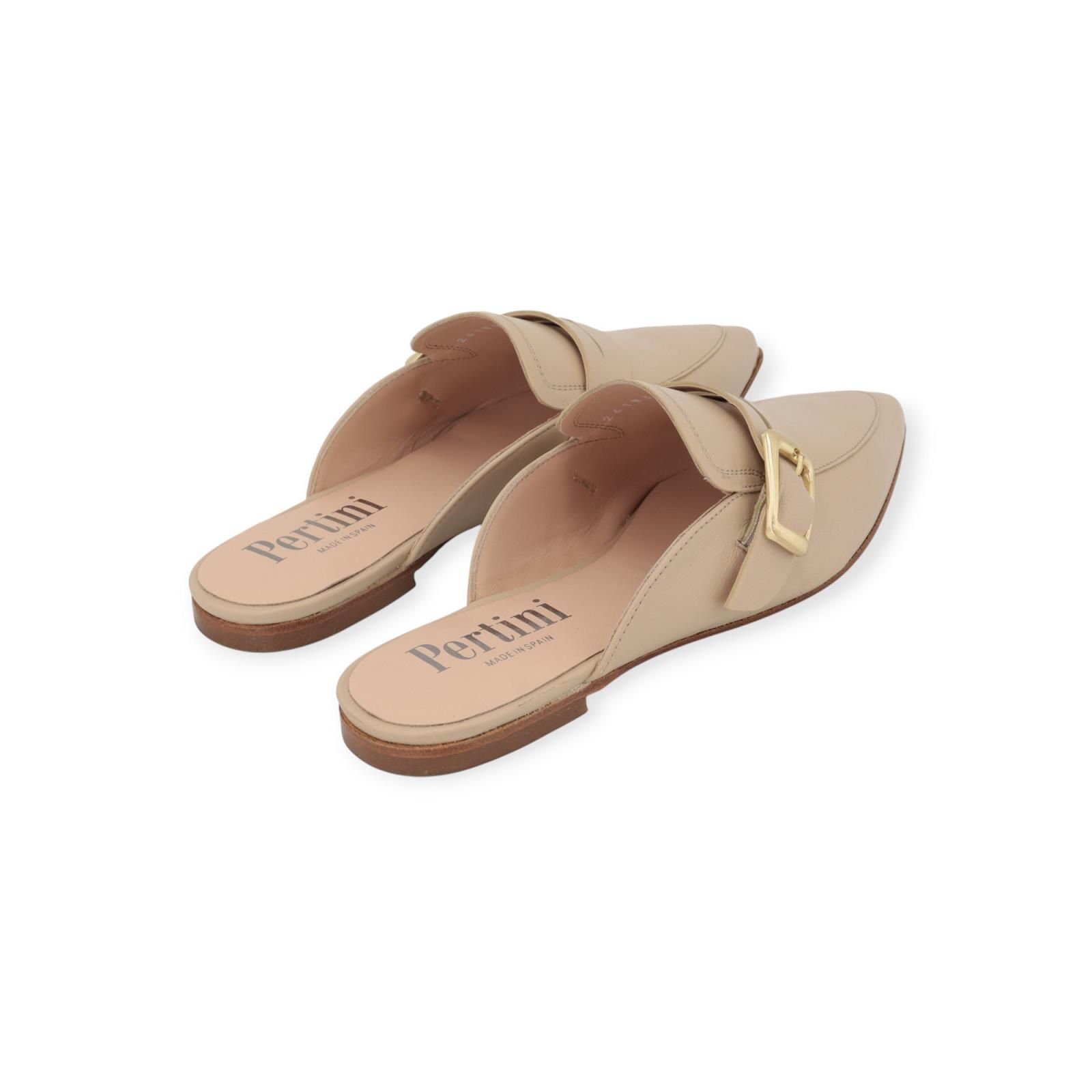 Muiltje van Pertini in beige leer. Dit elegant muiltje is in beige leer. Heeft een scherpe neus met een open hieltje. Op de wreef is een band met gouden gespsluiting. Is op een leren buitenzool.