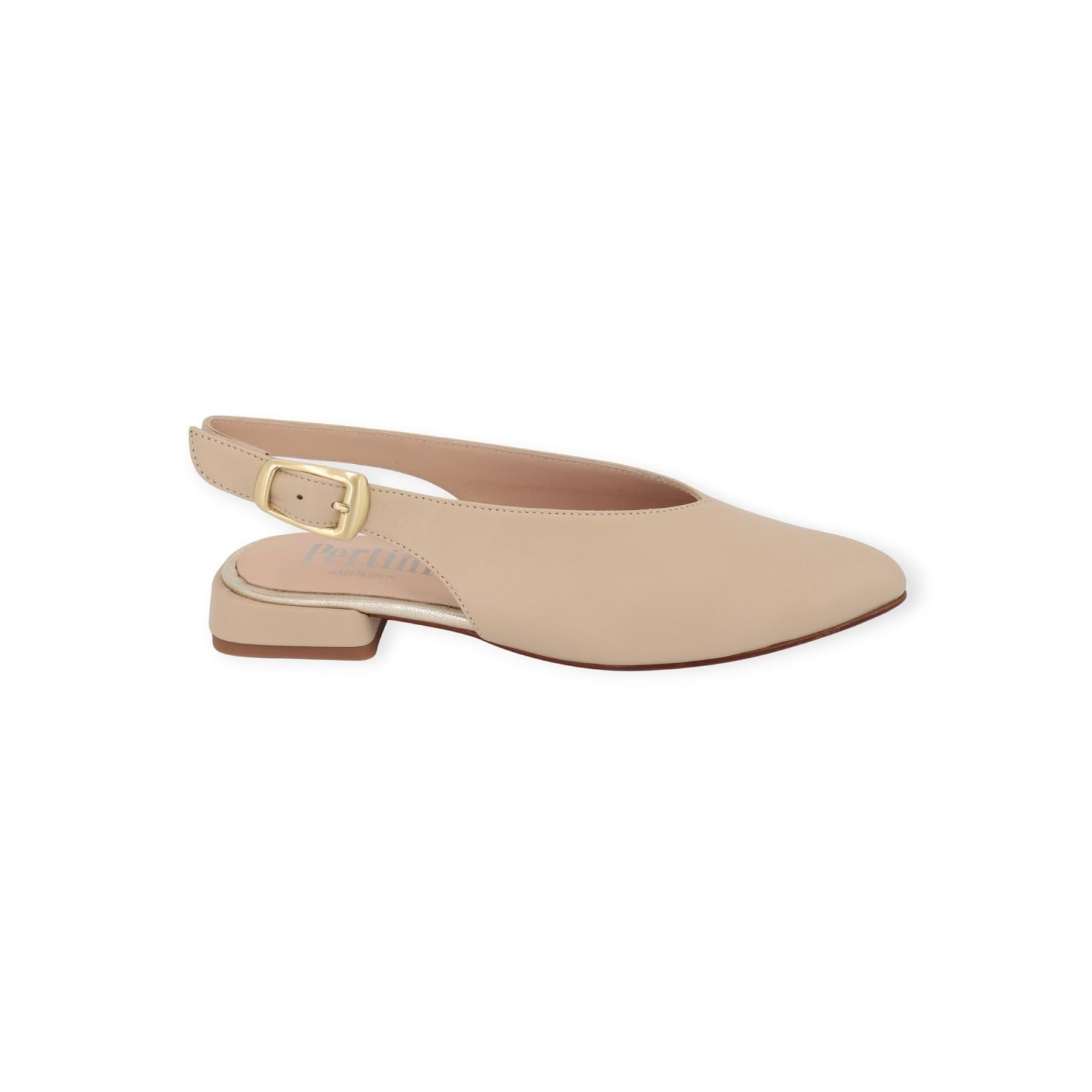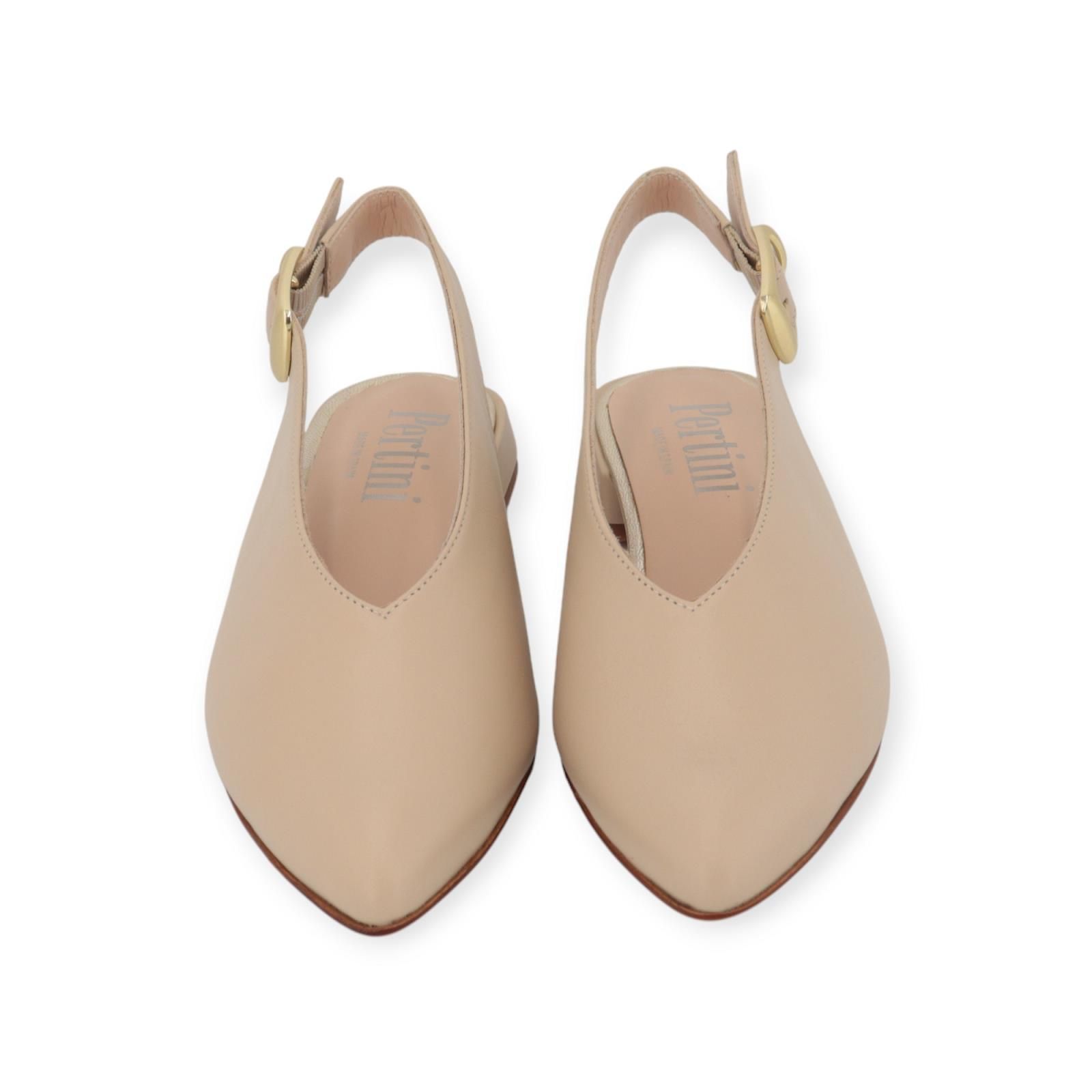 Ballerina van Pertini in beige leer. Dit elegant slingback model is in beige leer. Heeft een licht scherpe gesloten neus. De hiel is open en is afgesloten met een gespsluiting rond de hiel. Heeft een leren buitenzool.