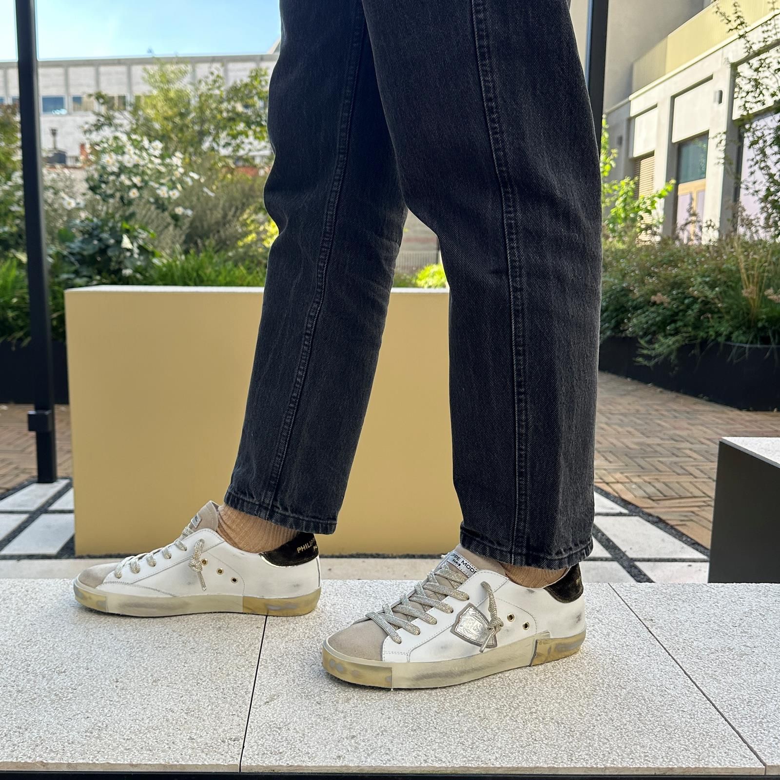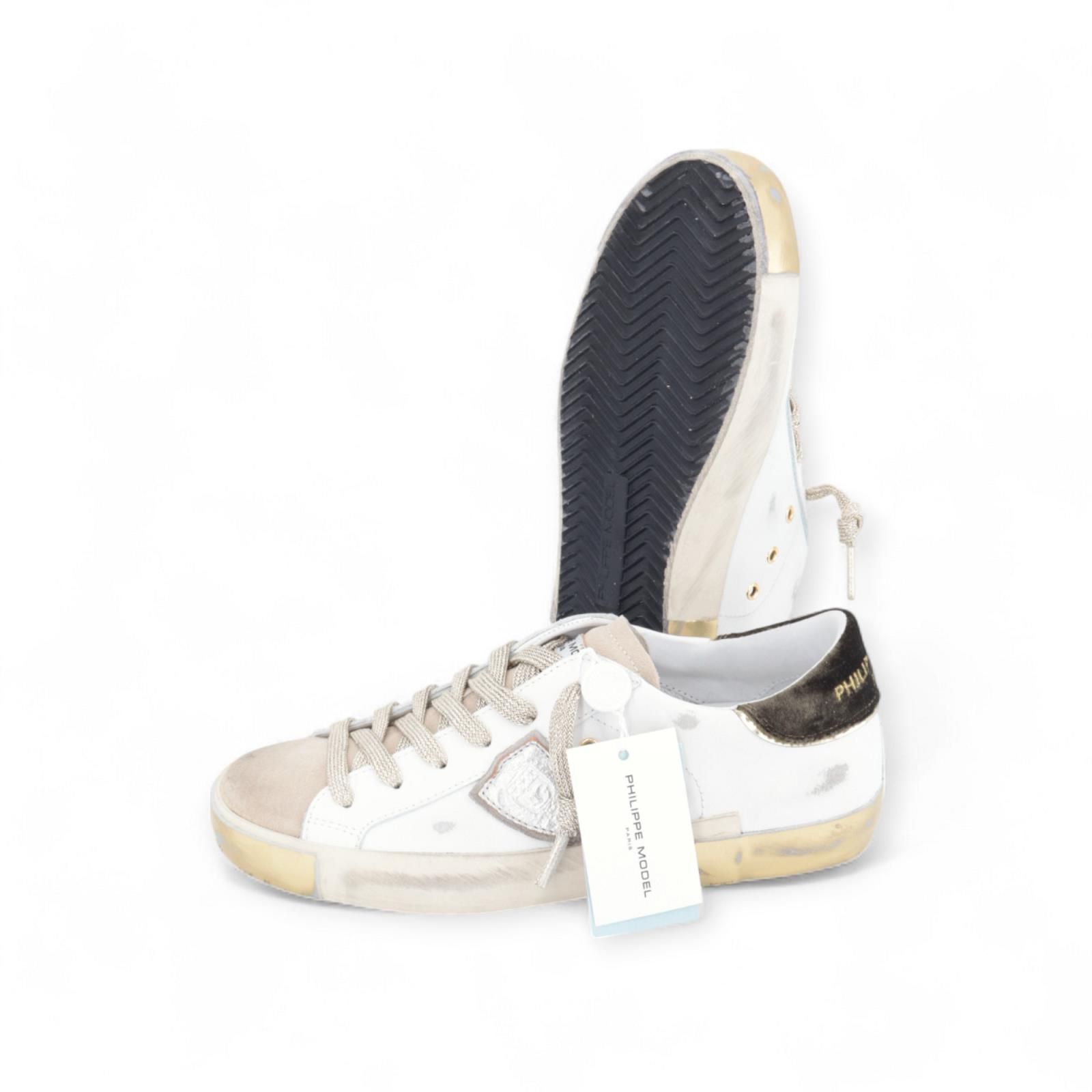 PRSX low sneaker van Philippe Model voor dames. Deze streetstyle sneaker is gemaakt van zacht wit kalfsleer en heeft een zeer soepele zool. Het gelamineerde kaki velours hiellipje en versleten afwerking completeren een model dat is ontworpen voor de coolste personen. De zool met asymmetrische, handgemaakte band in goud en shining veters geeft een iconisch tint aan het ontwerp. Dit model heeft een uitneembare zool.