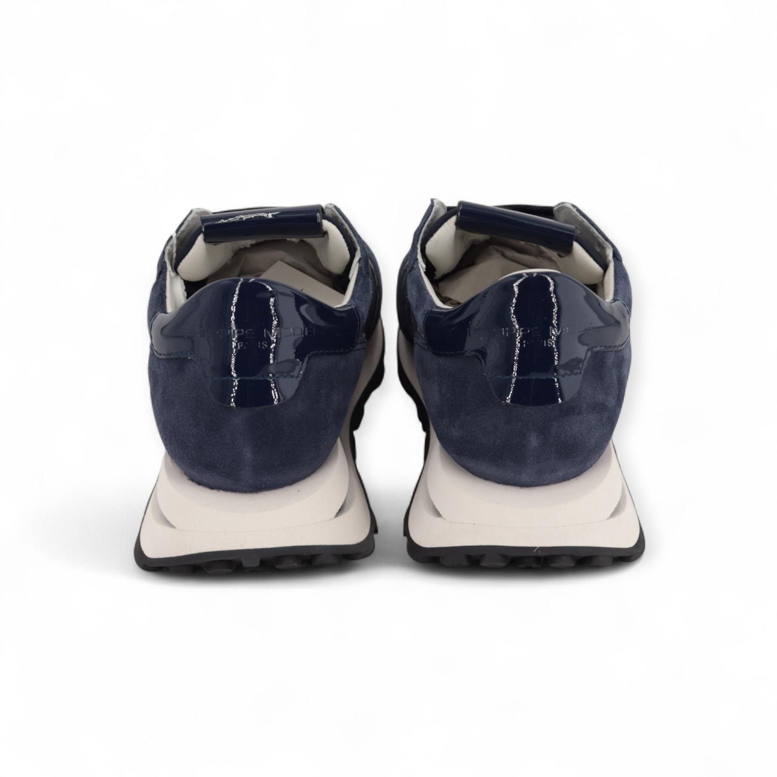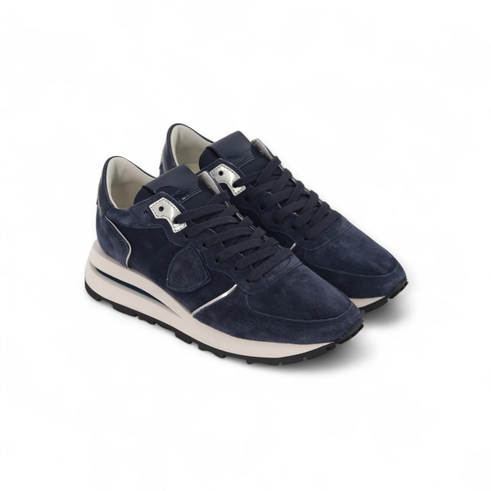 Sneaker Tropez Haute Low van Philippe Model voor dames. Deze blauwe runner in suède is het meest elegante kleur! Afgewerkt met zilver en het blauw lakleer aan de hielflap en het Philippe Model schild aan de zijkant. Is op een zool van ultralicht rubber met een uitstulping op de hiel een een contrasterend inzetstuk voor een 3D-effect. Heeft een uitneembare binnenzool.