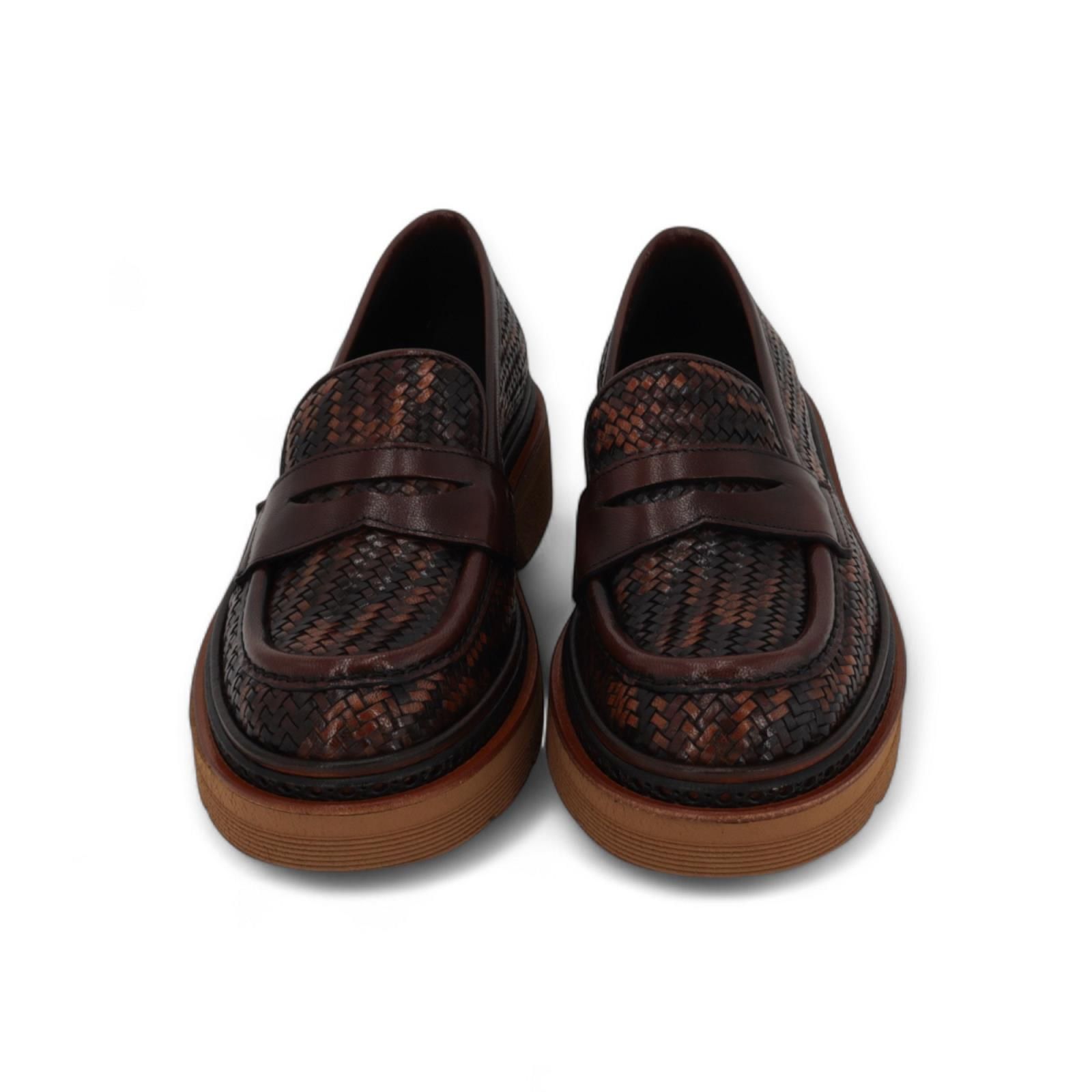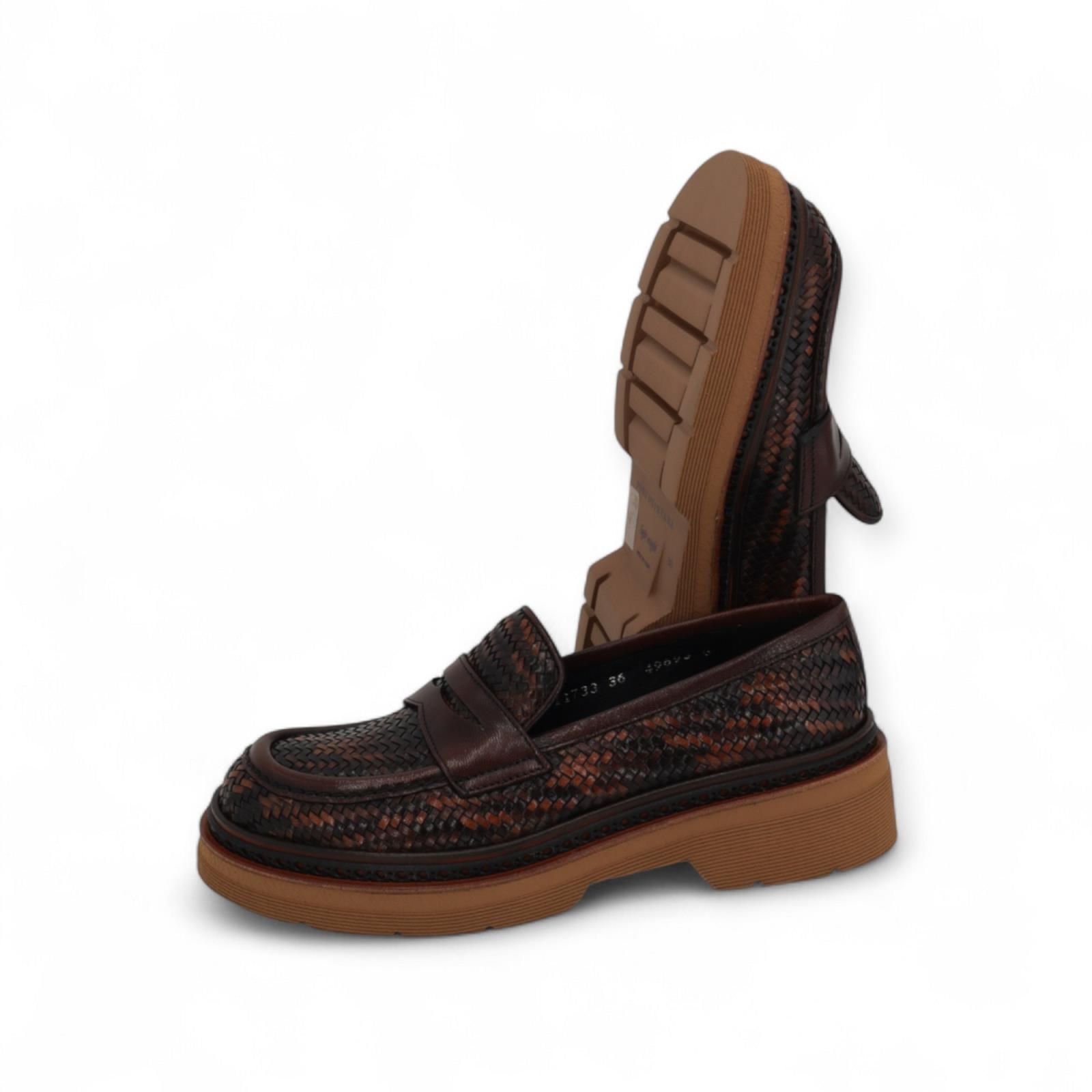Mocassin Seline van Pons Quintana voor dames. Deze prachtige mocassin is in bruine tinten tressée leer. Dit model is in fijner geweven tressée. Heeft een band over de wreef met een bruine rand. Is op een dikke beige antislipzool.