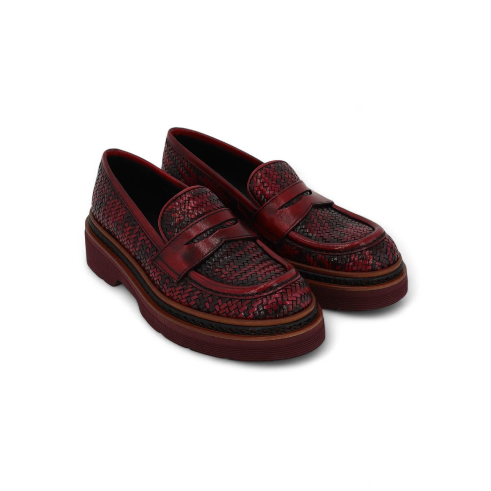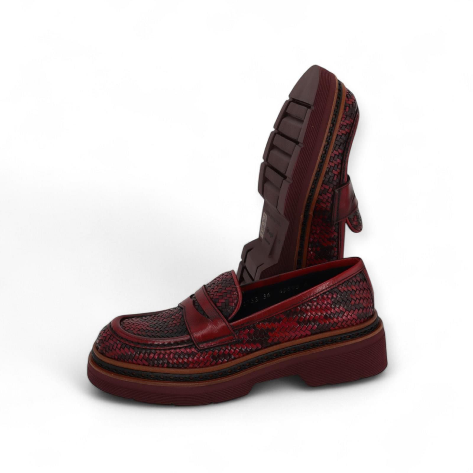 Mocassin Seline van Pons Quintana voor dames. Deze prachtige mocassin is in warme tinten rood / bordeaux tressée leer. Dit model is in fijner geweven tressée. Heeft een band over de wreef met een bruine rand. Is op een dikke beige antislipzool.