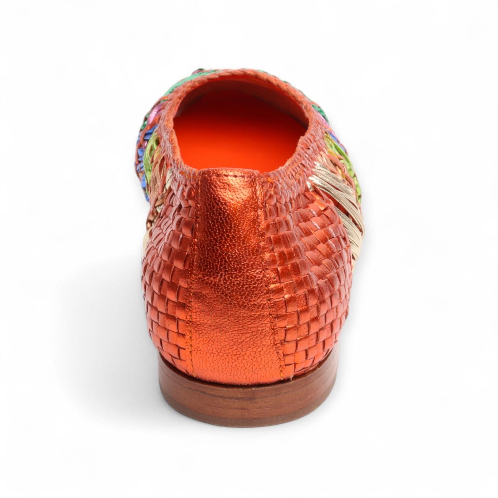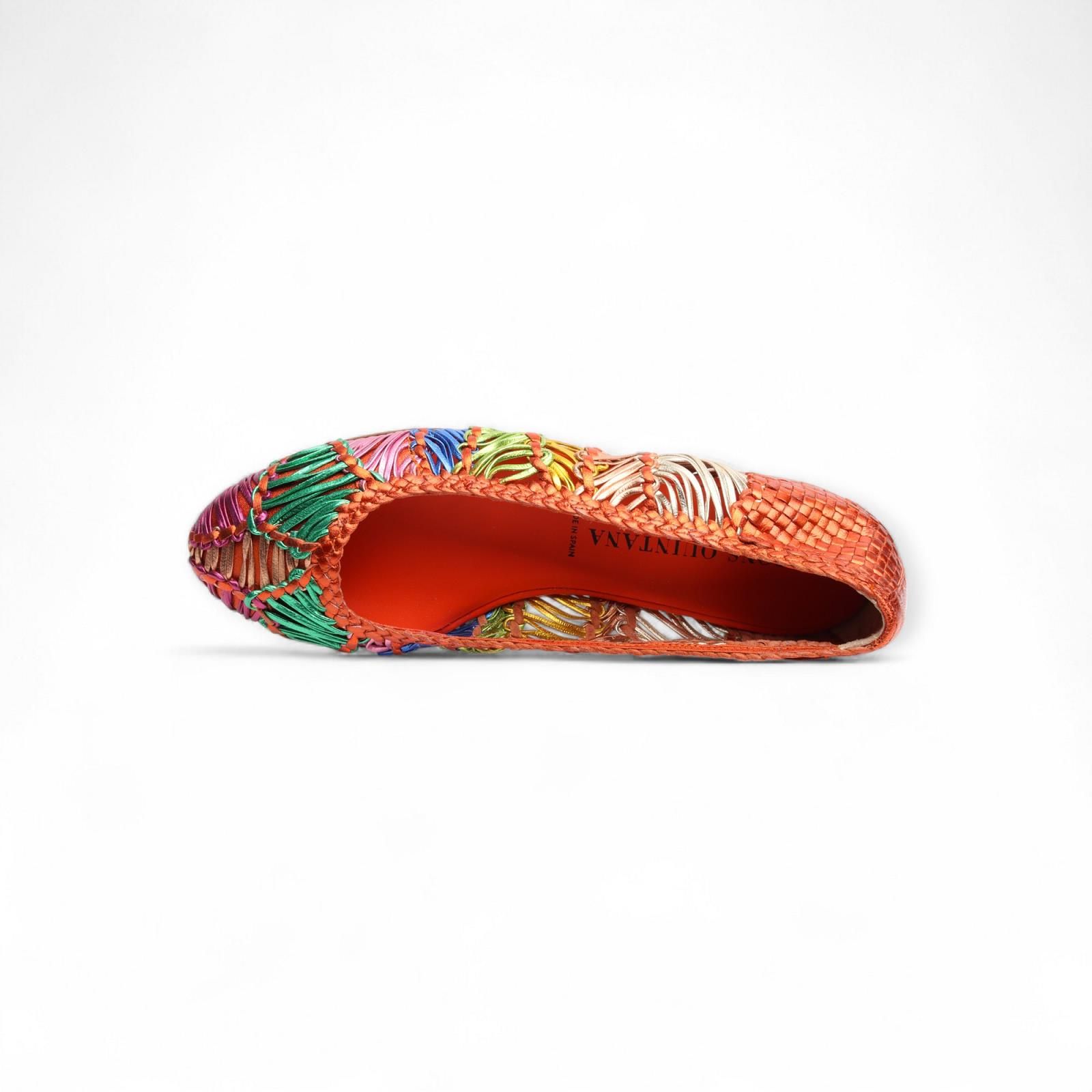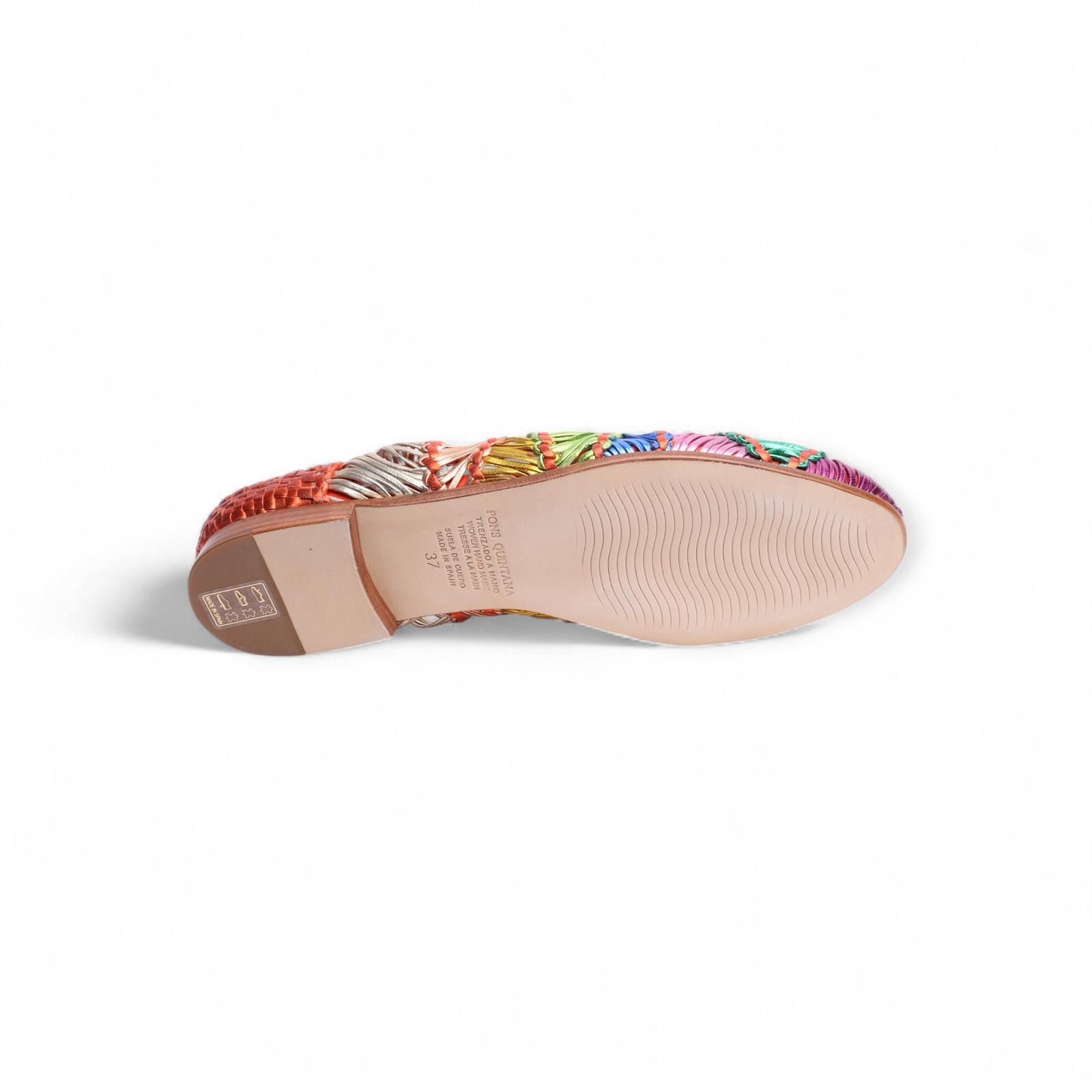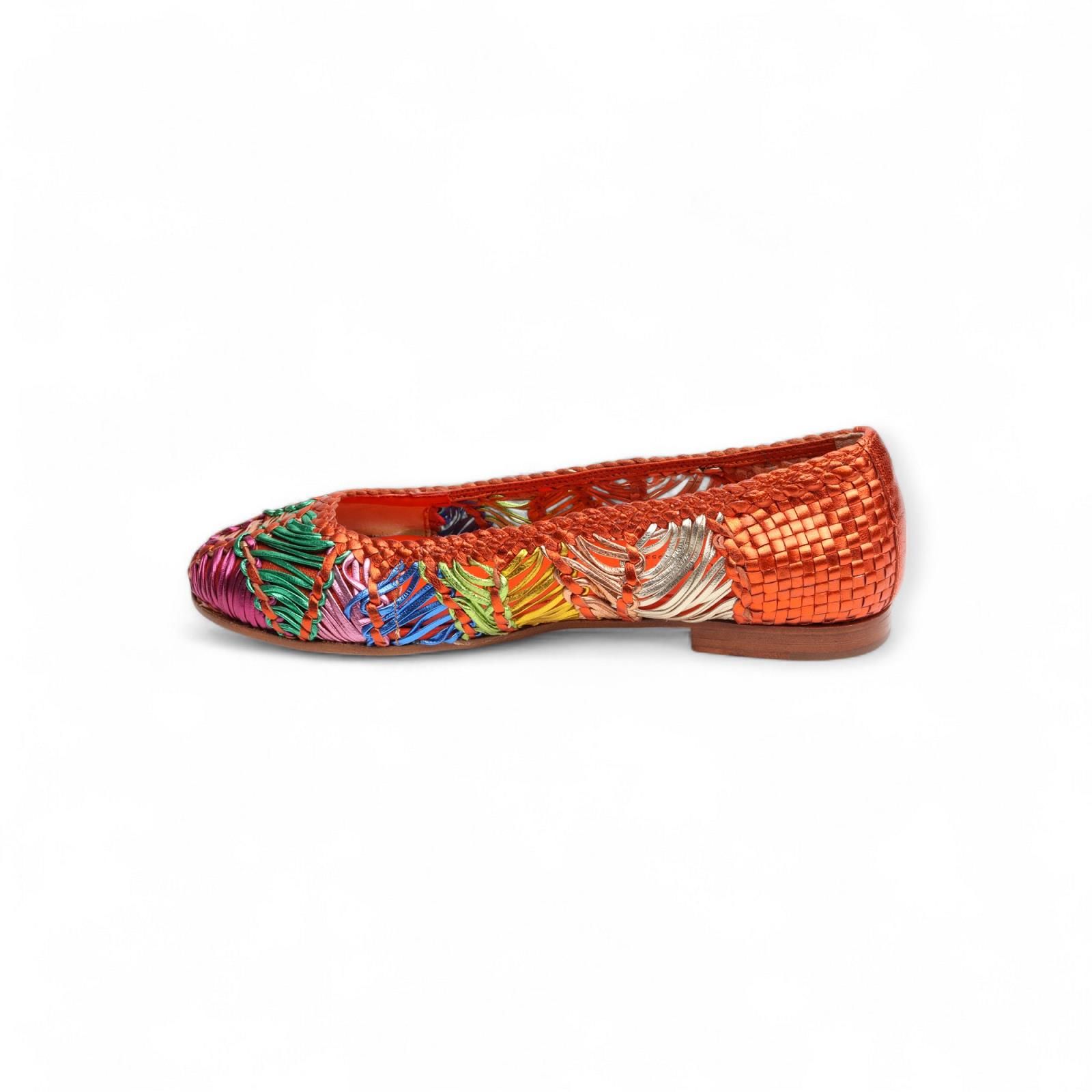 Ballerina Athena van Pons Quintana voor dames. Deze ballerina is in prachtige metalissé kleuren in gevlochten tressé leder. Heeft een ronde neus en een buitenzool in leer met een heel klein hakje.