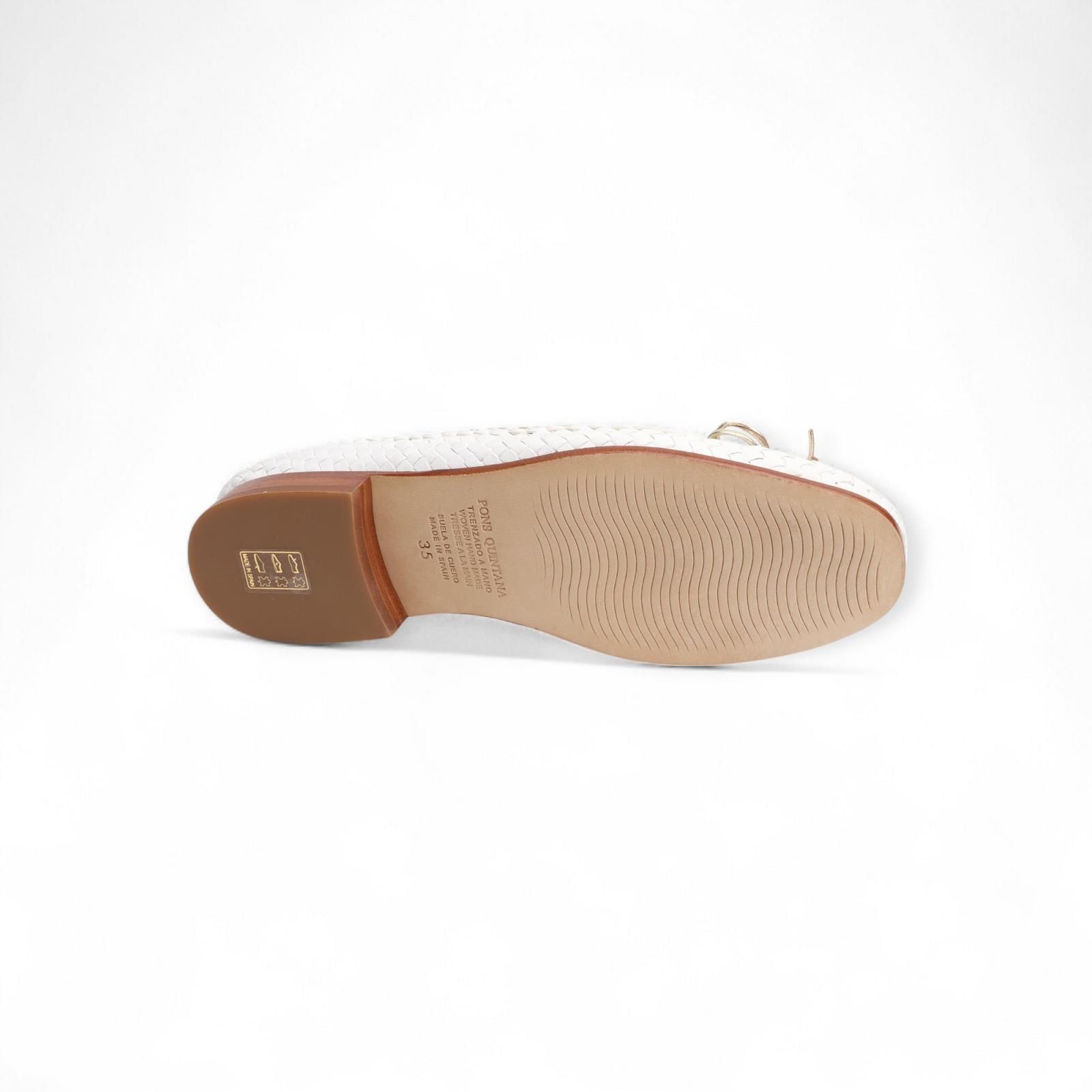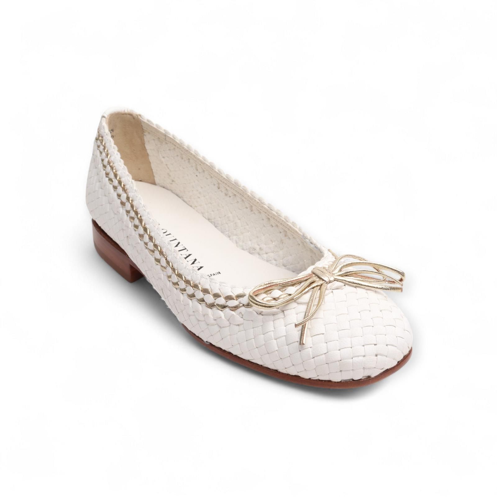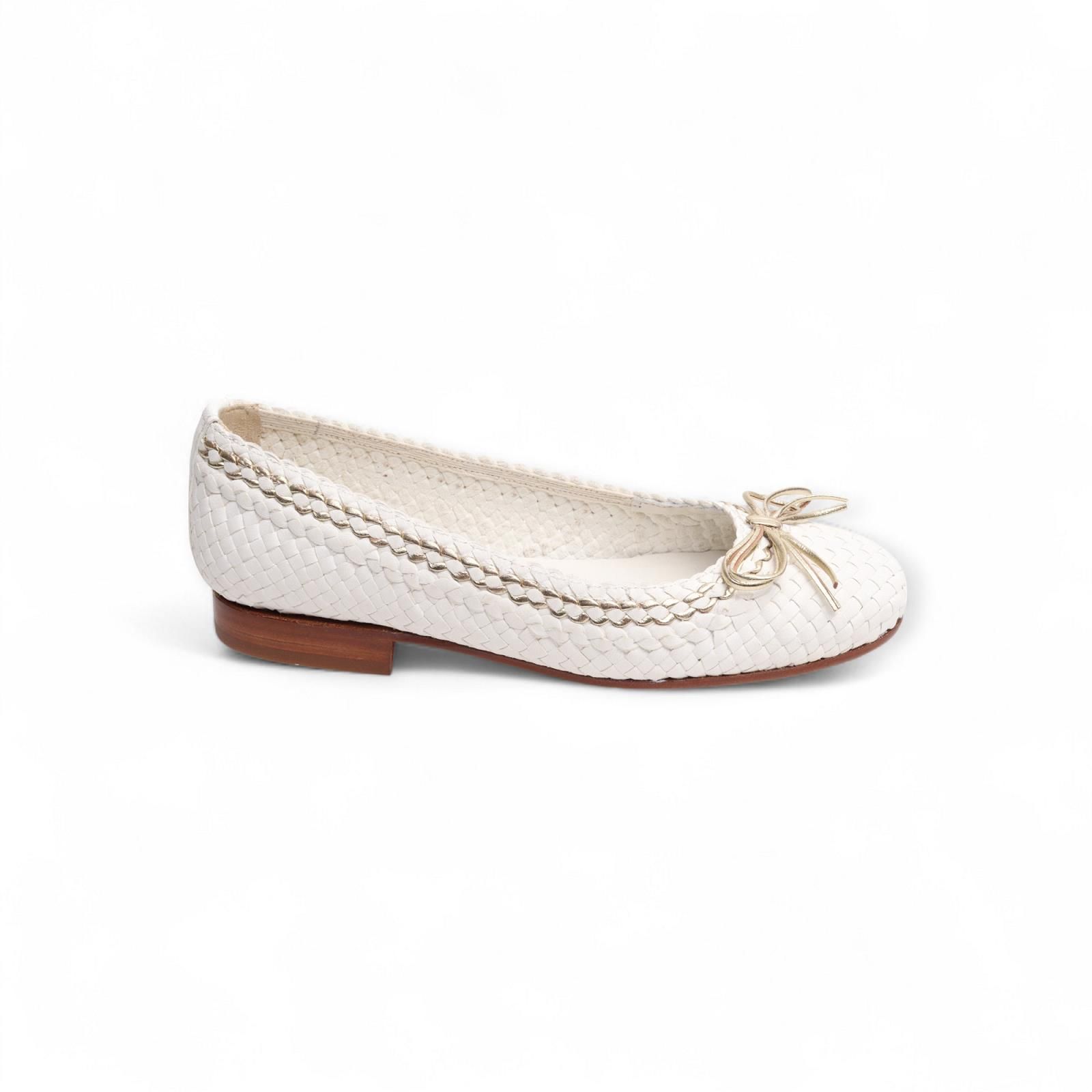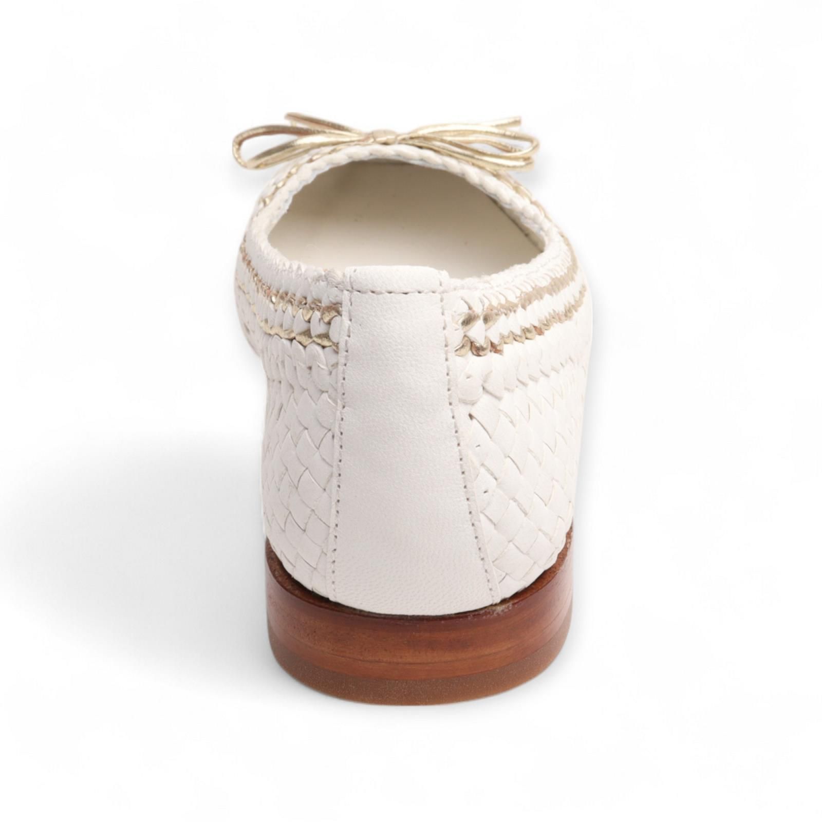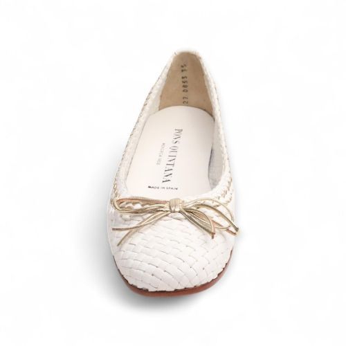 Ballerina Athena van Pons Quintana voor dames. Dit elegant ballerina is in off wit gevlochten tressé leder. Heeft een gouden strik en stiksel rond de hals. Is op een lederen buitenzool.