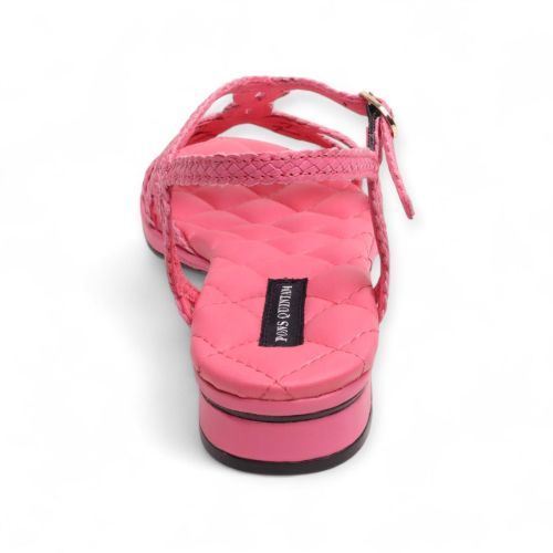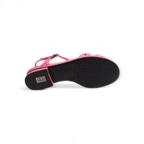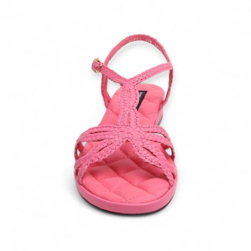 Sandaal Diana van Pons Quintana voor dames. Dit elegant sandaaltje is in roze met de hand gevlochten leer. Heeft een halfronde neus en diverse bandjes rond de voet. Blijft mooi aan de enkel door de gespsluiting. Heeft een antislip buitenzool en een gewatterde binnenzool.