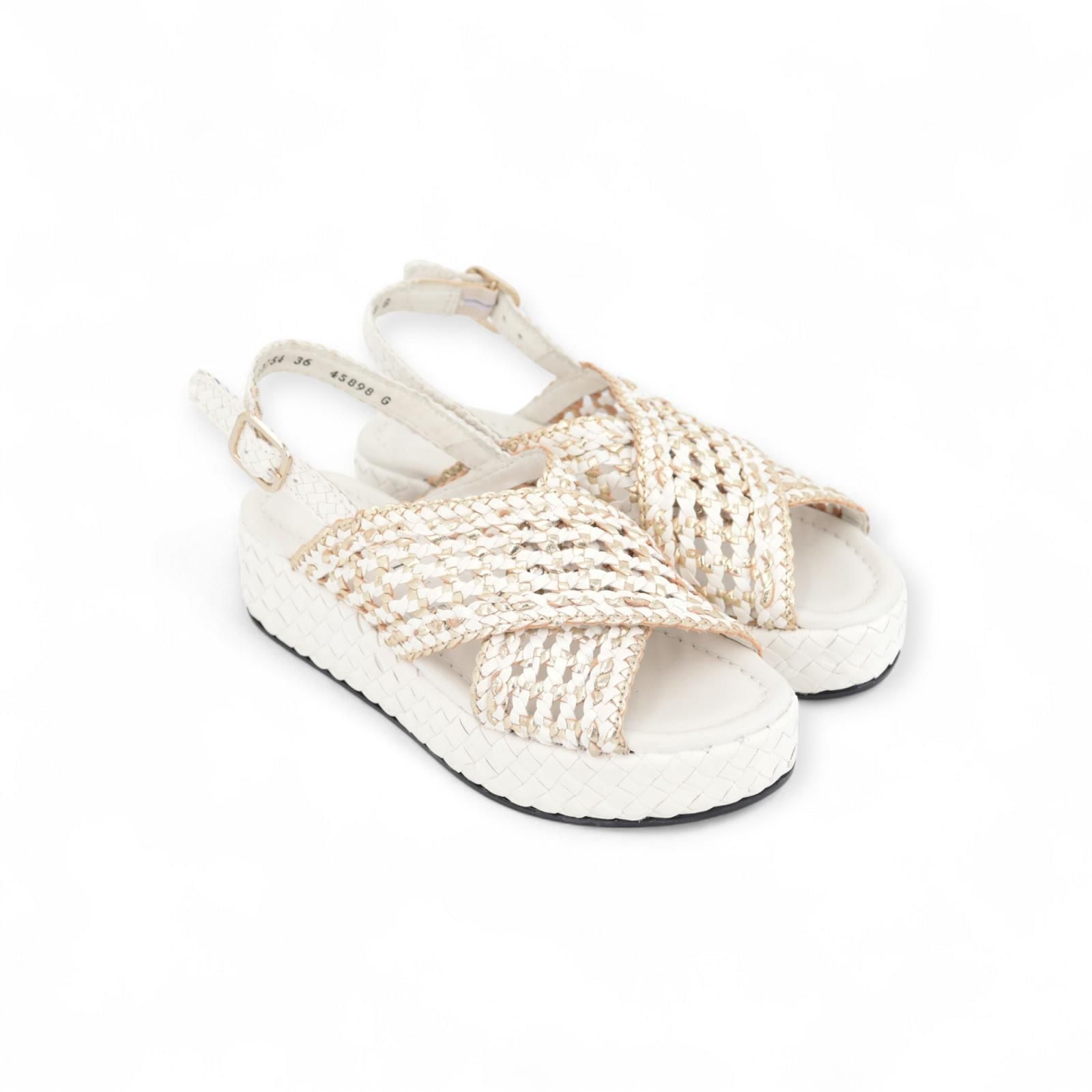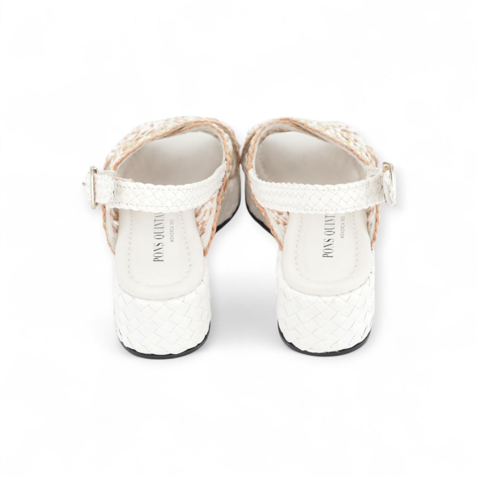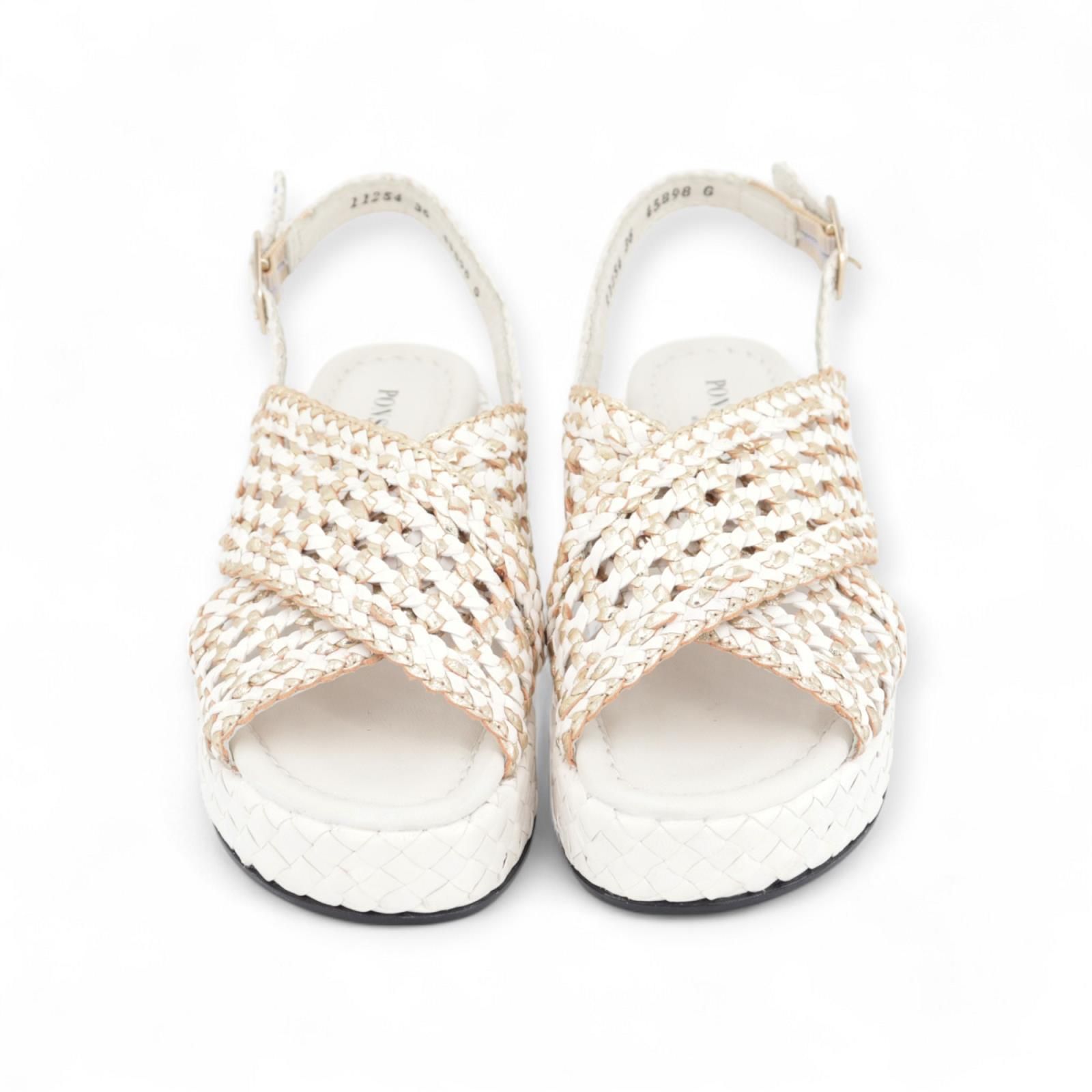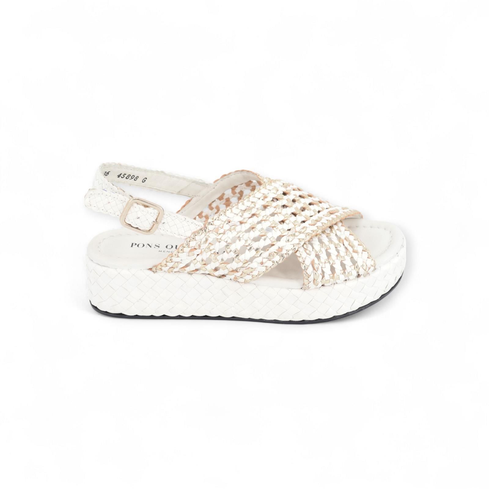 Pons Quintana Forli sandaal voor dames. Deze witte sandaal is in tressé leder met een gekruiste band over de wreef die geperforeerd is met goud kleur. Is op een sleehak in wit vlechtwerk. Pons Quintana sandalen staan gekend voor hun bijzonder comfort.