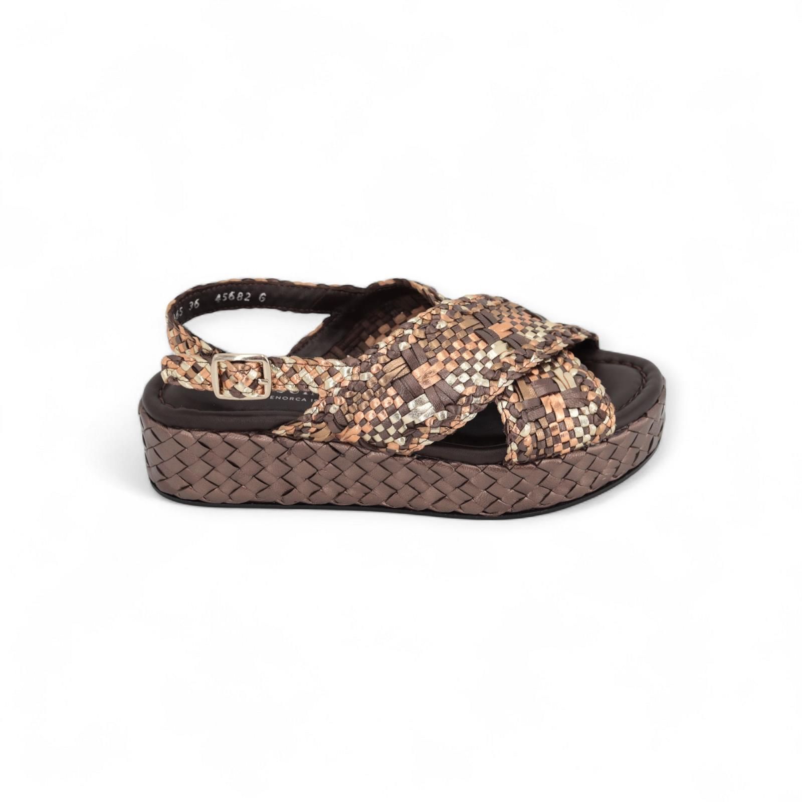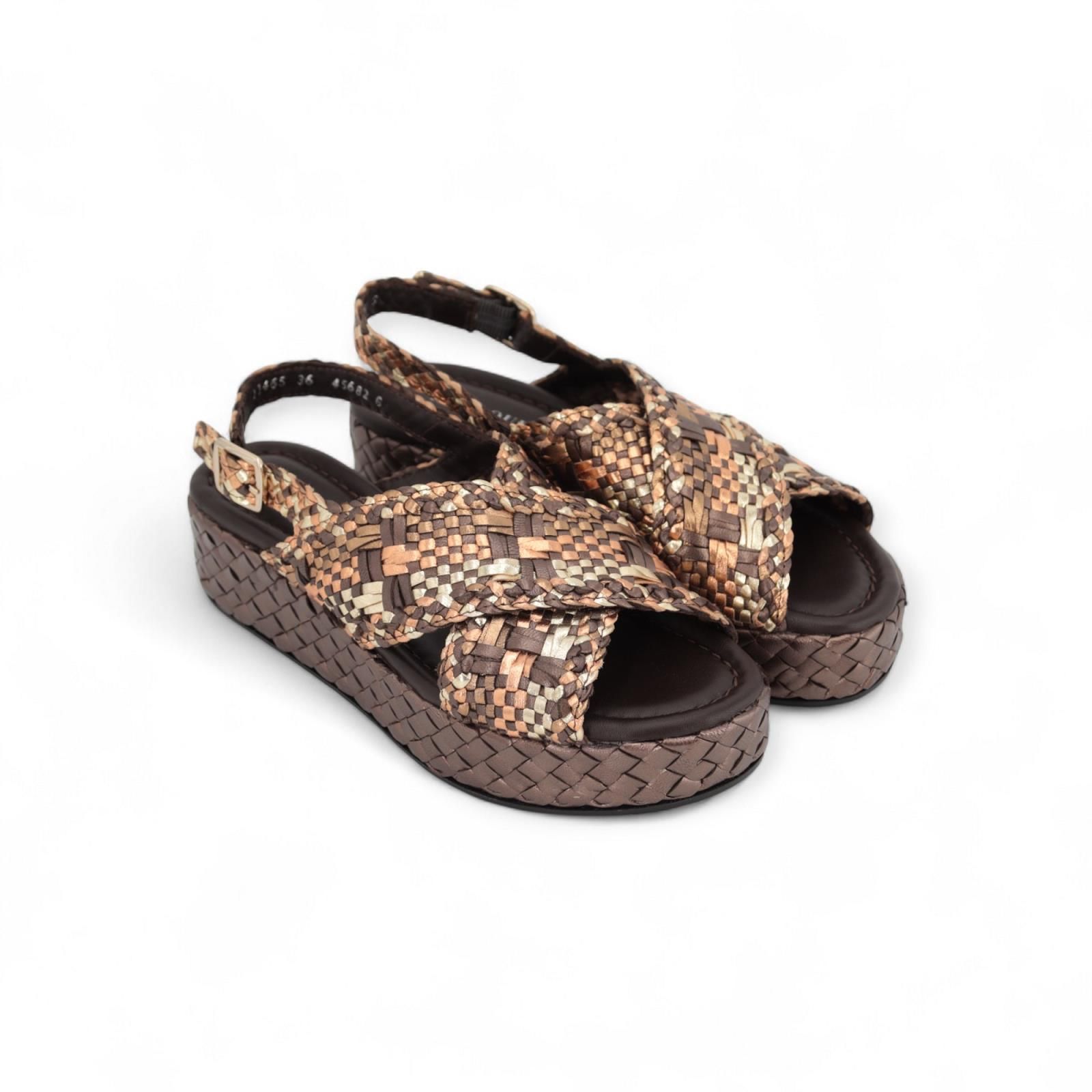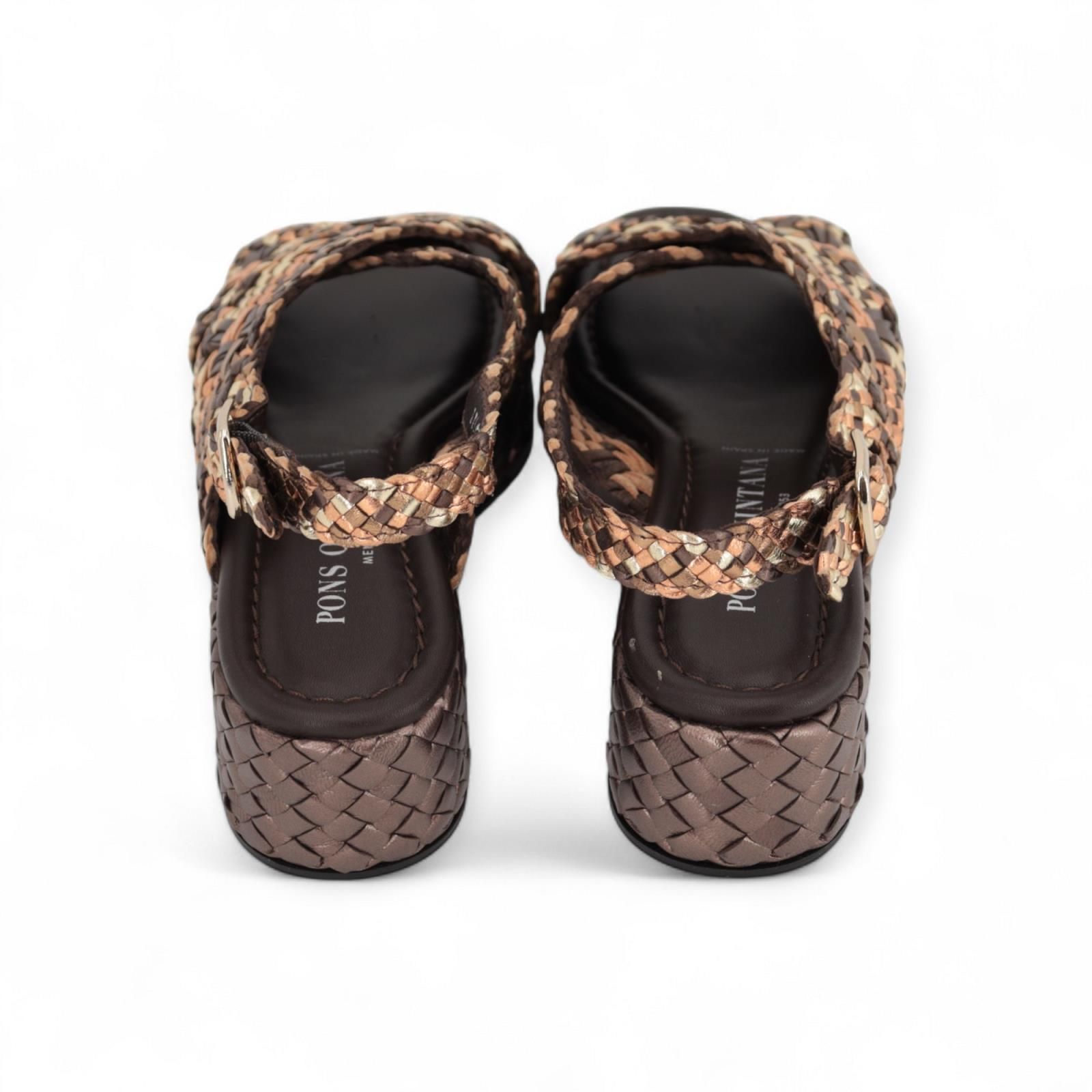 Pons Quintana Forli sandaal voor dames. Deze multi brons sandaal is in tressé leder met een gekruiste band over de wreef in verschillende geruite kleuren. Afgewerkt met een plateauzool in brons vlechtwerk. Pons Quintana sandalen staan gekend voor hun bijzonder comfort.