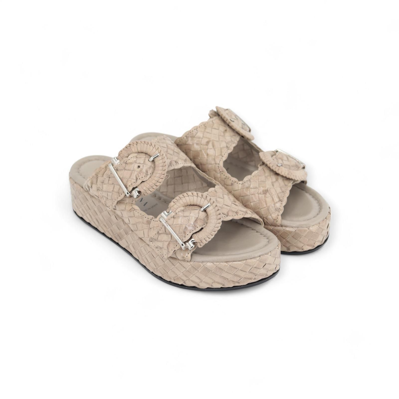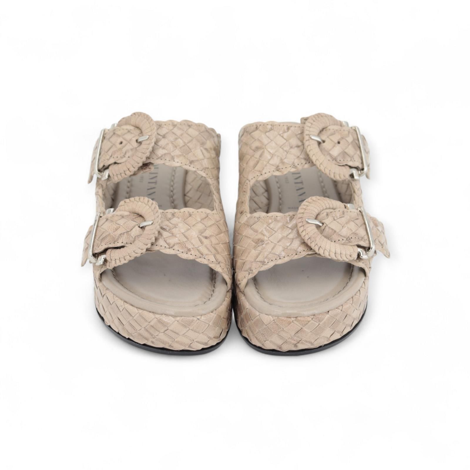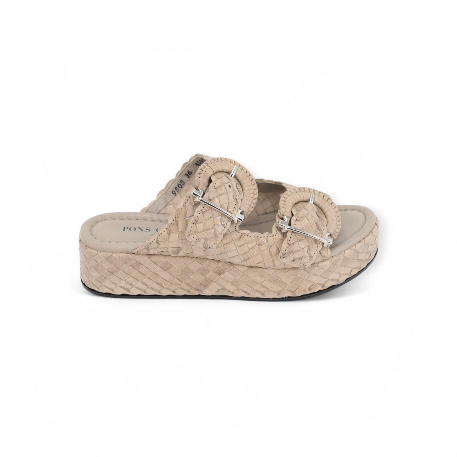 Pons Quintana Forli slipper voor dames. Deze slipper is op een lichte sleehak. Heeft 2 banden over de wreef die je kan aanpassen naar breedte door de gespsluiting. Is zeer mooi afgewerkt in taupe vlechtwerk / tressée.