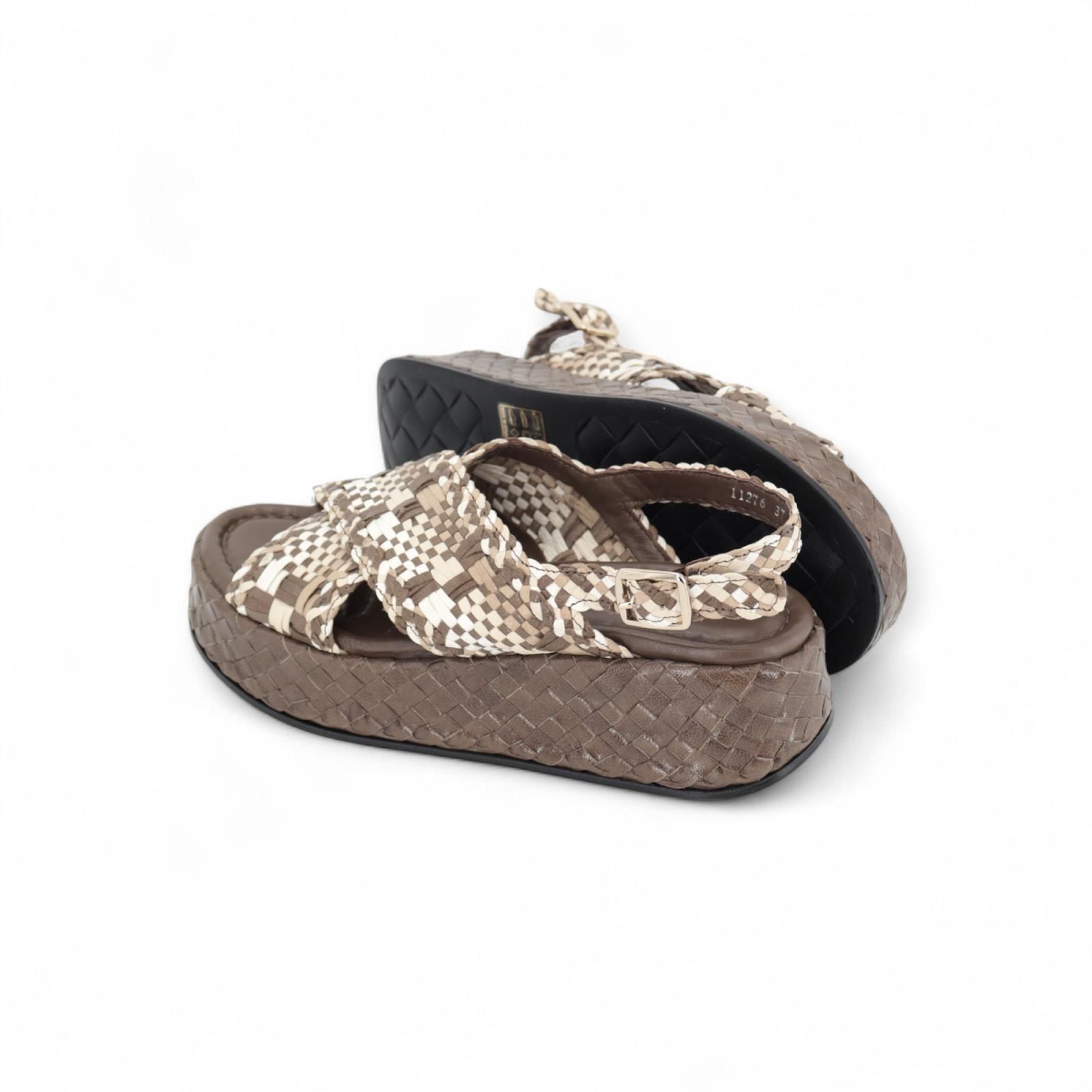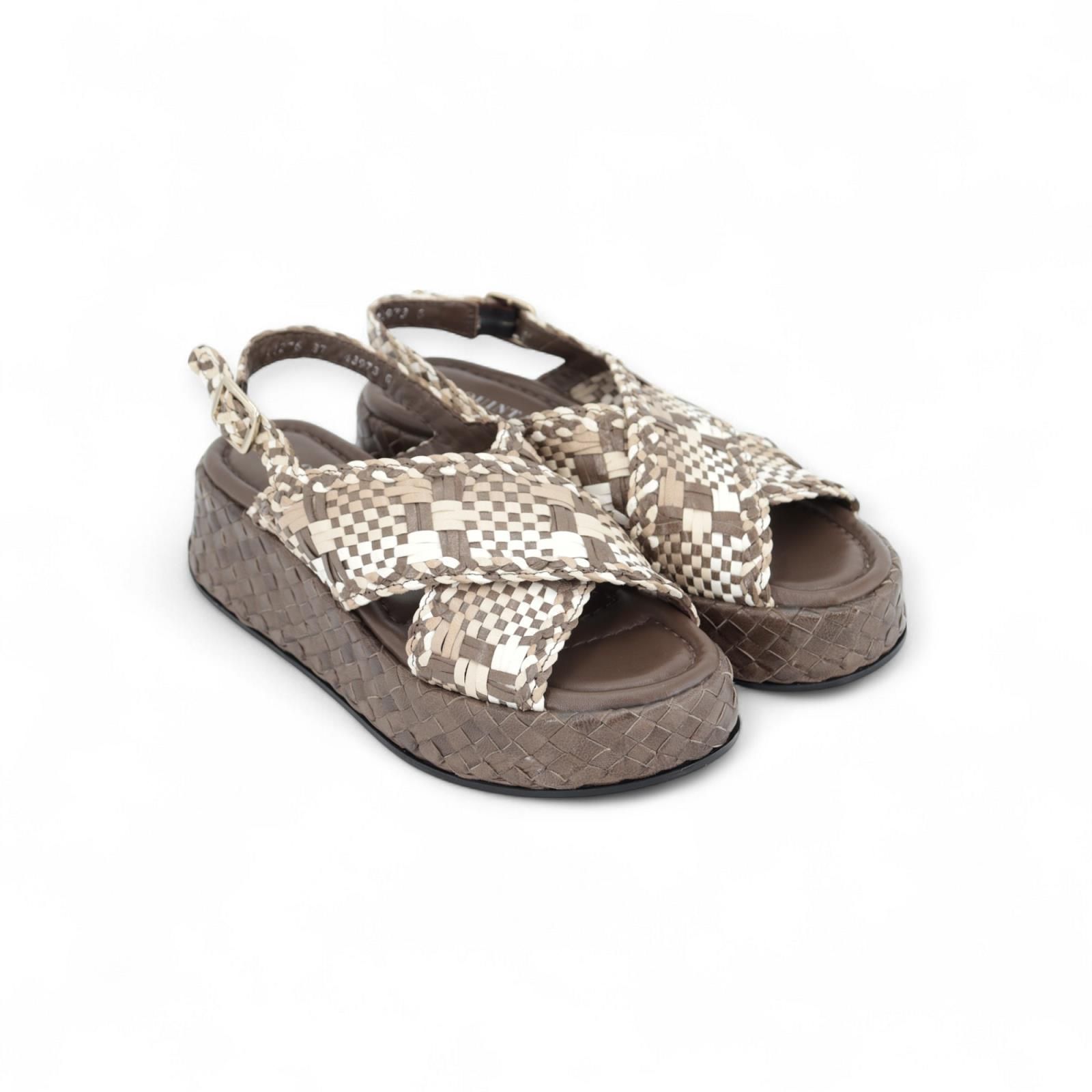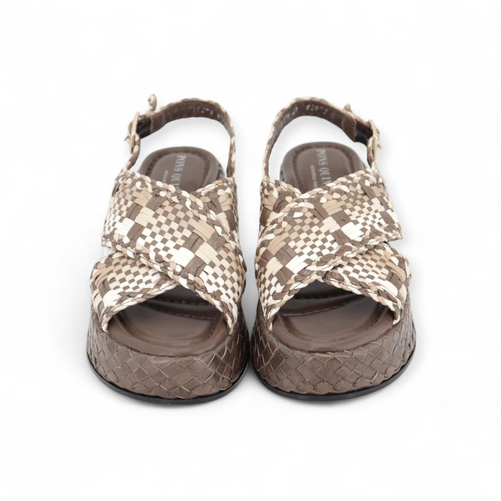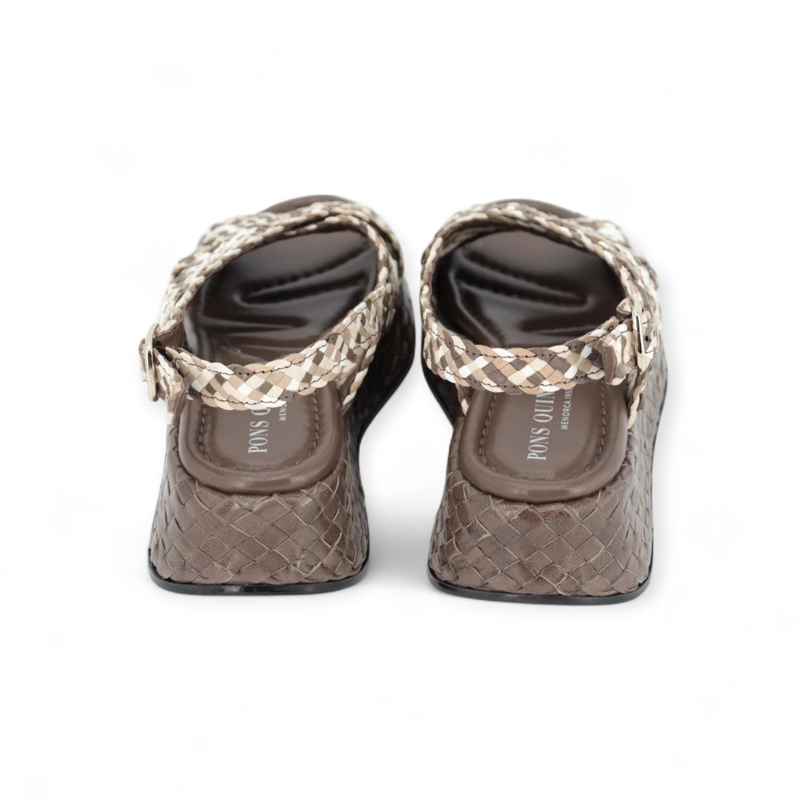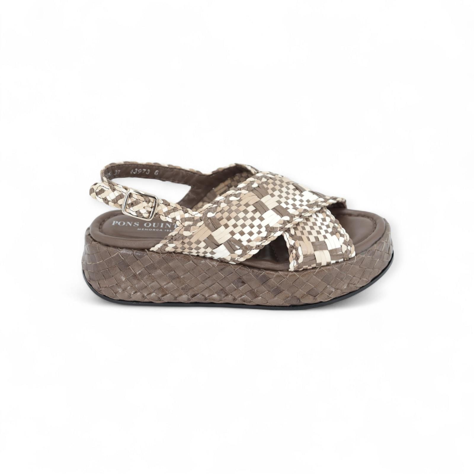 Pons Quintana Maui sandaal voor dames. Deze taupe sandaal is in tressé leder met een gekruiste band over de wreef in verschillende geruite kleuren. Afgewerkt met een plateauzool in taupe vlechtwerk. Pons Quintana sandalen staan gekend voor hun bijzonder comfort.