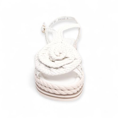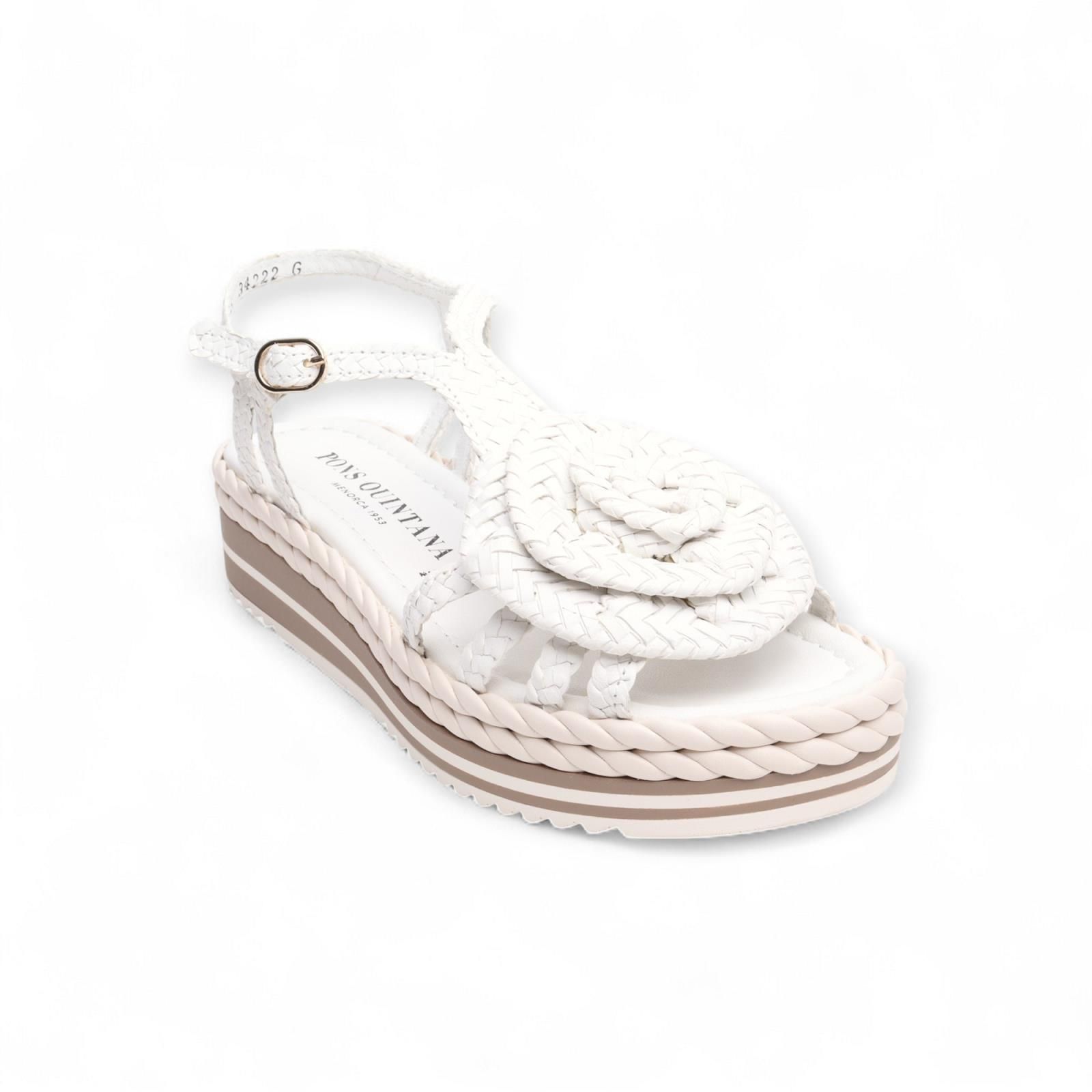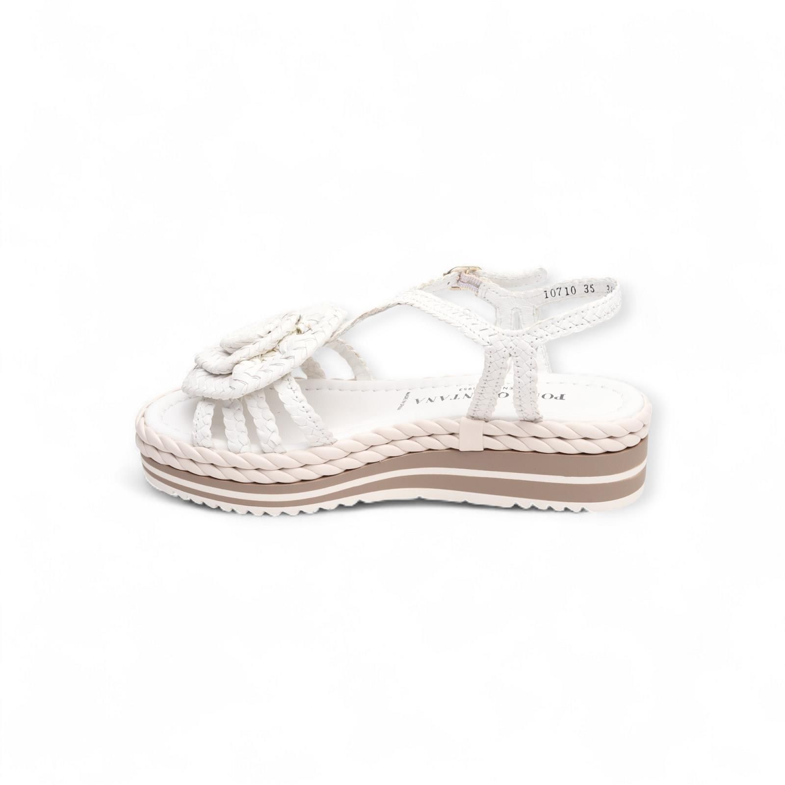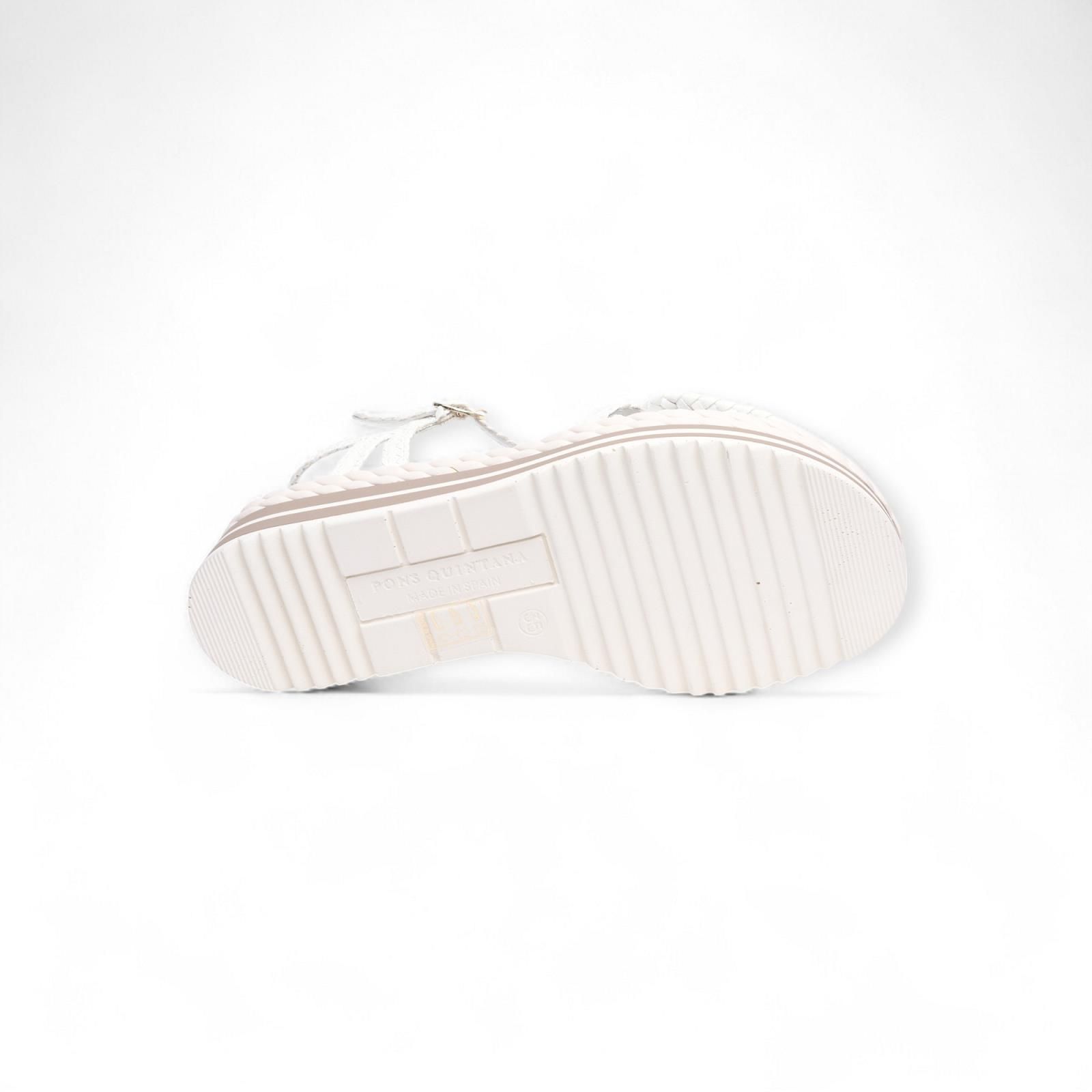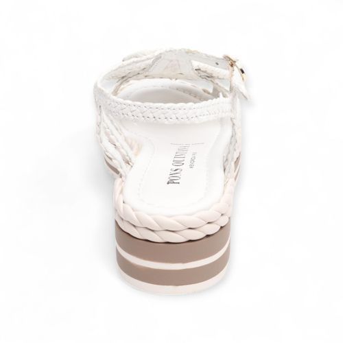 Sandaal Milan van Pons Quintana voor dames. Deze sandaal is in wit tressé leder fijne bandjes over de hele wreef. Heeft als extra detail een gevlochten bloem over de bandjes. Is afgesloten met een gespsluiting. Is op een harmonieuze tweekleurige zool die versterkt is met een rand van natuurlijke jute. Pons Quintana is de perfecte balans tussen comfort en elegantie.