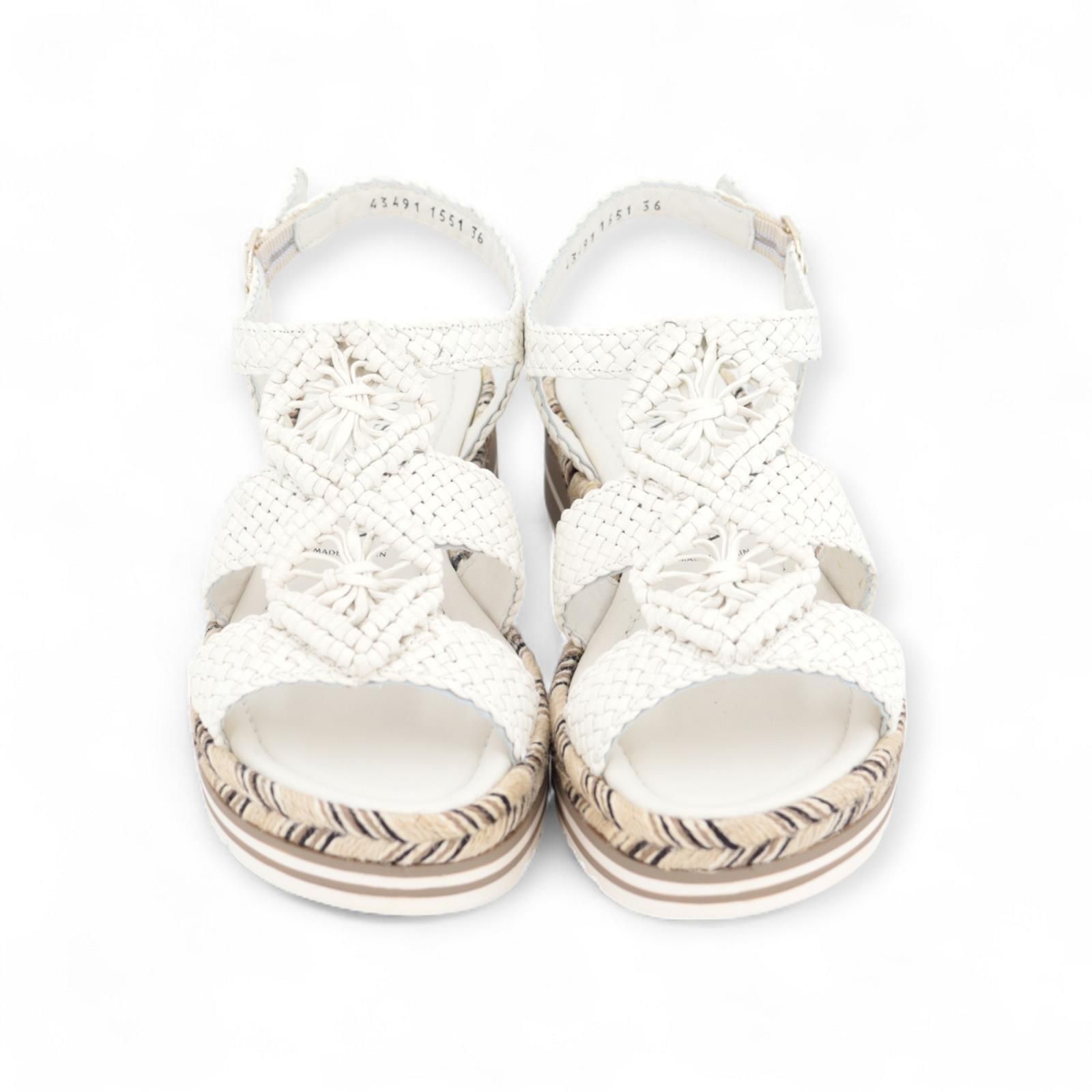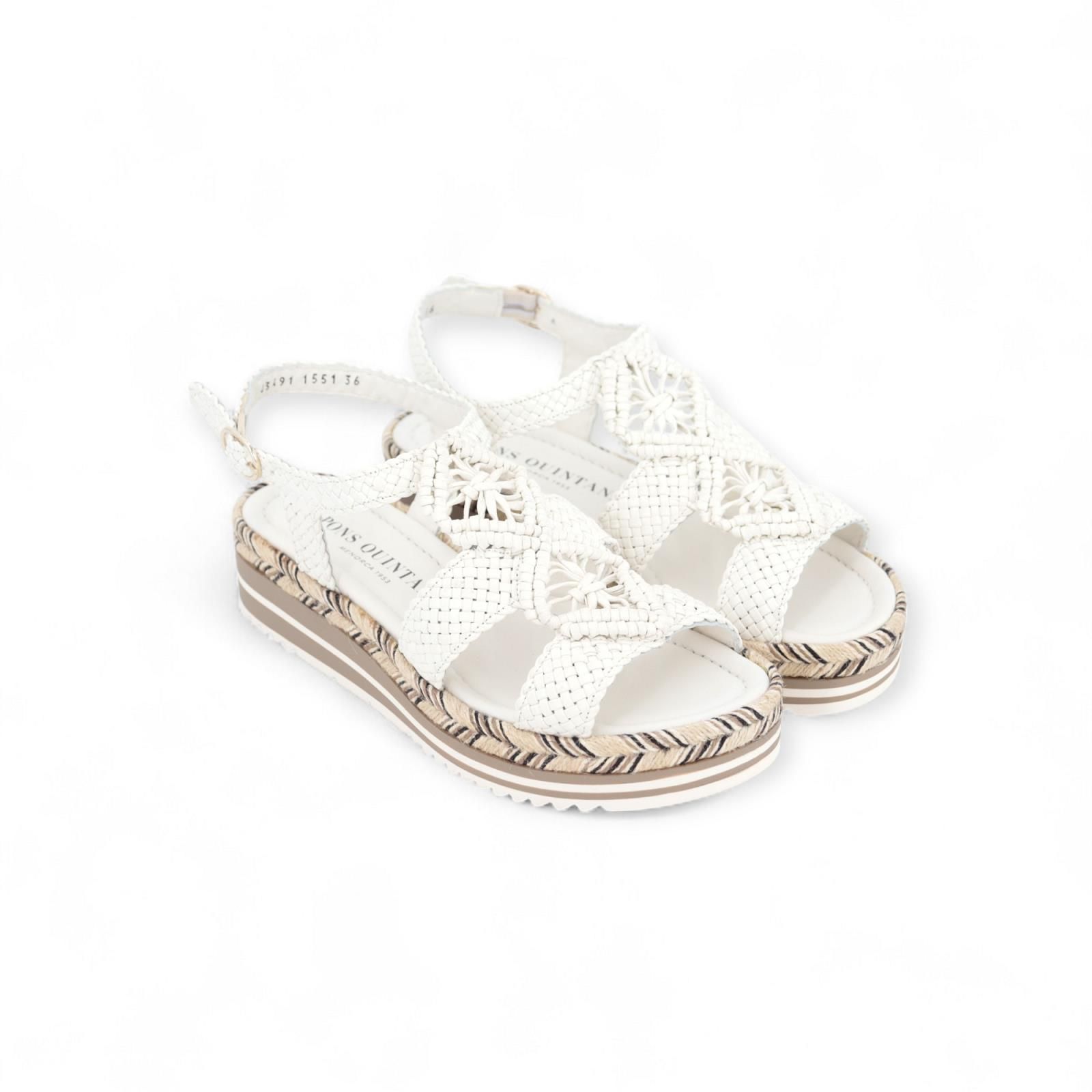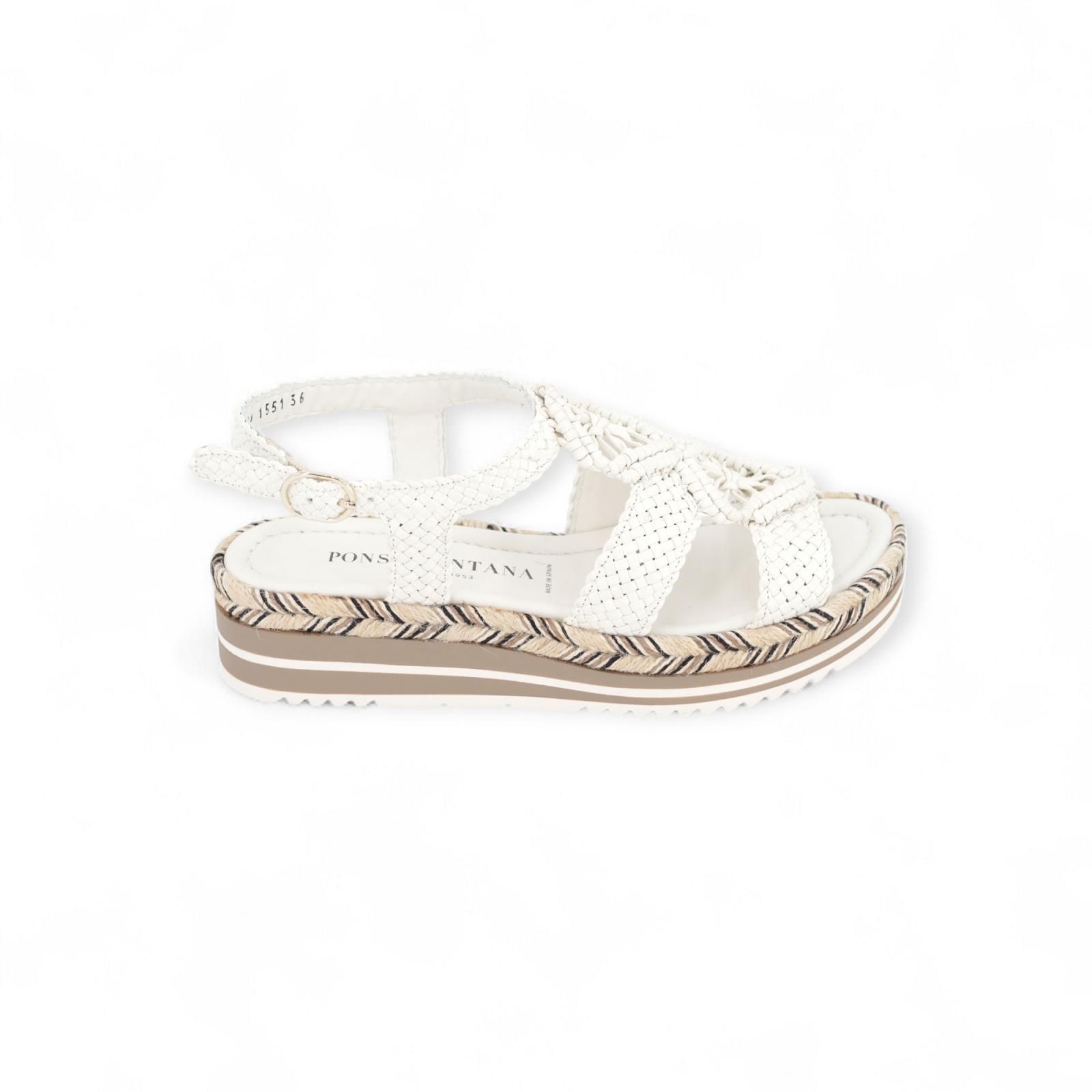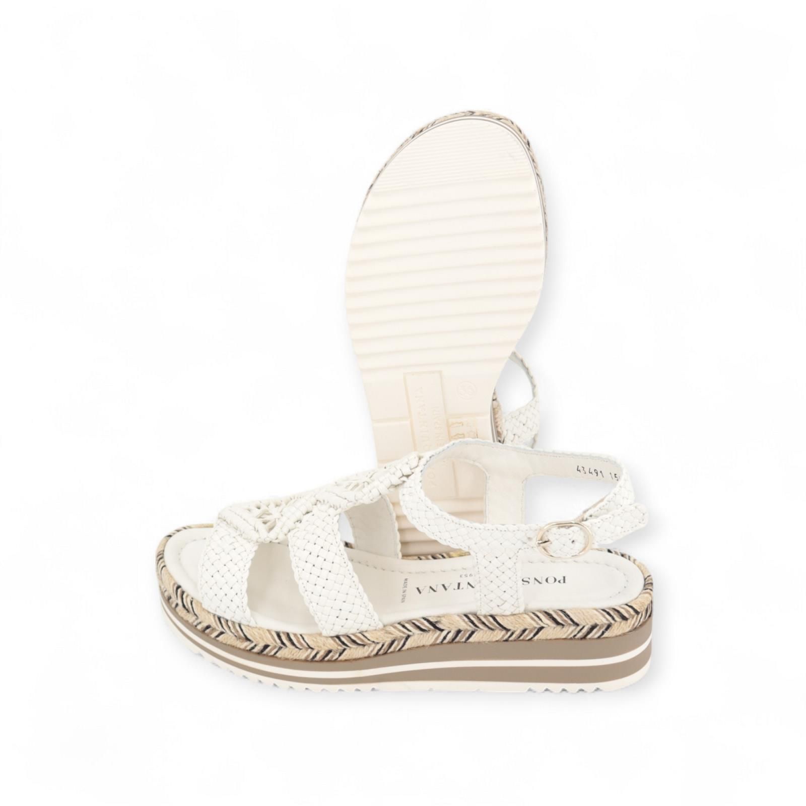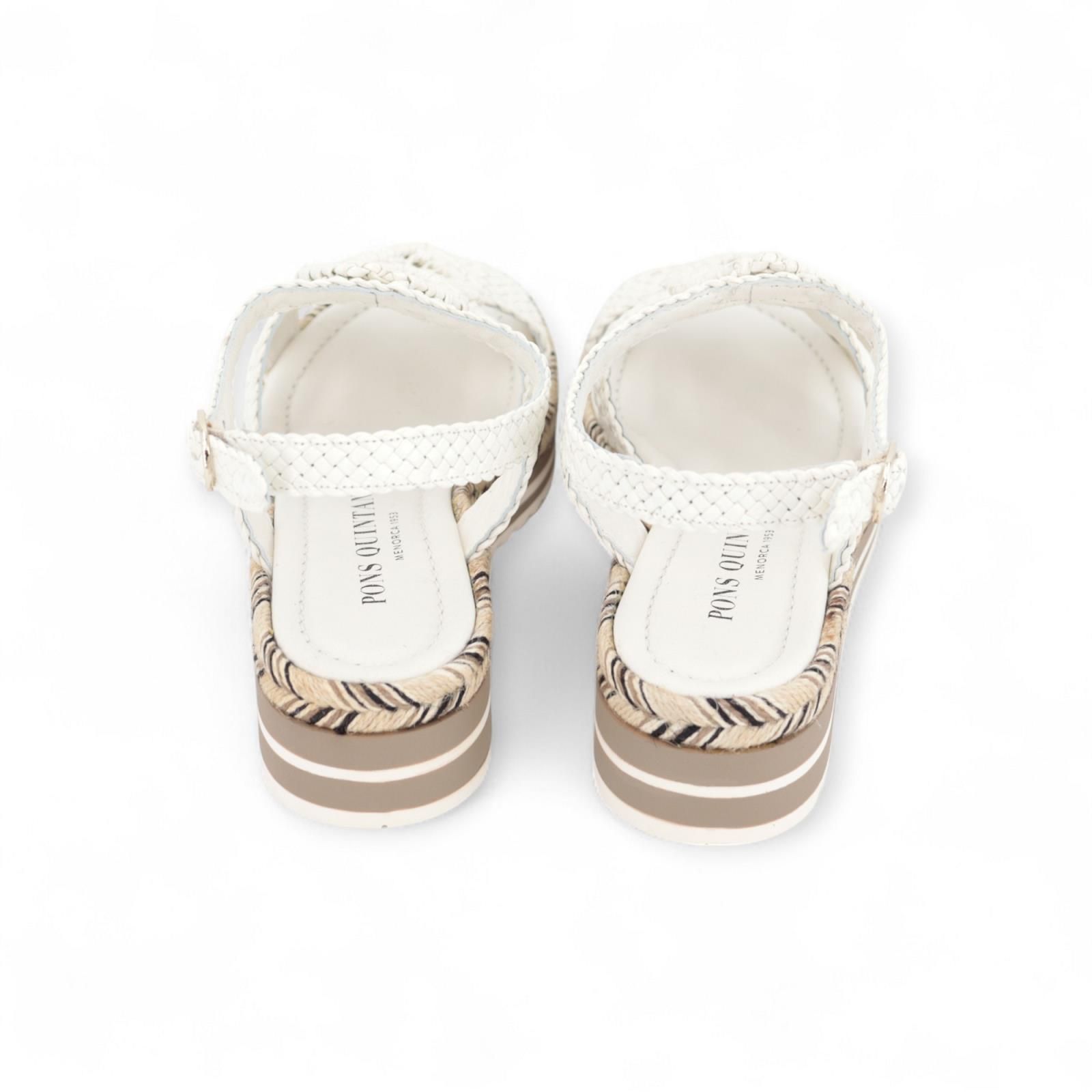 Pons Quintana Milan sandaal voor dames. Deze witte sandaal is prachtig afgewerkt in tressée en print in het vlechtwerk aan de wreef. Blijft mooi aan de voet door een gespsluiting aan de enkel. De zool is met lichte sleehak in taupe strepen met een geweven band in naturel.