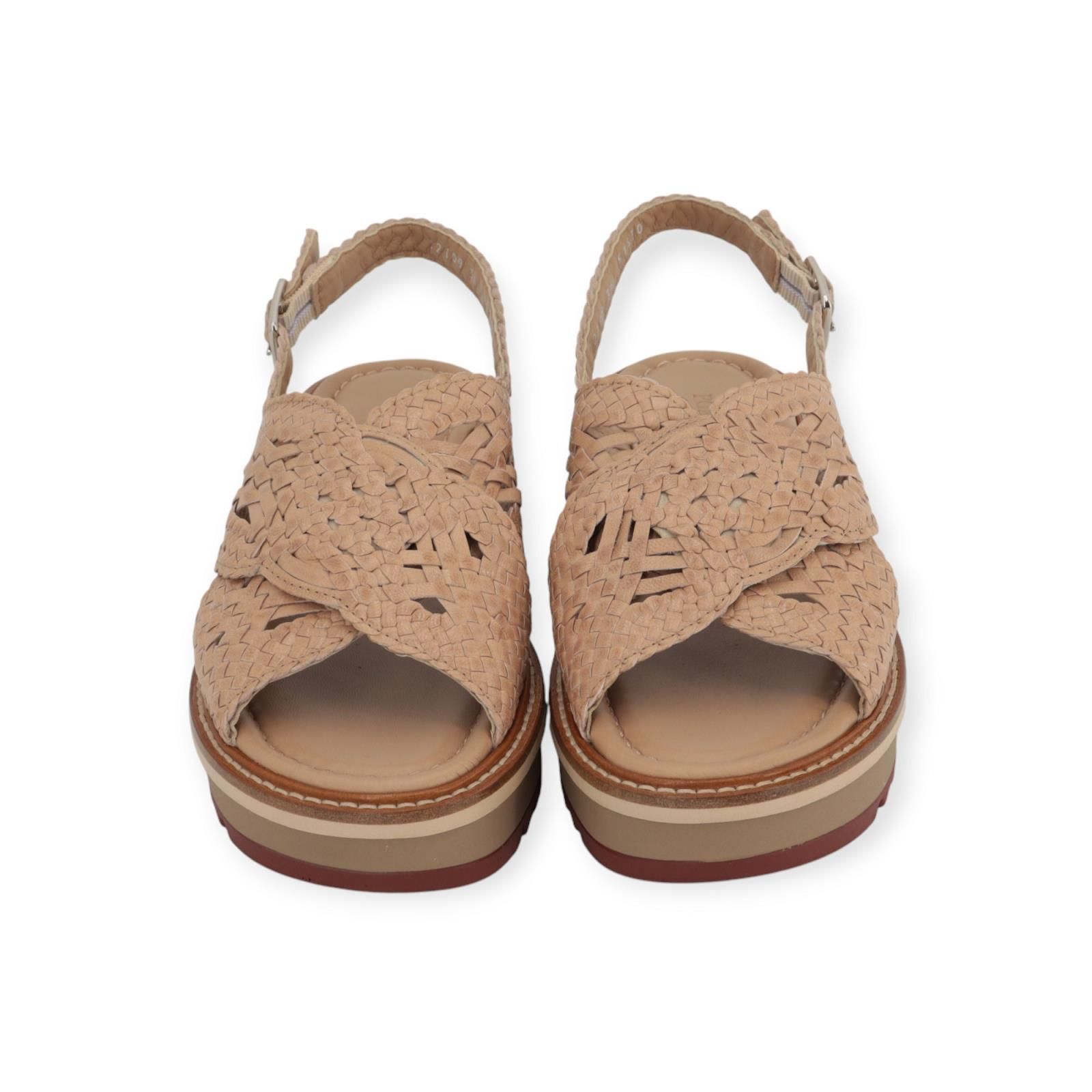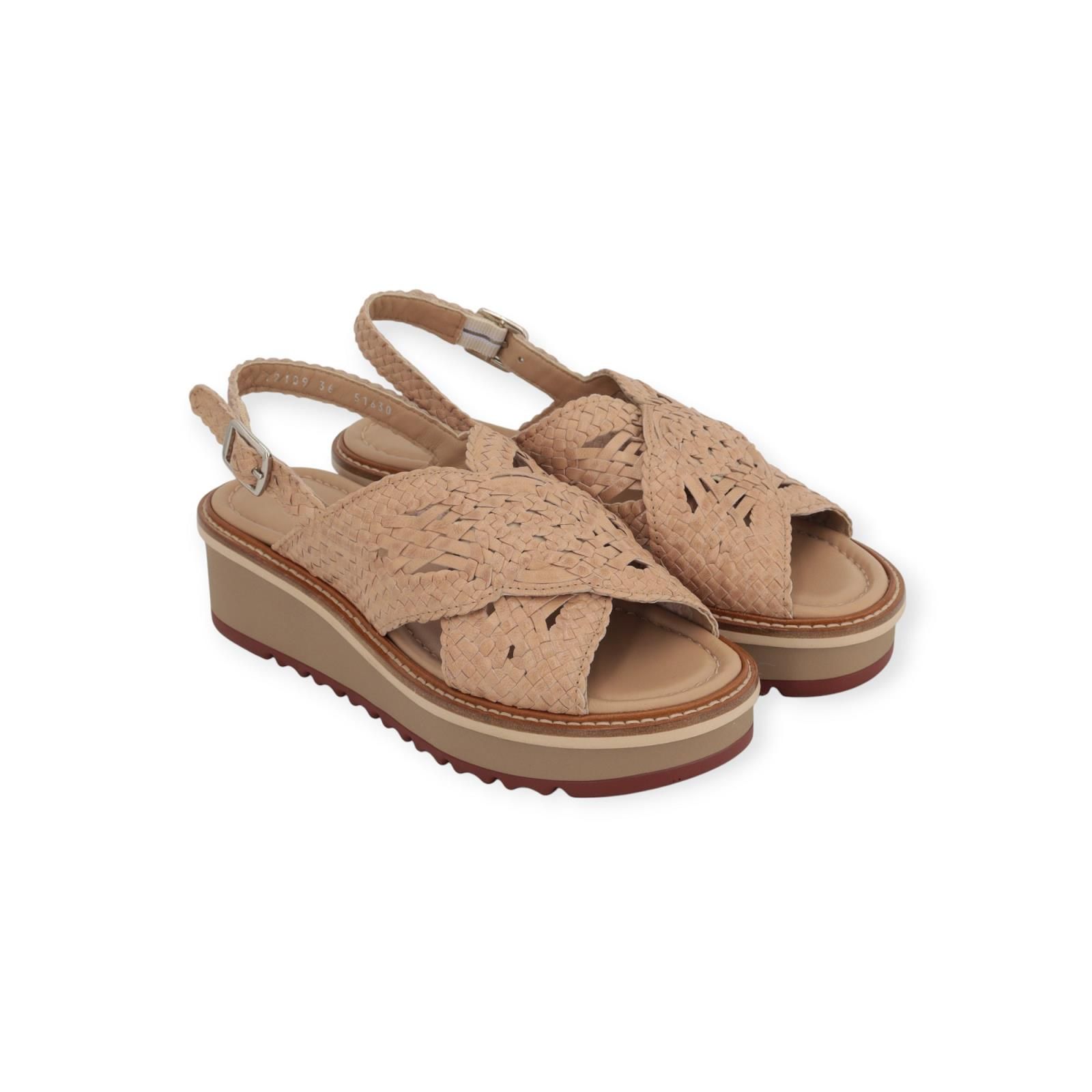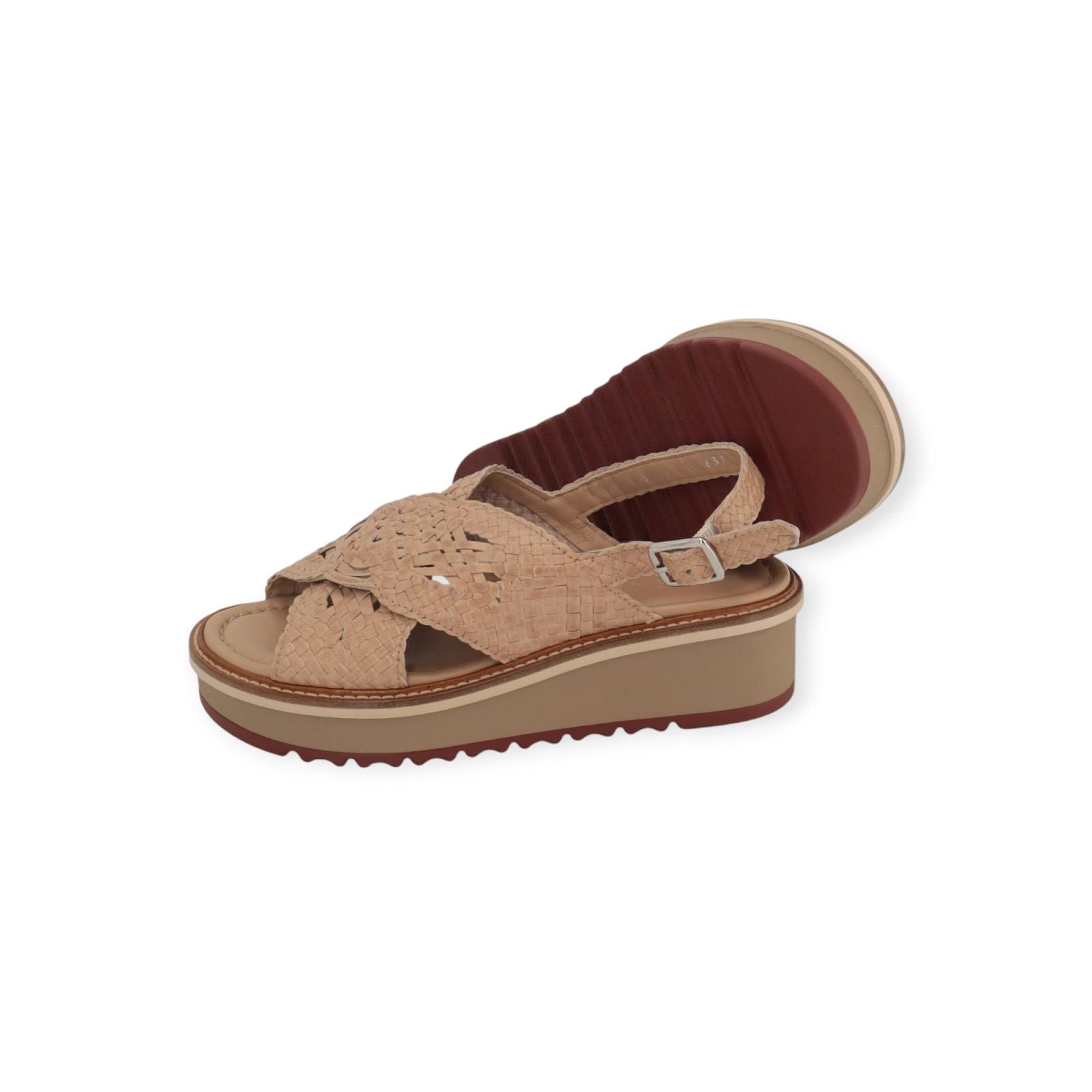 Sandaal Noemi van Pons Quintana voor dames. Deze sandaal is in taupe geweven tressée. Heeft 2 gekruiste banden over de wreef met een gespsluiting rond de hiel. Heeft een aangename sleehak van 3cm hoog, die afgewerkt is in bruin en rood. Pons Quintana is hét merk dat bekend staat voor hun subliem comfort en tressée stijl.