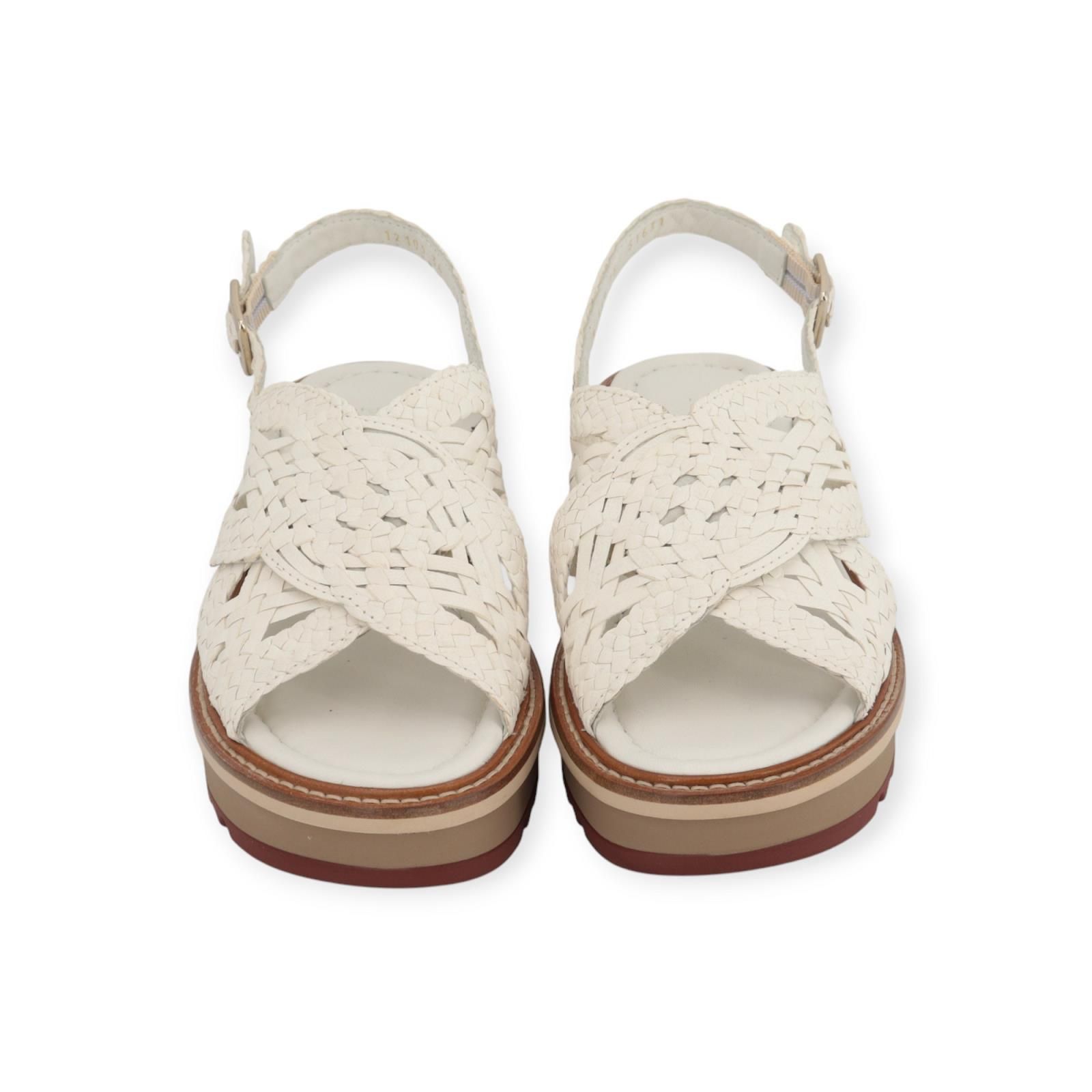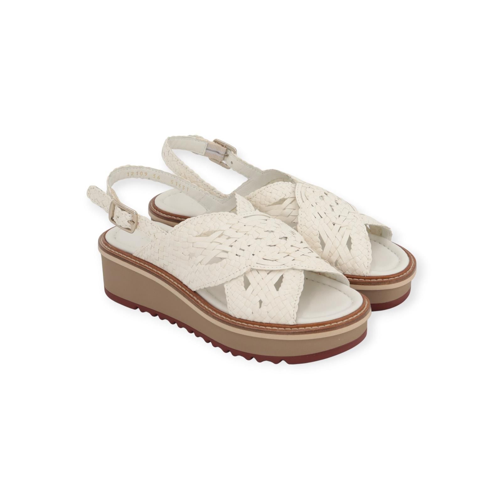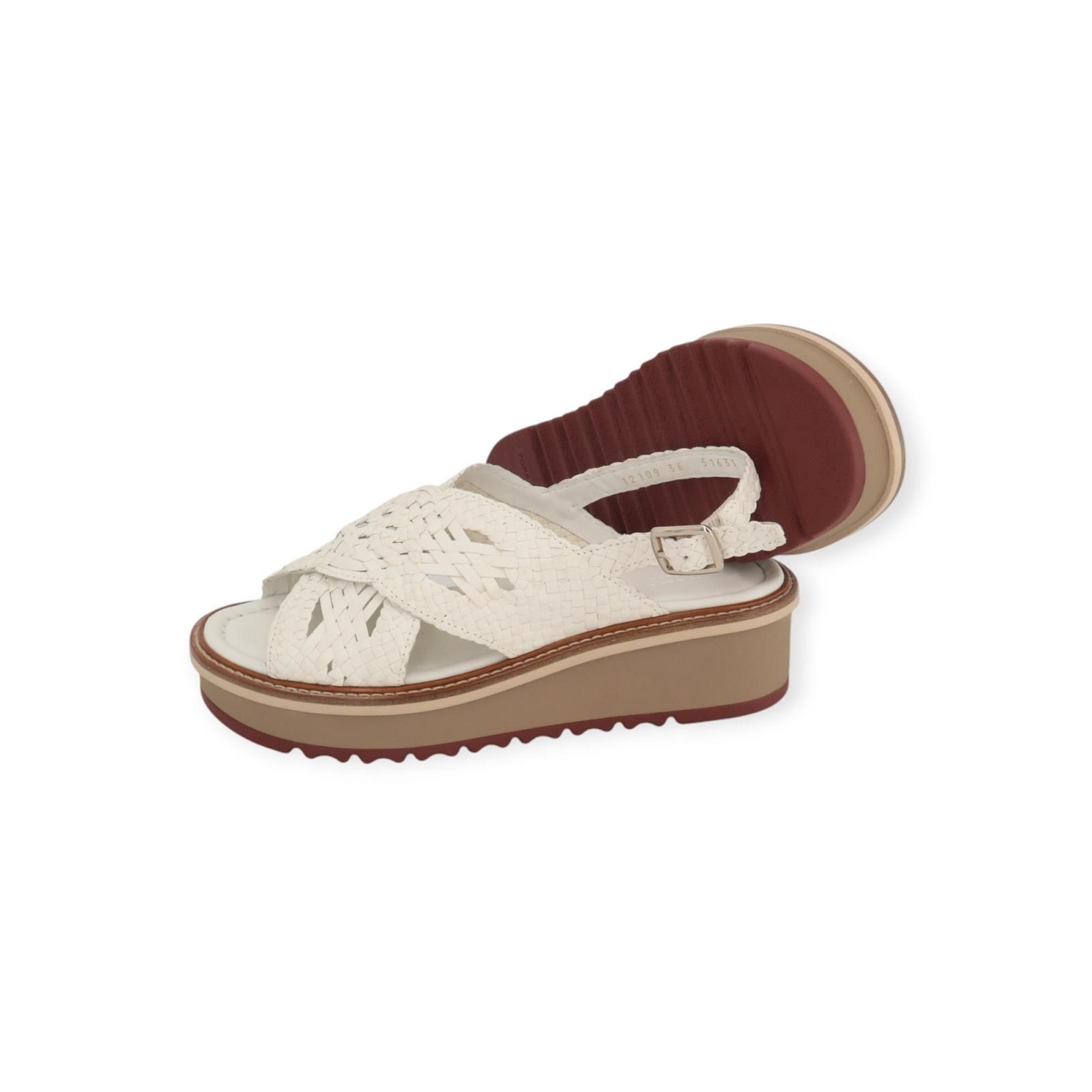 Sandaal Noemi van Pons Quintana voor dames. Deze sandaal is in wit geweven tressée. Heeft 2 gekruiste banden over de wreef met een gespsluiting rond de hiel. Heeft een aangename sleehak van 3cm hoog, die afgewerkt is in bruin en rood. Pons Quintana is hét merk dat bekend staat voor hun subliem comfort en tressée stijl.