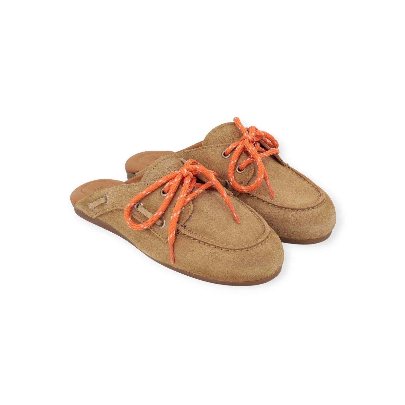 Muil Boatloafer van Posa voor dames. Deze muil is in beige suède met vetersluiting en veters aan de zijkant; De typische bootschoen stijl maar dan in slipper. Heeft een gesloten voorkant met een open hiel. Is super aangenaam en heeft een zachte zool. Combineer deze met de leuke oranje veters om het model nog zomerser en trendy te maken of met de bijgeleverde bruine leren veters.