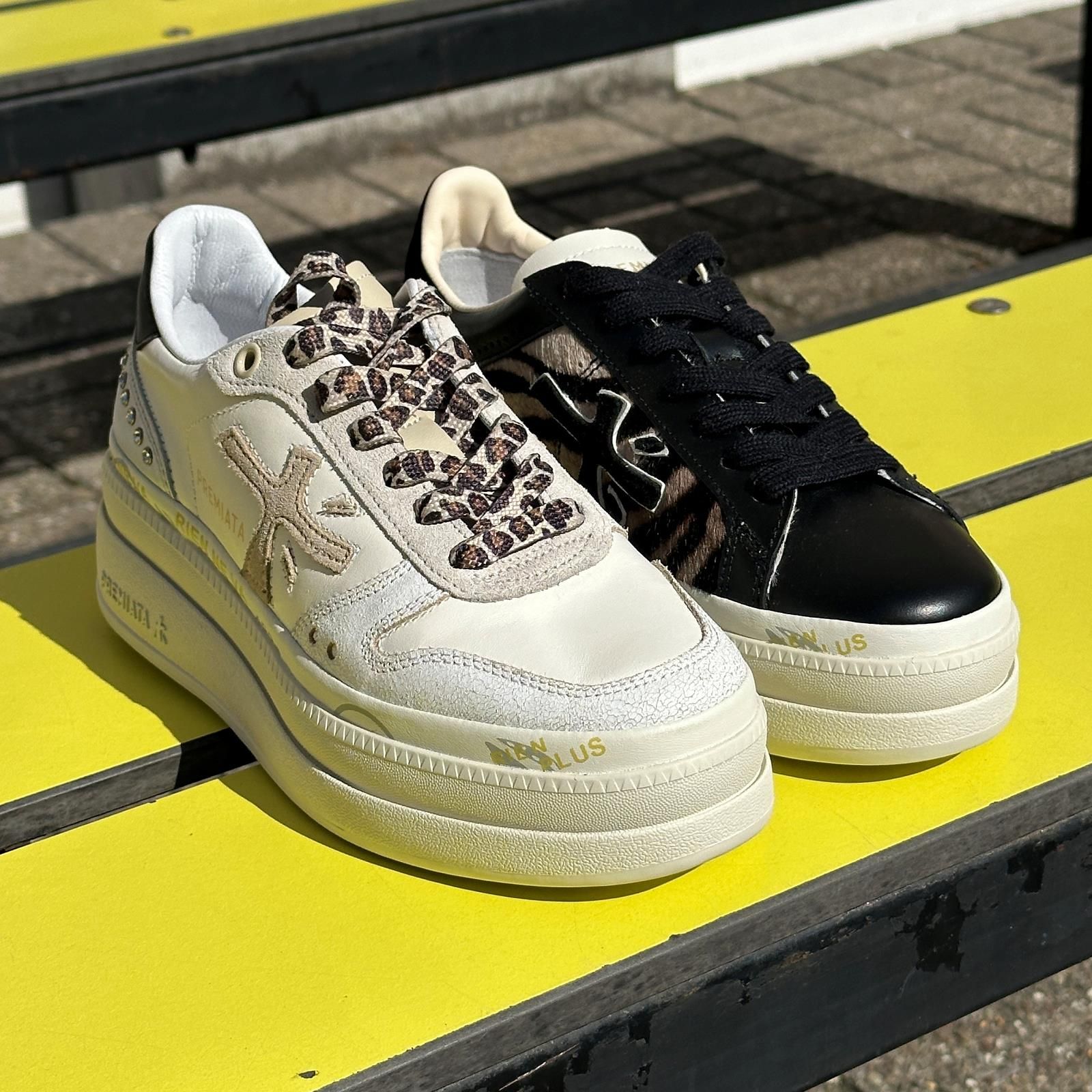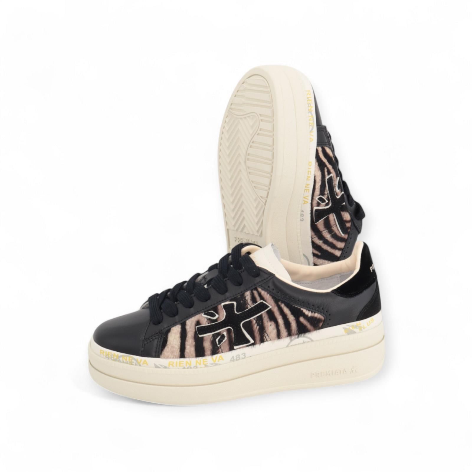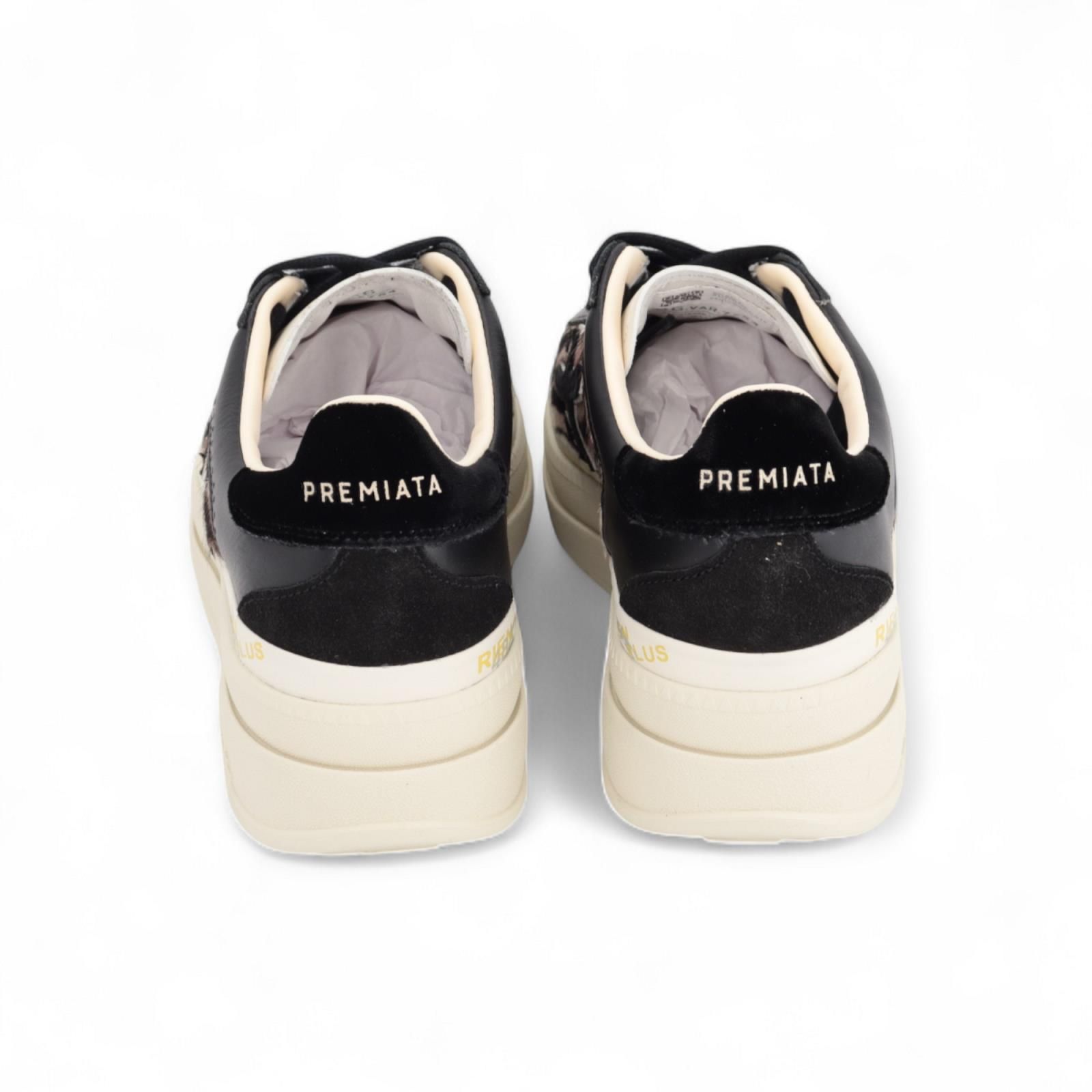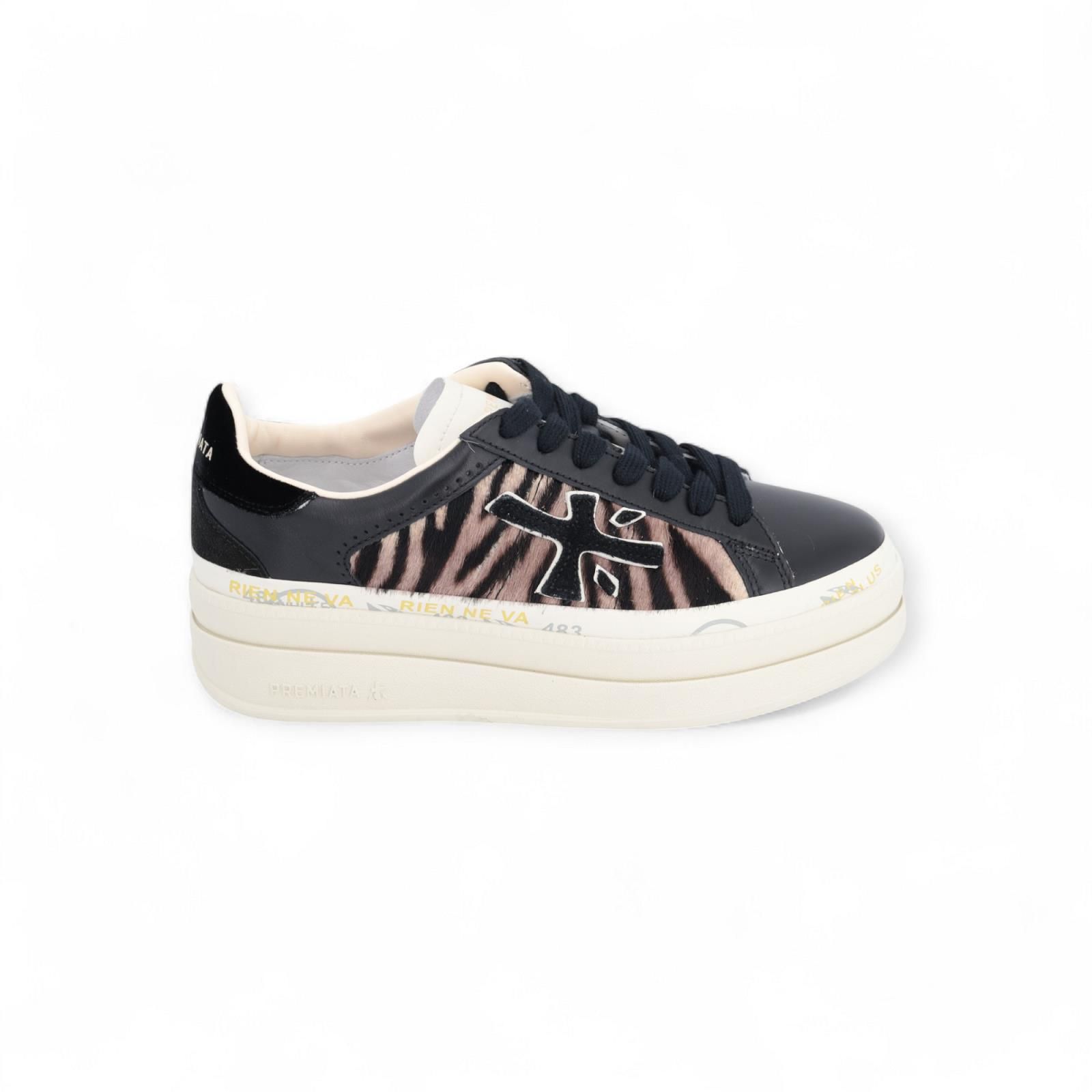 Sneaker Claudia var7754 van Premiata voor dames. Deze sneaker is in zwart leer met leopard print aan de zijkant met logo. Op de hielflap staan met gouden letters "Premiata" en de plateauzool is met iconische merkstempels. De binnenzool is uitneembaar. Een strak en veelzijdig model voor elke gelegenheid.