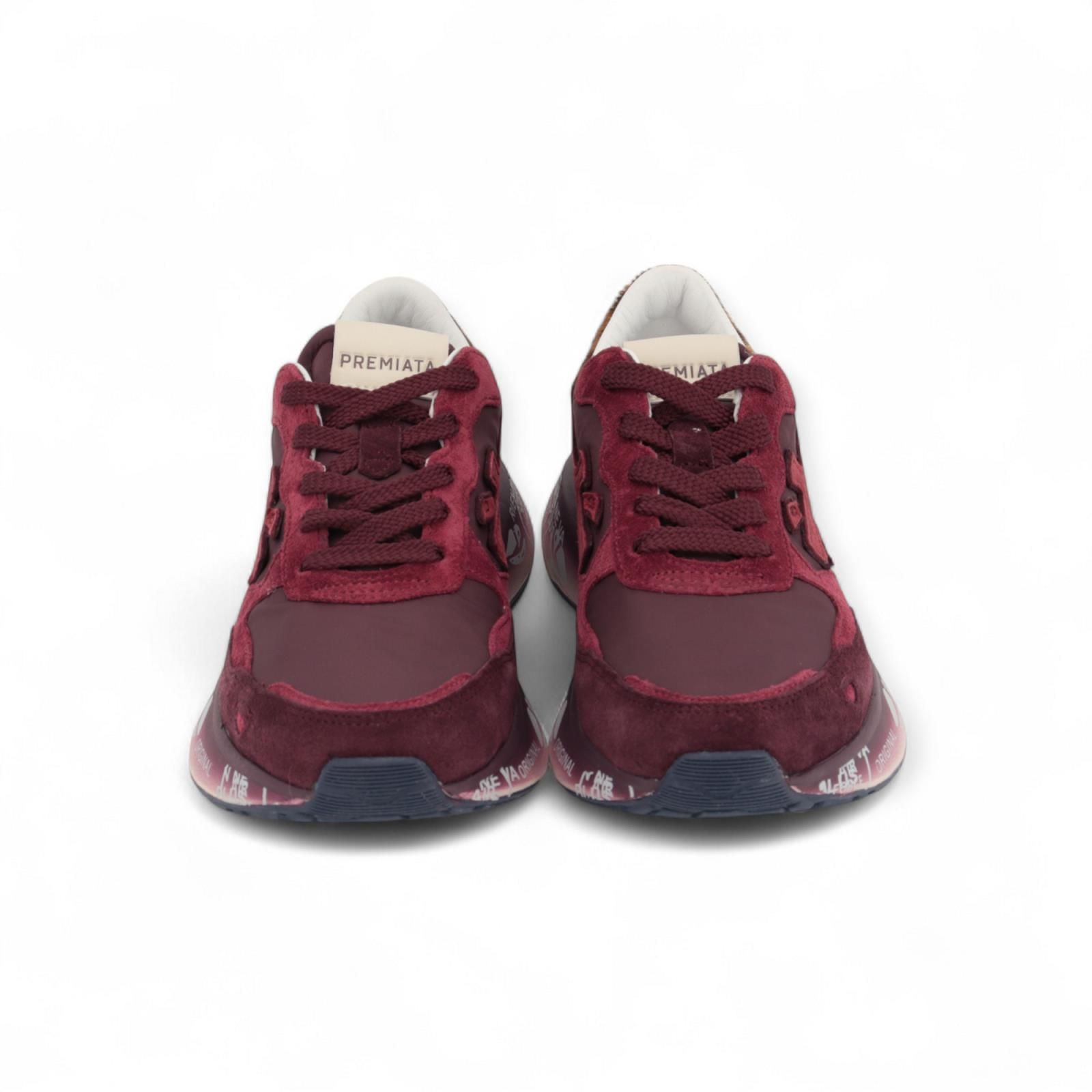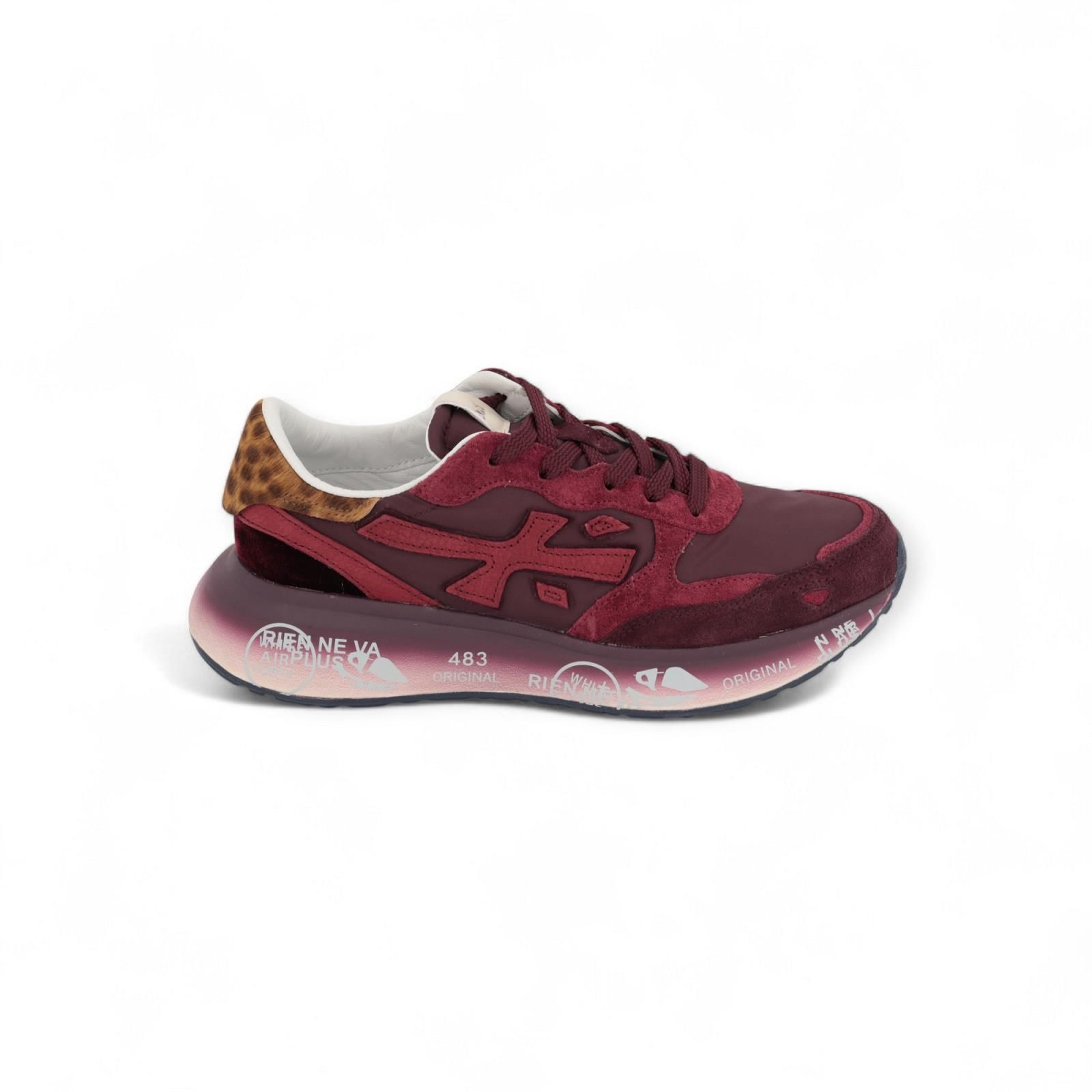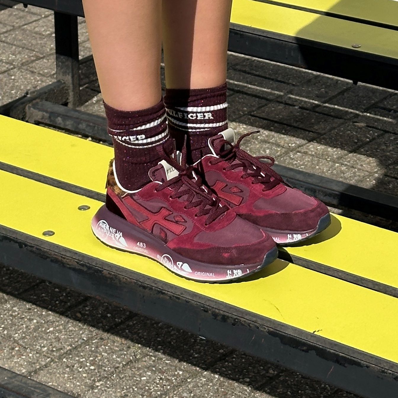 Sneaker Lauryn van Premiata voor dames. Deze sneaker is in bordeaux suède en nylon met aan de zijkant het logo in leer. Als extra eyecatcher is de hielflap in leopard vel. De zool is versterkt door de iconische stijldetails van Premiata en heeft een uitneembare binnenzool.