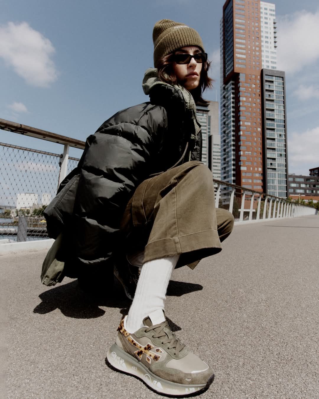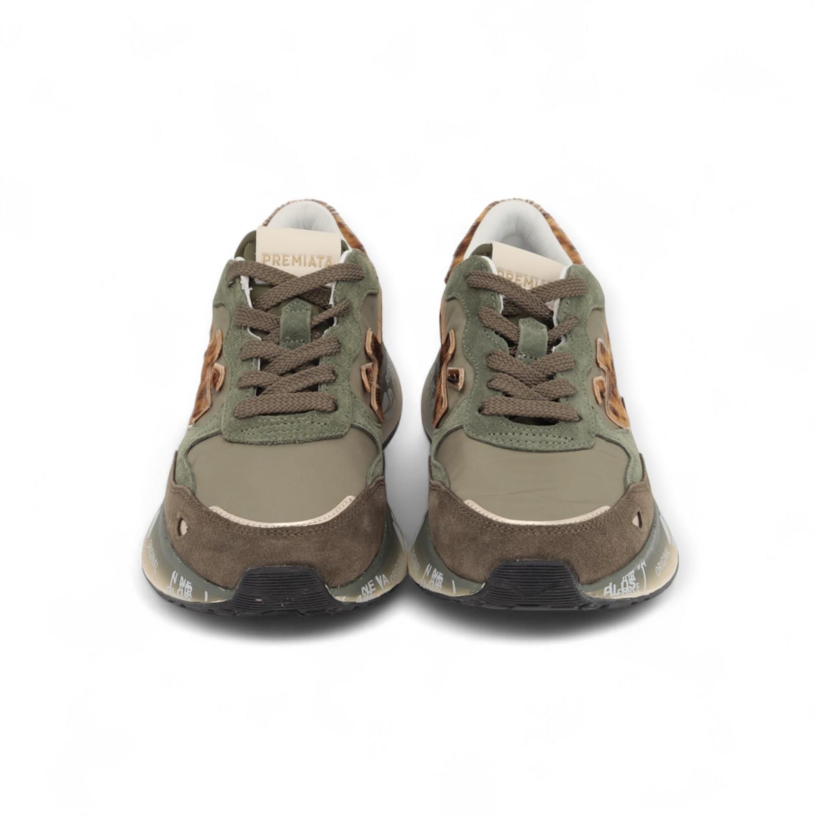 Sneaker Lauryn van Premiata voor dames. Deze sneaker is in kaki suède en nylon met aan de zijkant het logo alsook de hielflap in leopard vel. De zool is versterkt door de iconische stijldetails van Premiata en heeft een uitneembare binnenzool.