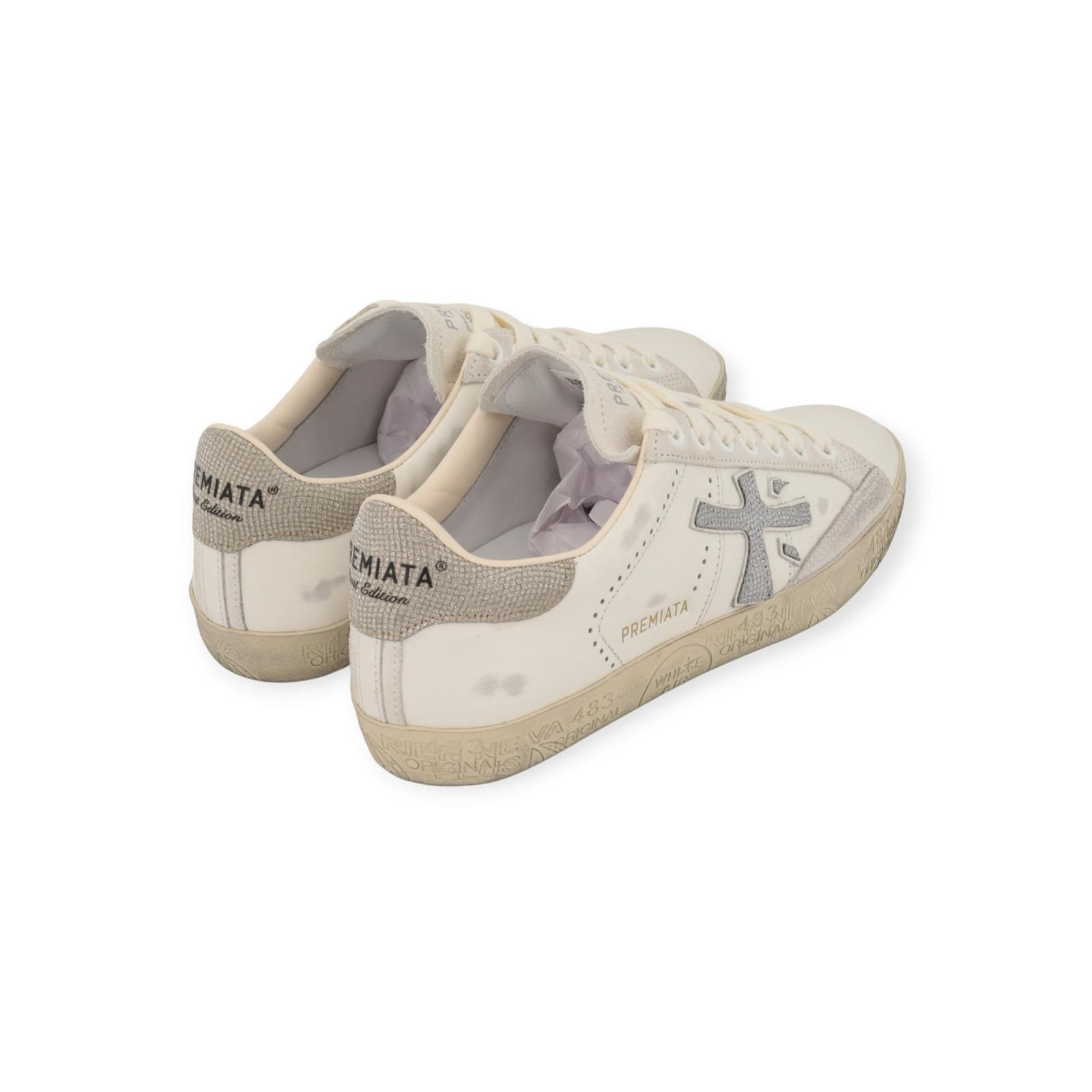 Sneaker Stevend van Premiata voor dames. Deze lage sneaker is in offwit leer met zgouden accenten aan de hielflap en zilver in logo. Is afgewerkt met geperforeerde stiksels en ‘versleten look’ stukken. De buitenzool is versterkt met iconische stijldetails van Premiata. Voelt zeer licht aan en de binnenzool is uitneembaar. Deze Stevend sneakers zijn perfect om een jeugdige stijl compleet te maken. Ze vallen op door hun verfijnde details en eigentijdse design.