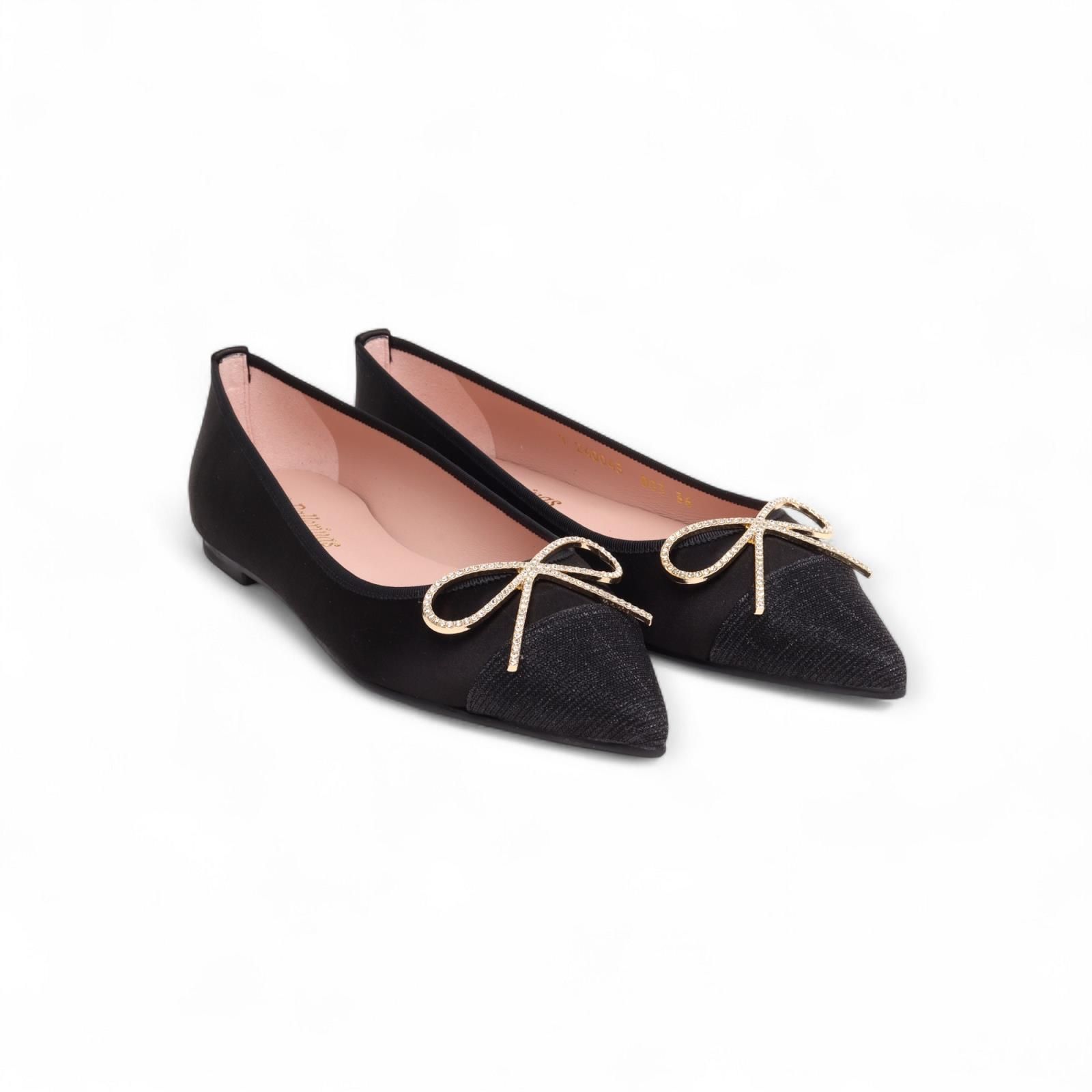 Ballerina Ella van Pretty Ballerinas voor dames. Dit model is in zacht zwart suède. Is met een puntige neus in zwarte satijnlook met kristallen bedekte strik. Heeft een antislip zooltje.