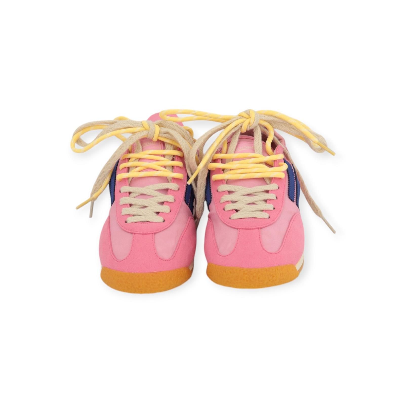 Sneaker Panther van Puraai voor dames. Deze sneaker is in roze micro suède met lichtroze nylon. Is mooi afgewerkt met blauw eco-leer Puraai logo aan de zijkant. Heeft een lichte 2kleurige (geel en offwit) runnerzool met een uitneembare binnenzool. Combineer deze met de gele veters of de offwit veters. Of draag ze samen.
