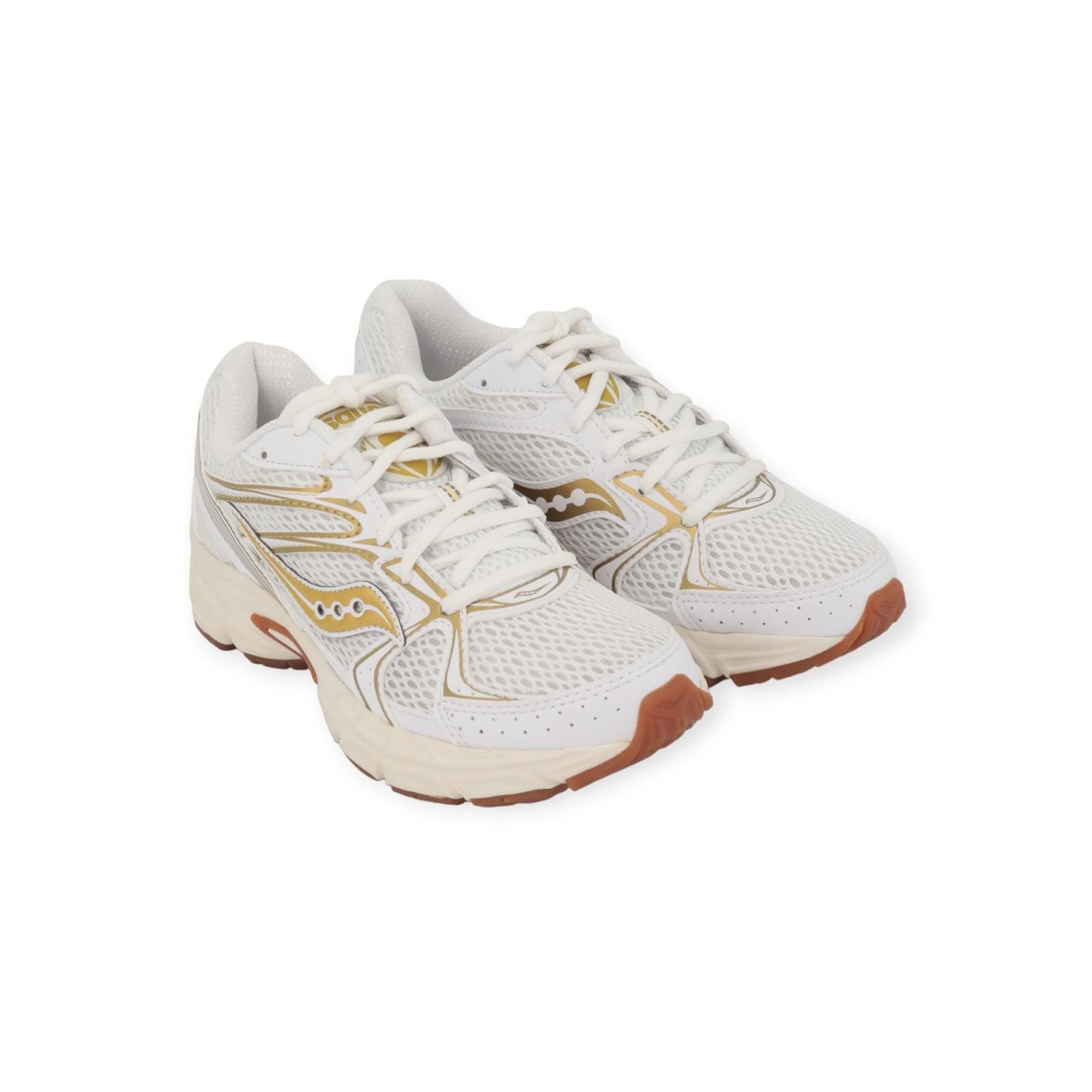 Sneaker Ride Millennium van Saucony voor dames. Deze runner is in wit leer met goud / brons metallic en zachte mesh. De ‘Grid’, rasterdemping zorgt voor aangenaam comfort en de binnenzool is uitneembaar. De Ride Millenium is de nieuwe alledaagse sneaker van Saucony. Combineert de energie en iconische details van hun klassieke modellen.
