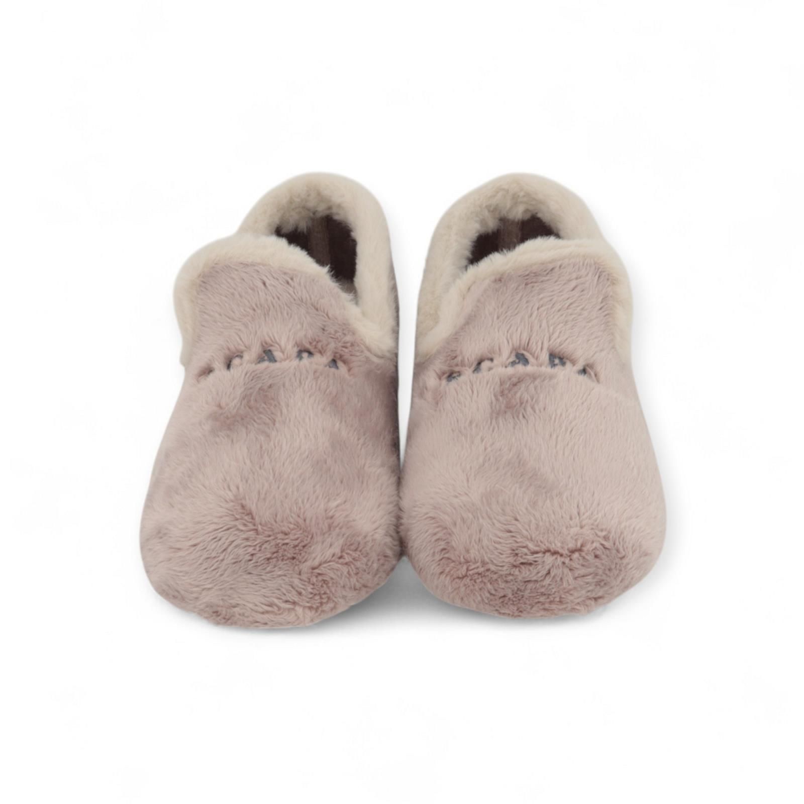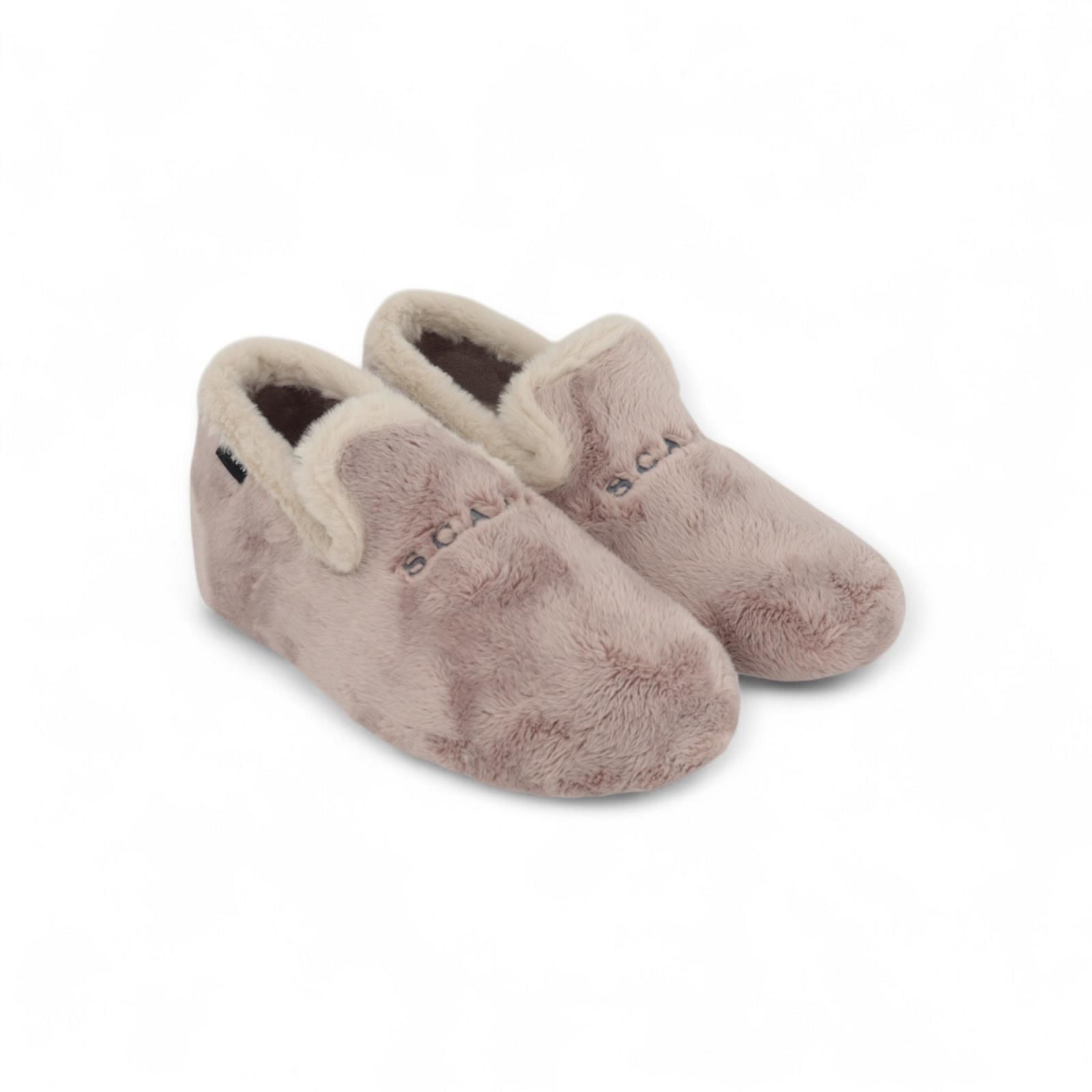 Pantoffel van Scapa voor dames. Dit model is helemaal toe en is in taupe synthetische wol. Afgewerkt een witte boord en logo op de voorvoet. Is binnenin in stof en heeft een antislipzool.