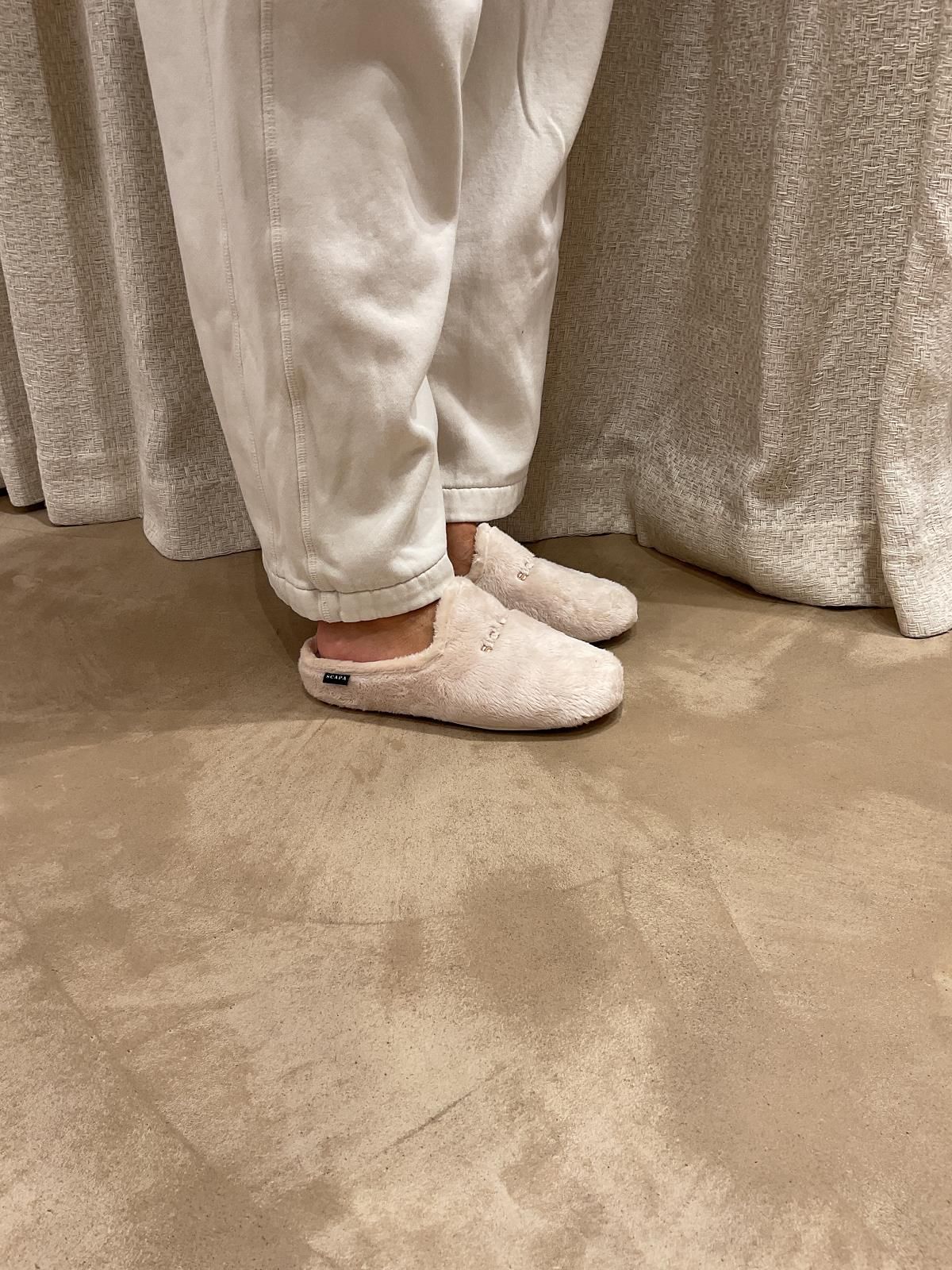 Pantoffel van Scapa voor dames. Deze pantoffel is in off wit stof. Is op een antislipzool.