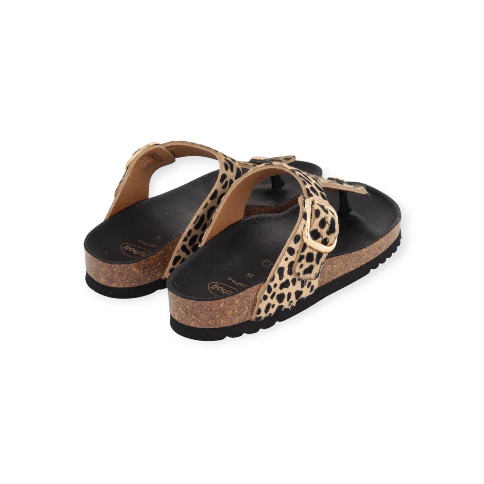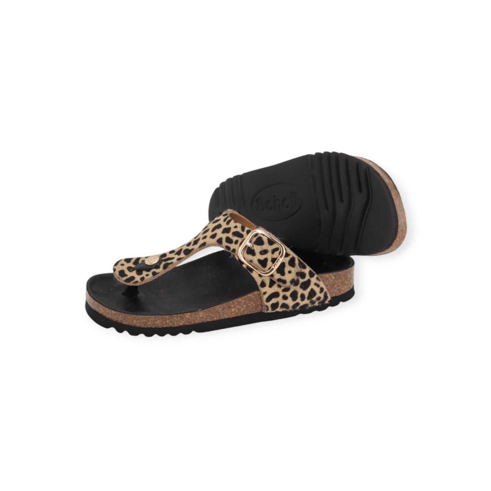 Slipper Anais van Scholl voor dames. Deze slipper is in leopard pony tussen de tenen. Heeft een speciale vorm in het voetbooggedeelte dat zeer comfortabel helpt uw gewicht te ondersteunen bij elke stap. Heeft een aangenaam zwart voetbed in leer met een donkere antislipzool.