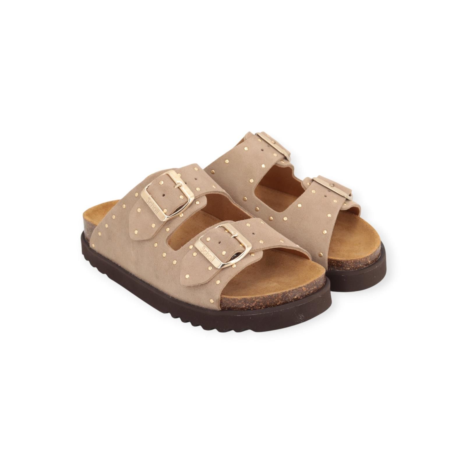 Slipper Beatriz van Scholl voor dames. Deze slipper is in beige suède met kleine studs. Dankzij de twee banden met een klassieke Scholl-gesp is de schoen verstelbaar voor optimaal comfort. Heeft een speciale vorm in het voetbooggedeelte dat zeer comfortabel helpt uw gewicht te ondersteunen bij elke stap. Dit model is dé must-have van de zomer.