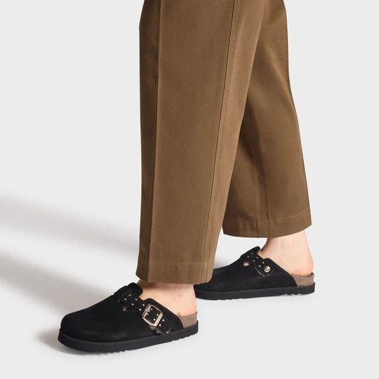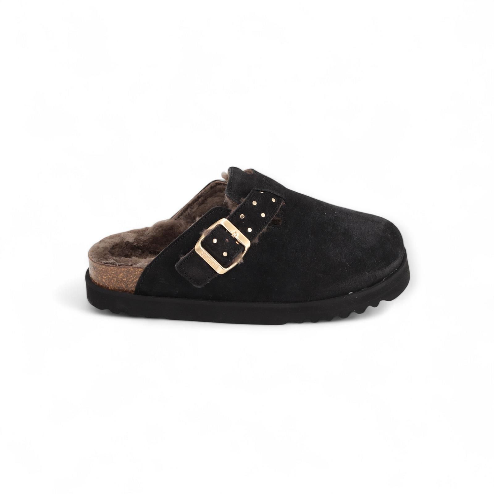 Slipper Benny van Scholl voor dames. Deze slippers in zwart suède zijn de perfecte combinatie van mode en functionaltieit. De met pels gevoerde slippers hebben een chic design en zijn mooi afgewerkt met studs. Ze zijn verstelbaar dankzij de gespsluiting en bieden de hele dag comfort en warmte. Is op een vaste dikke antislipzool.